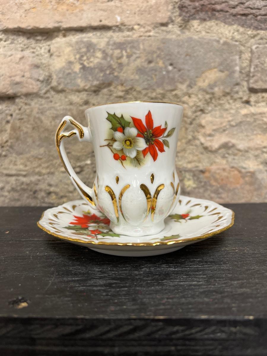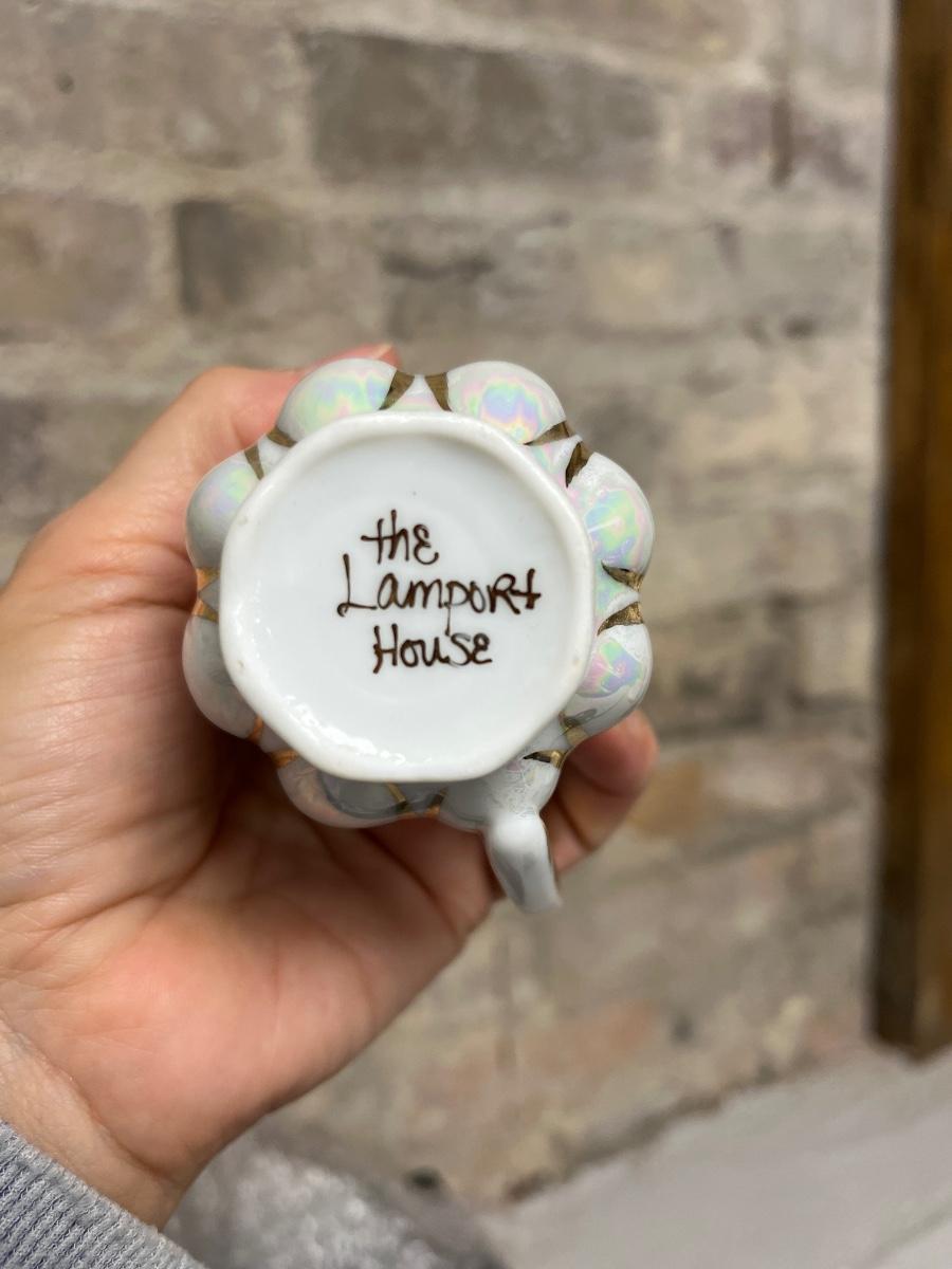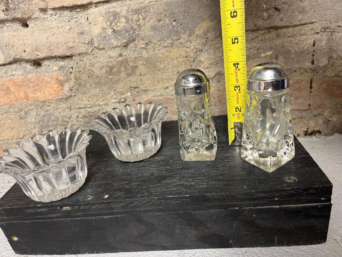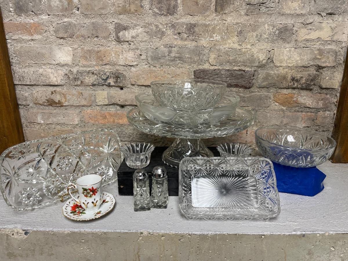 Lots of Anchor Hocking pressed glass, some votives, set of salt & pepper shakers. Little Lamport House teacup & saucer. Cup has a little chip