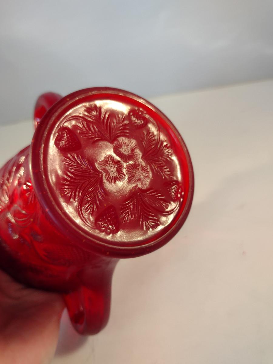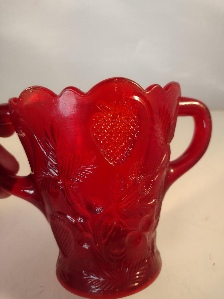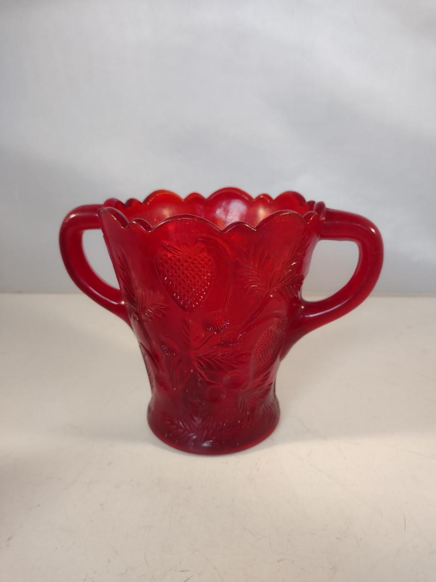 Pressed Strawberry Design Ruby Red Glass Vase with Double Handles- Approx 5" Tall