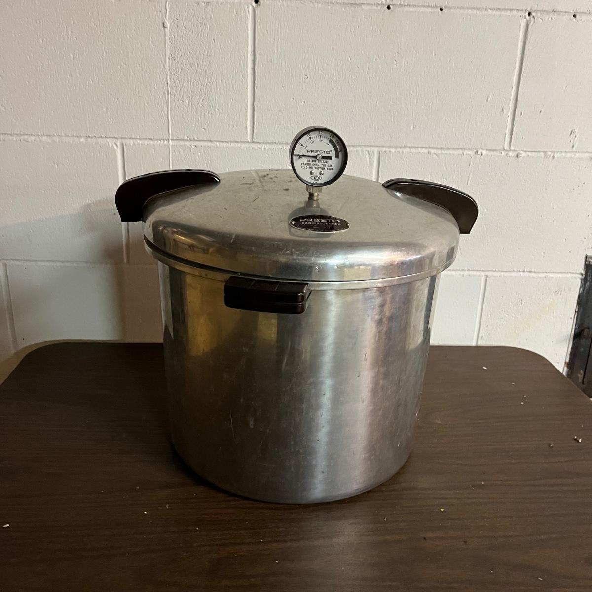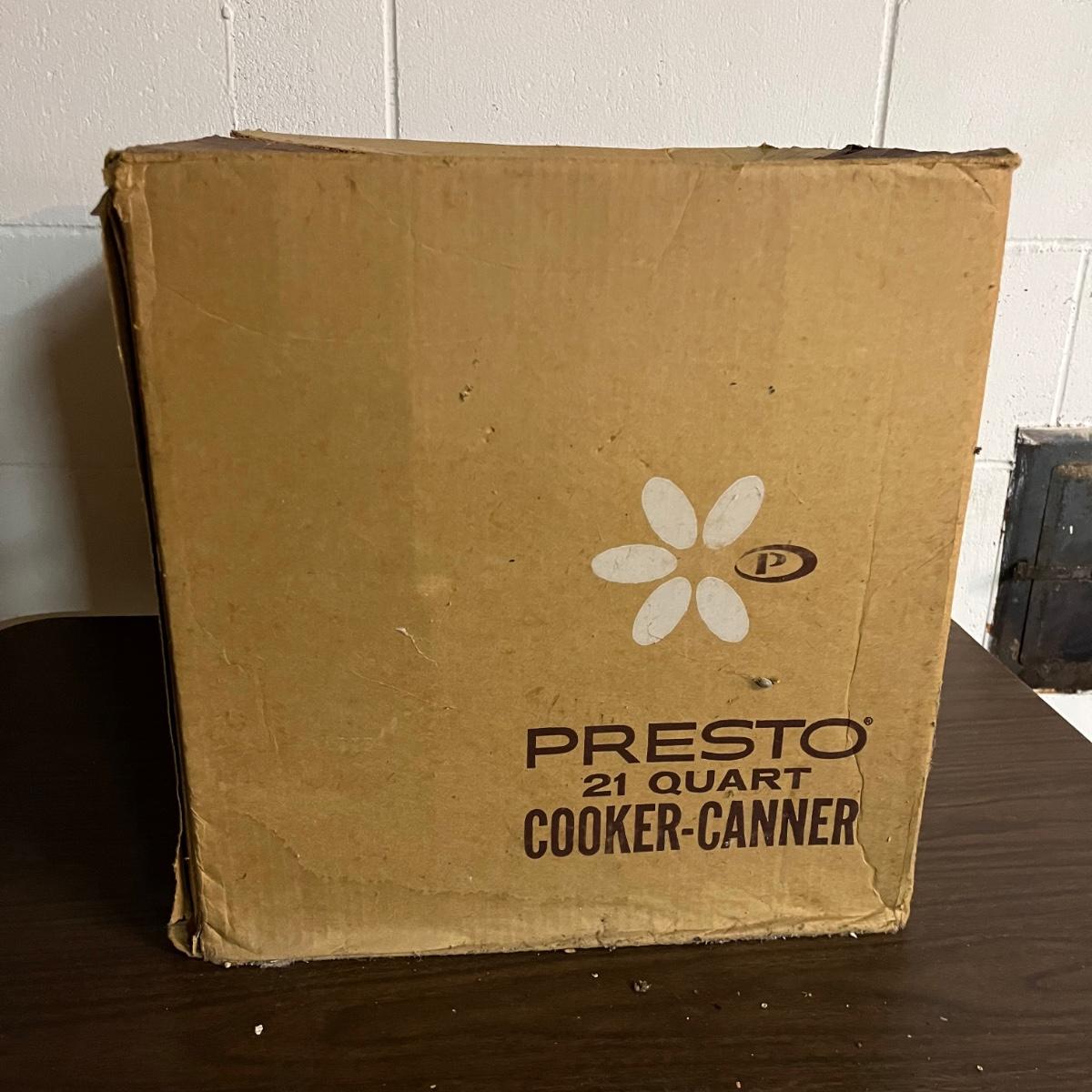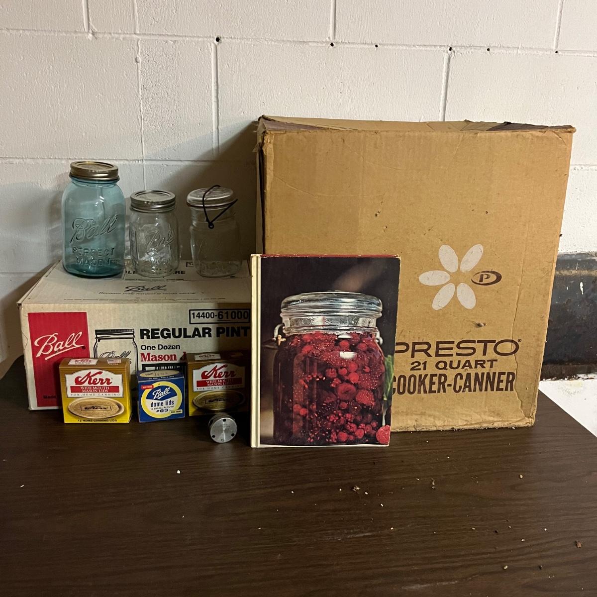 Lot includes a Presto 21 qt cooker/canner with twelve ball jars, book on canning and lids.