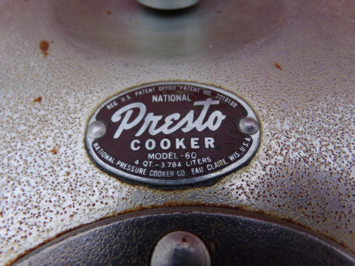 PRESTO Cooker model 60, smaller 4 qt. pressure cooker, Heavy cast aluminum. For fast cooking of food. Just 8" diameter inside & about 5" deep inside to rim w/o lid. Might hold a few pint jars for canning if your so inclined.