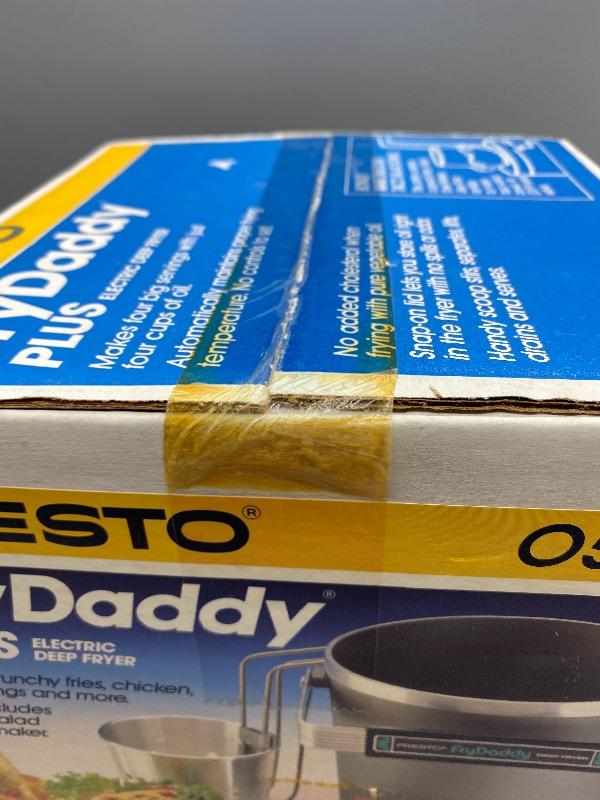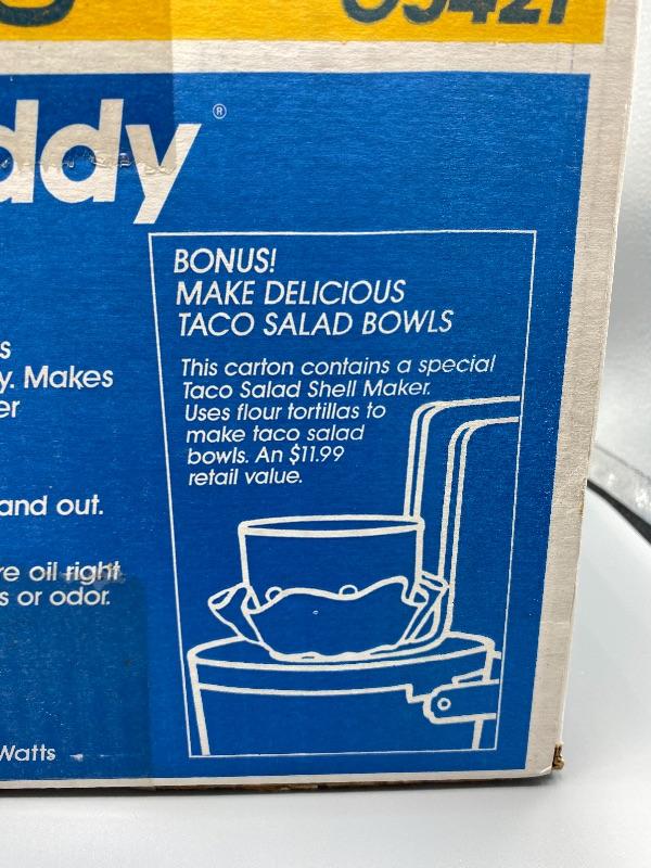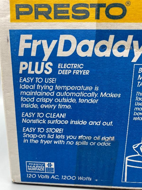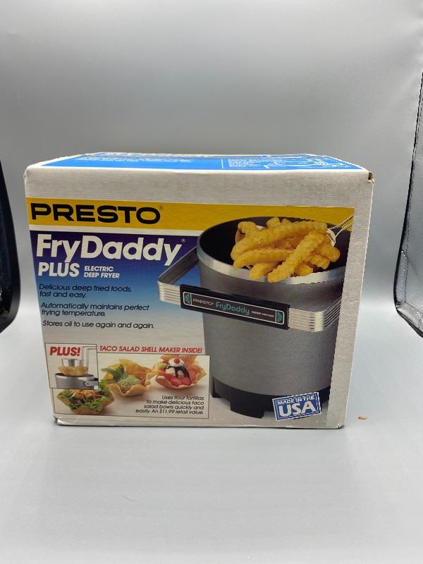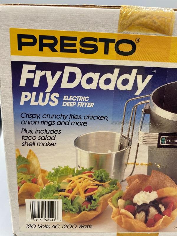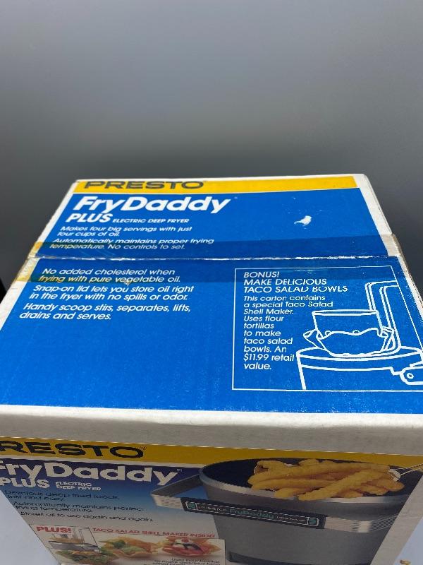 New in box, Presto FryDaddy Plus. Box is still sealed. Small size deep fryer. Electric. Comes with a taco salad shell maker.