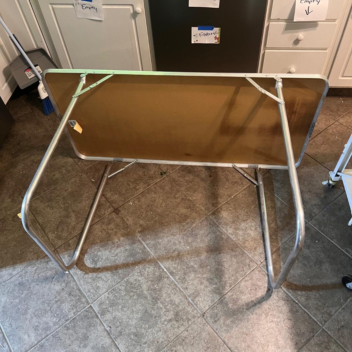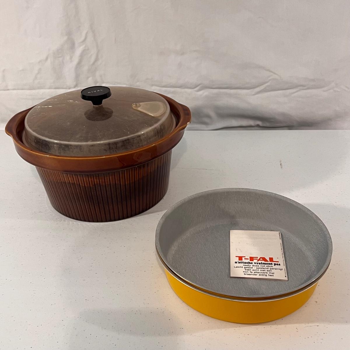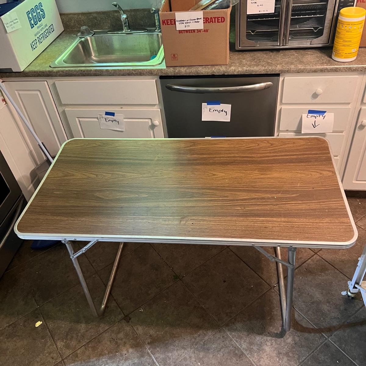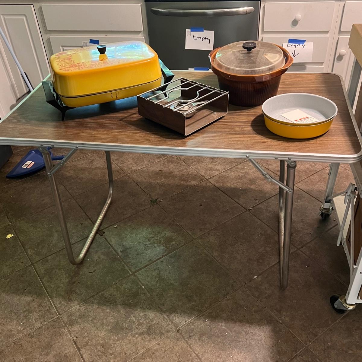 Lot includes one collapsible table, one Presto electric griddle with lid, two T-FAL yellow bakeware, one crock pot ceramic insert, and what appears to be one small camp stove. The table measures 24” x 48”H. The Presto powered on when plugged in. Local pickup only.
