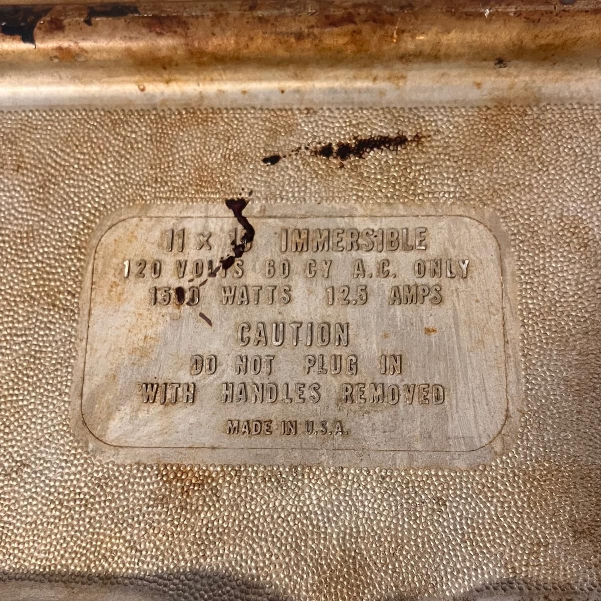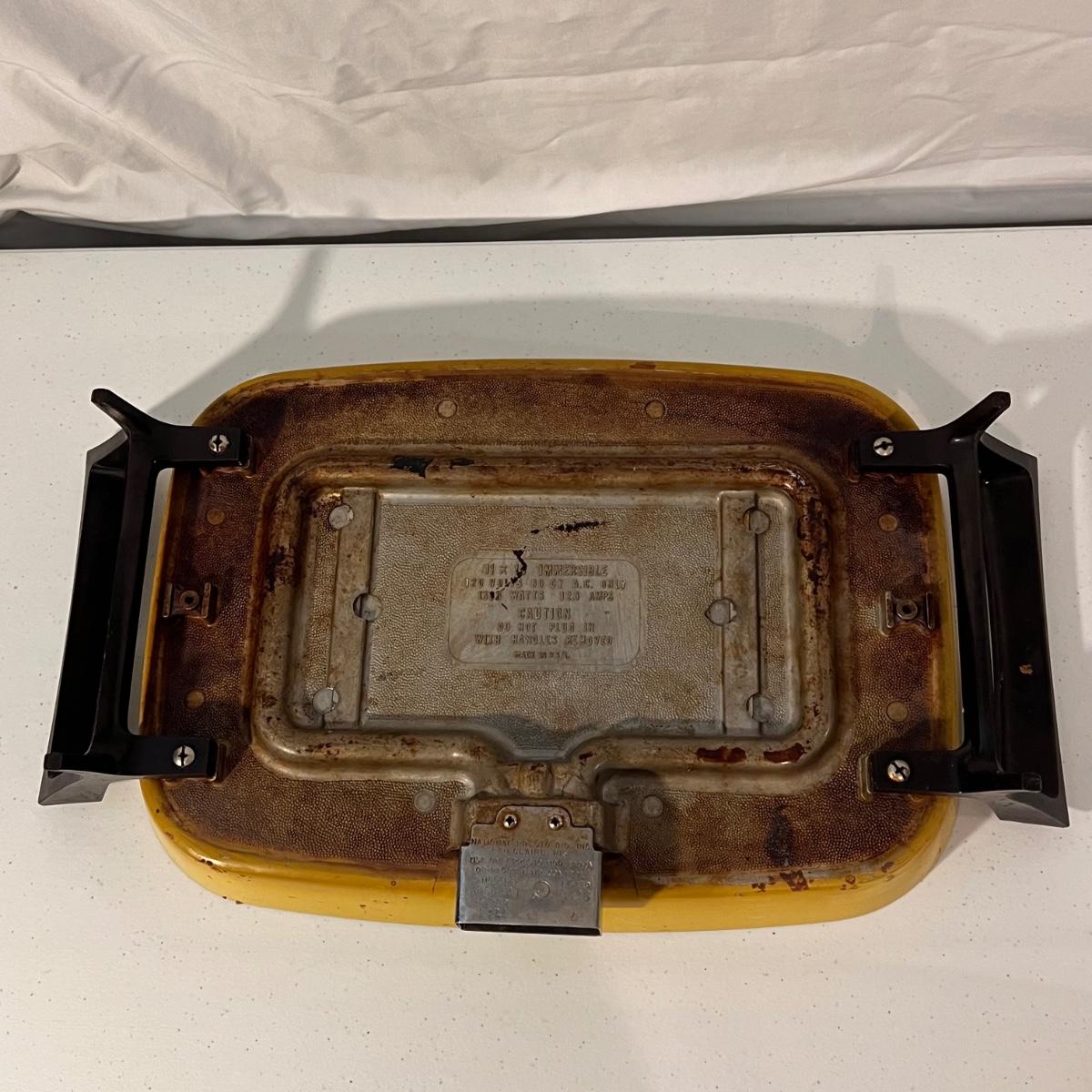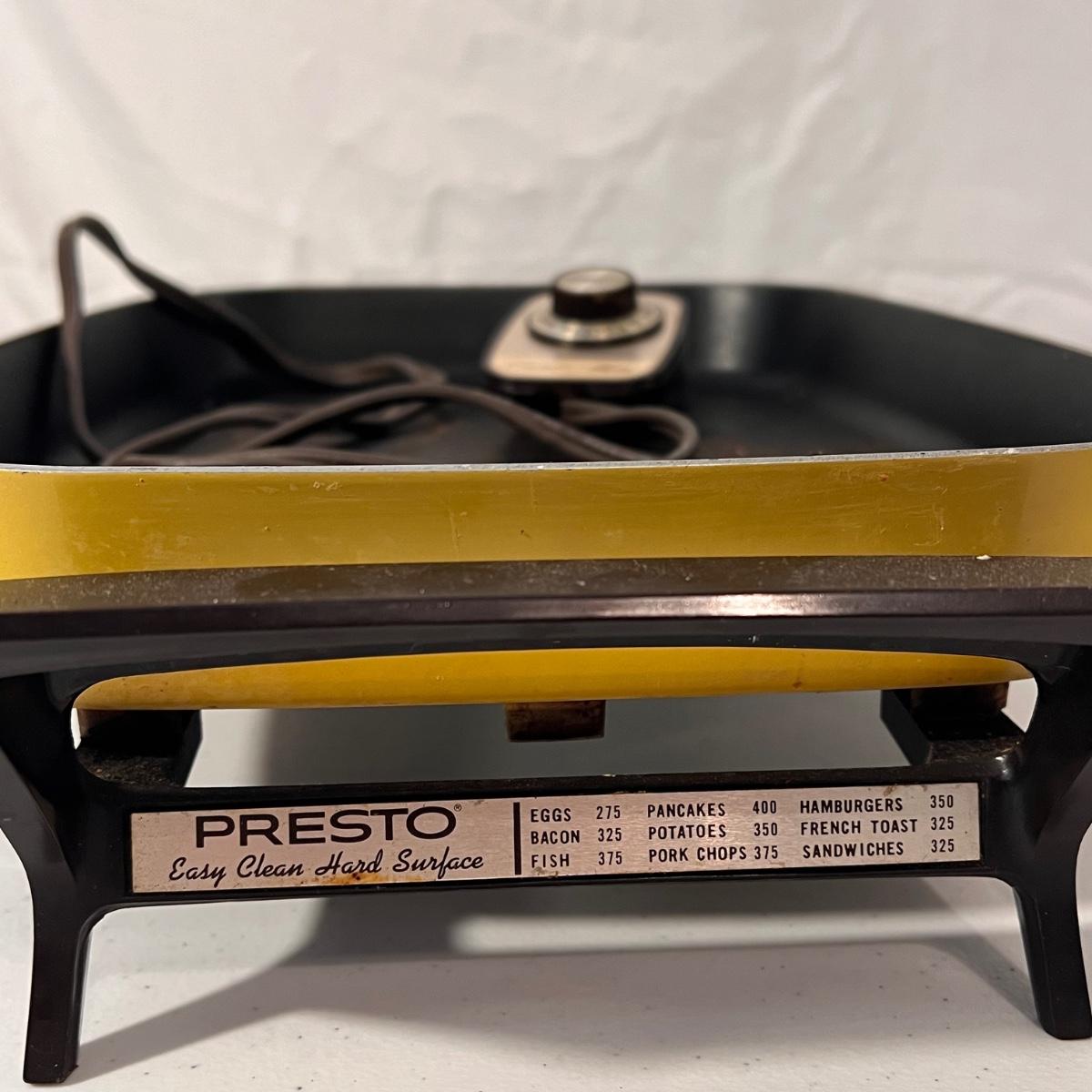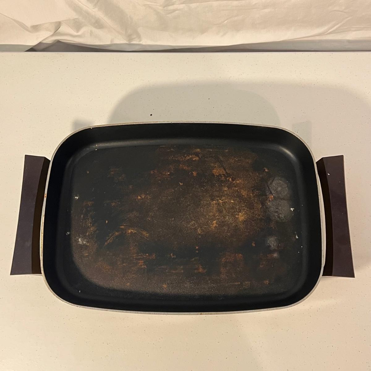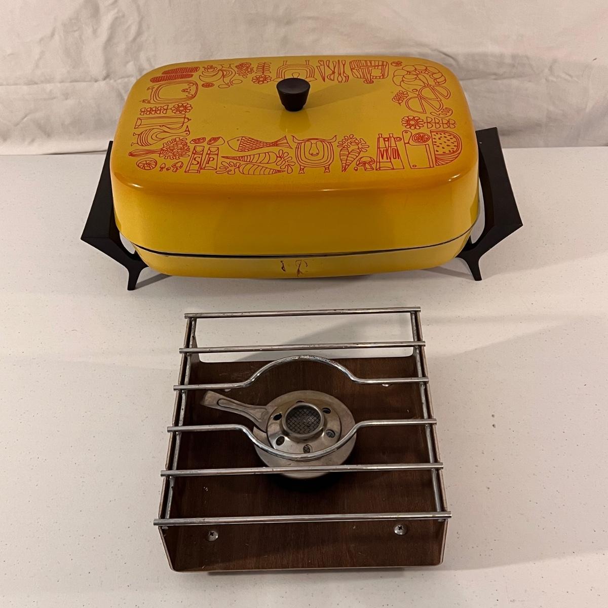 Lot includes one collapsible table, one Presto electric griddle with lid, two T-FAL yellow bakeware, one crock pot ceramic insert, and what appears to be one small camp stove. The table measures 24” x 48”H. The Presto powered on when plugged in. Local pickup only.
