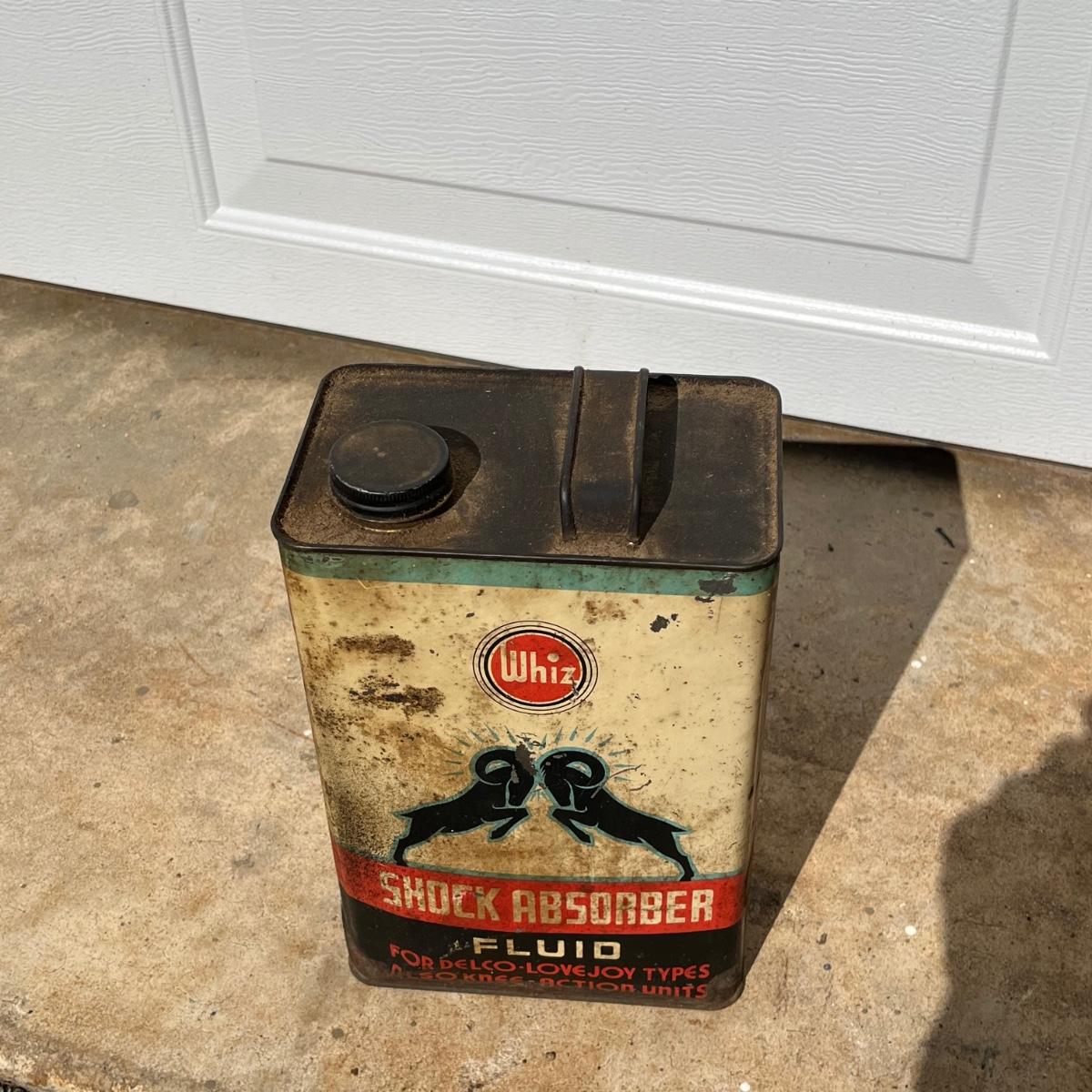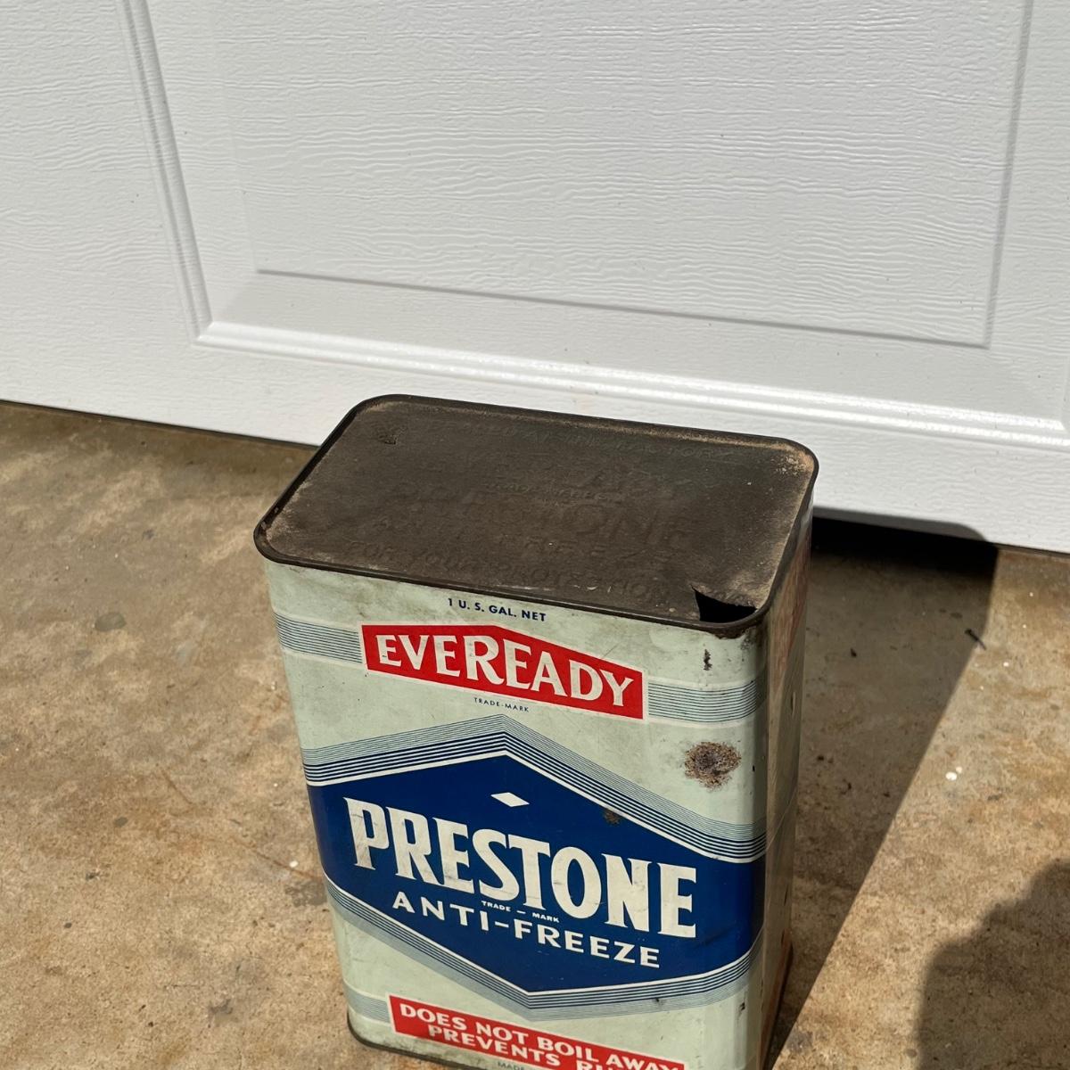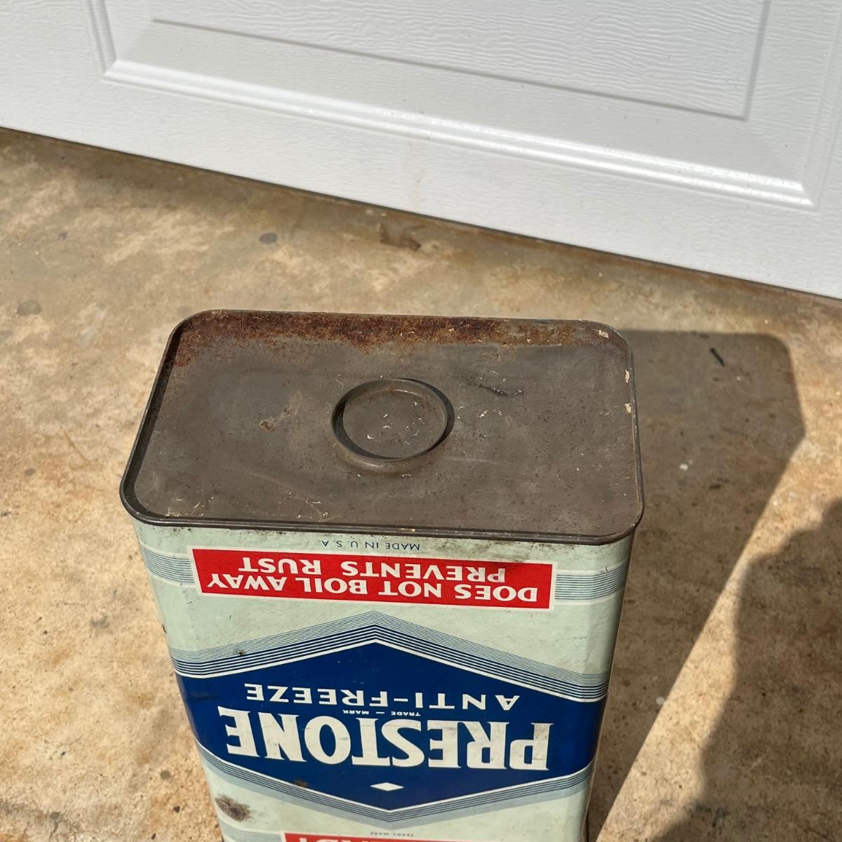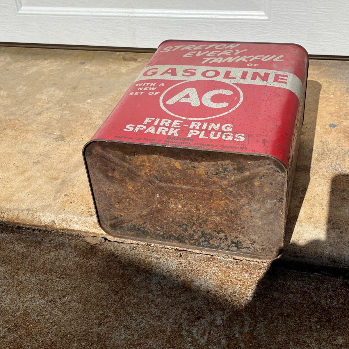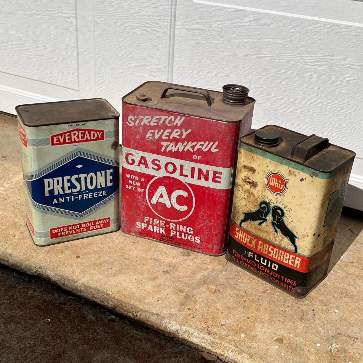 Lot includes a Prestone anti freeze one gallon can, Whiz one gallon shock absorber fluid can and a AC Fire Ring Spark Plugs two gallon gas can. All cans are metal and have scratches and dents, see pictures.