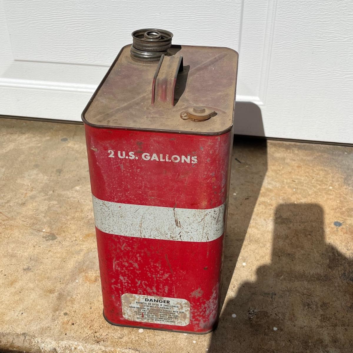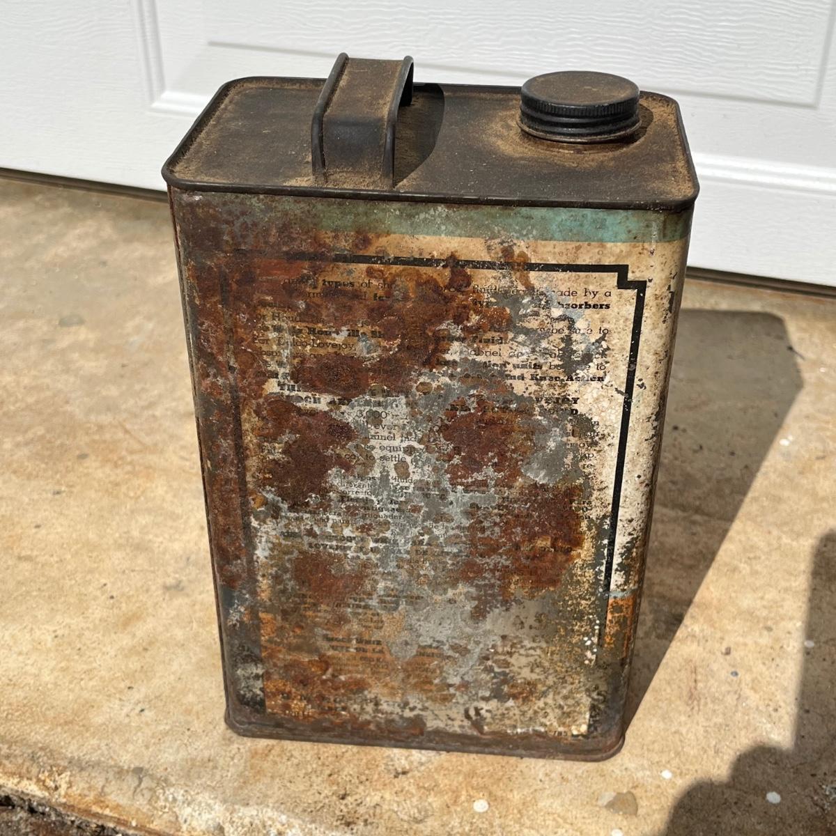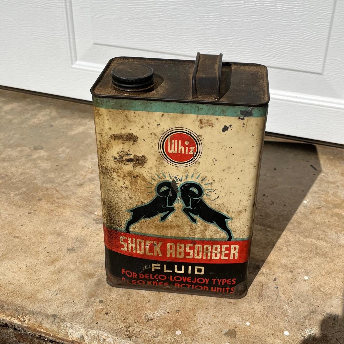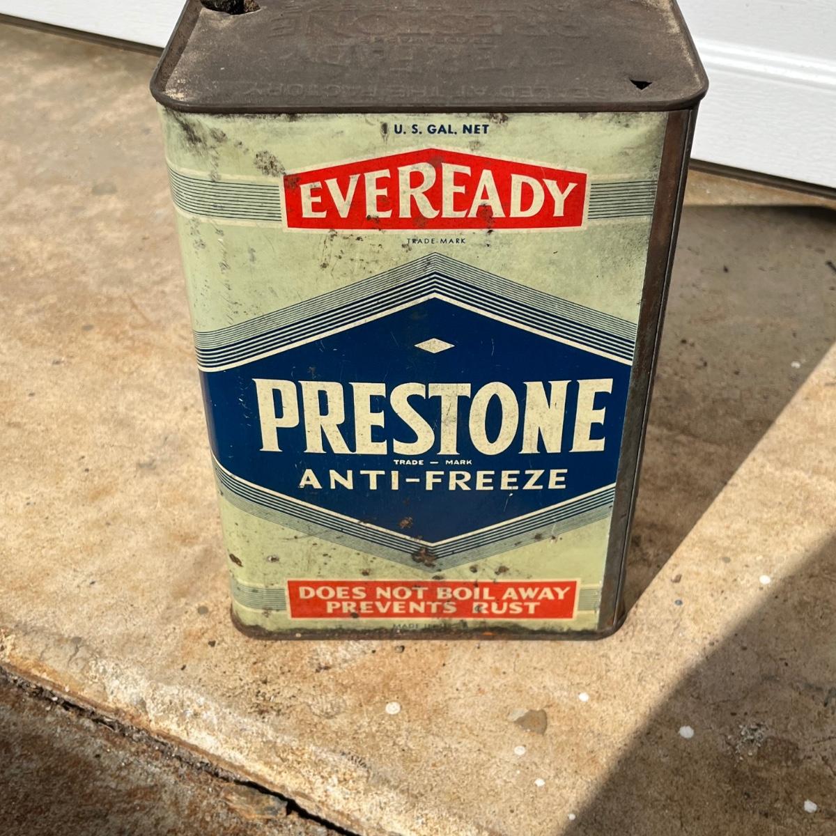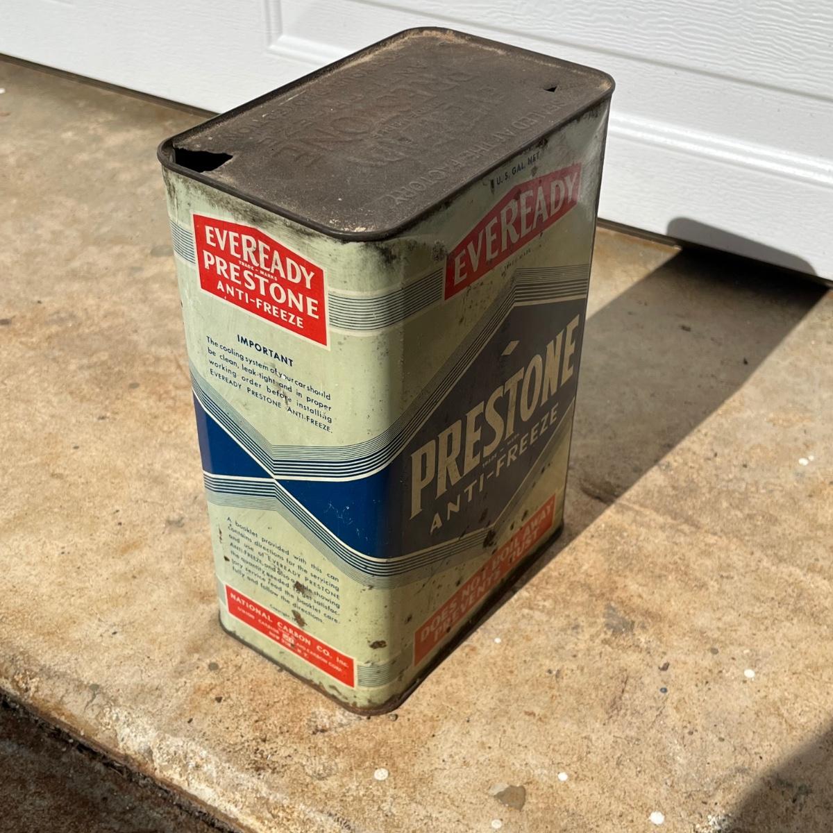 Lot includes a Prestone anti freeze one gallon can, Whiz one gallon shock absorber fluid can and a AC Fire Ring Spark Plugs two gallon gas can. All cans are metal and have scratches and dents, see pictures.