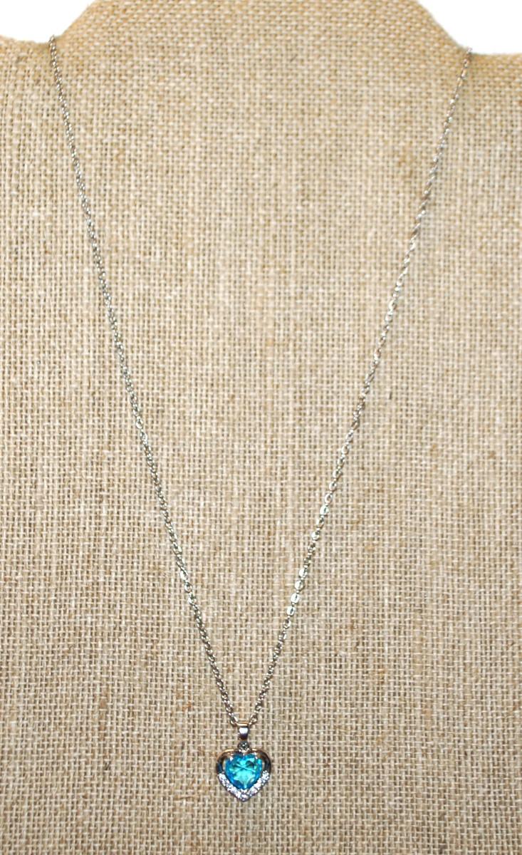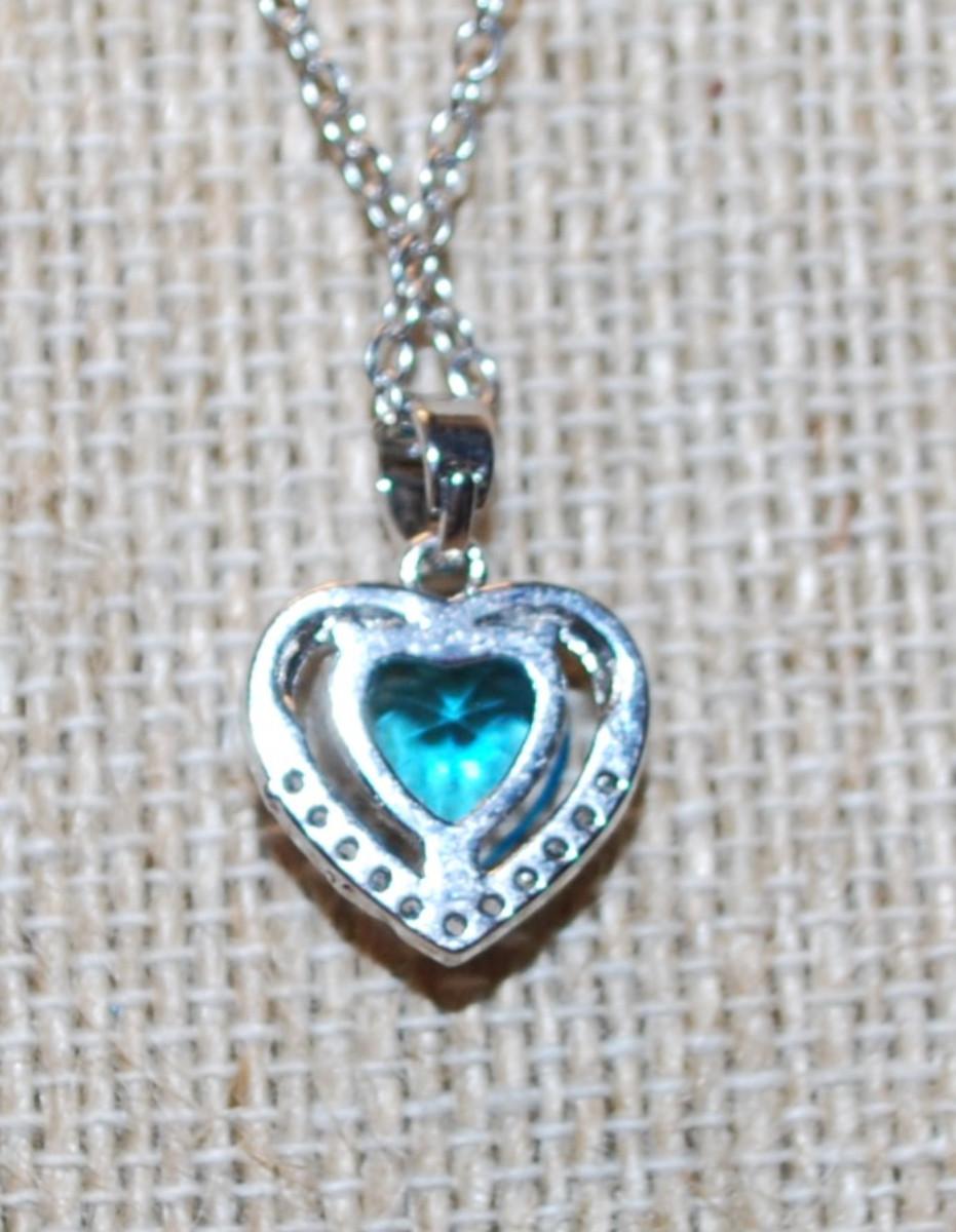 Pretty Heart Shaped Blue Faceted Stone Inside a 10 Clear Stone Silver Heart PENDANT (½" x ½") on a Silver Tone Necklace Chain 18" L