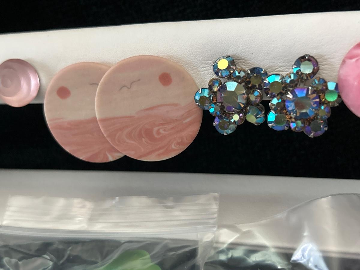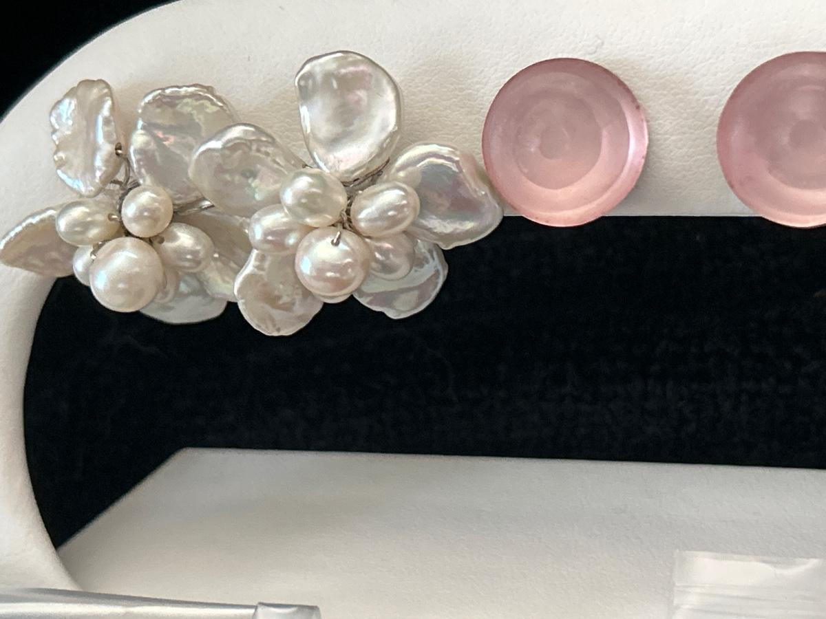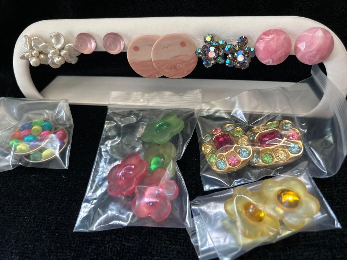 Starting on the left: first 4 are pierced & the last 6 are clip. The pearl like flowers only have 1 back.