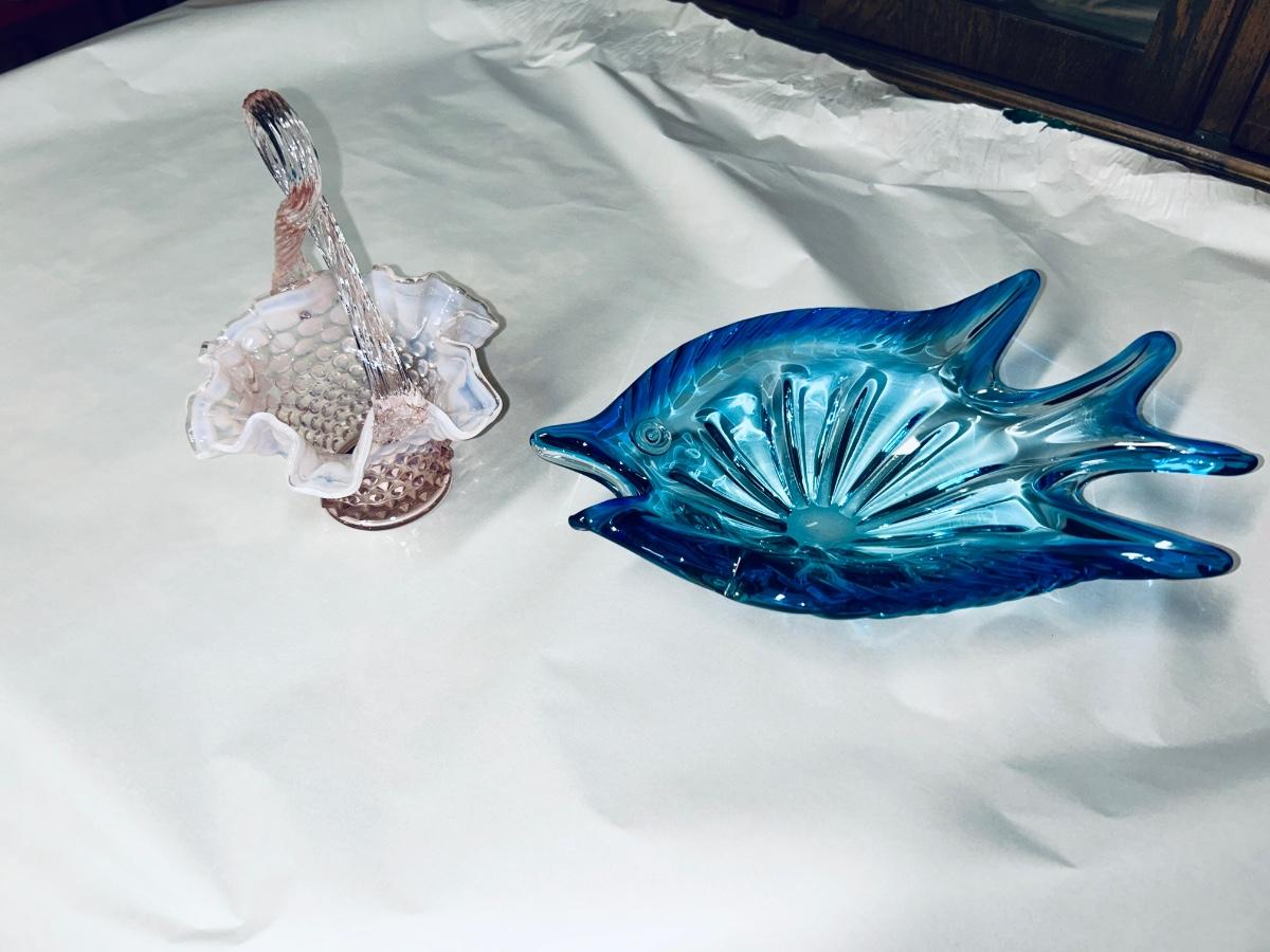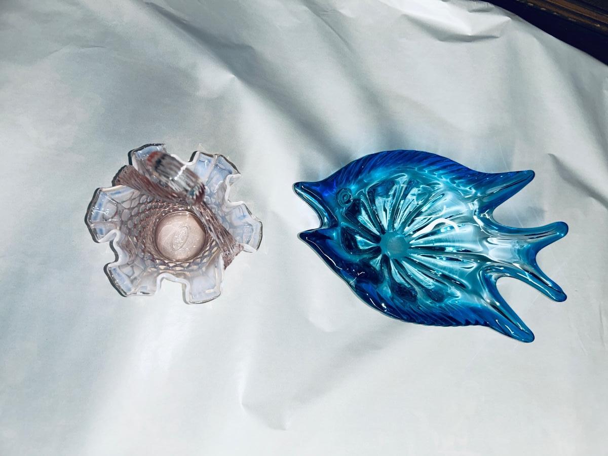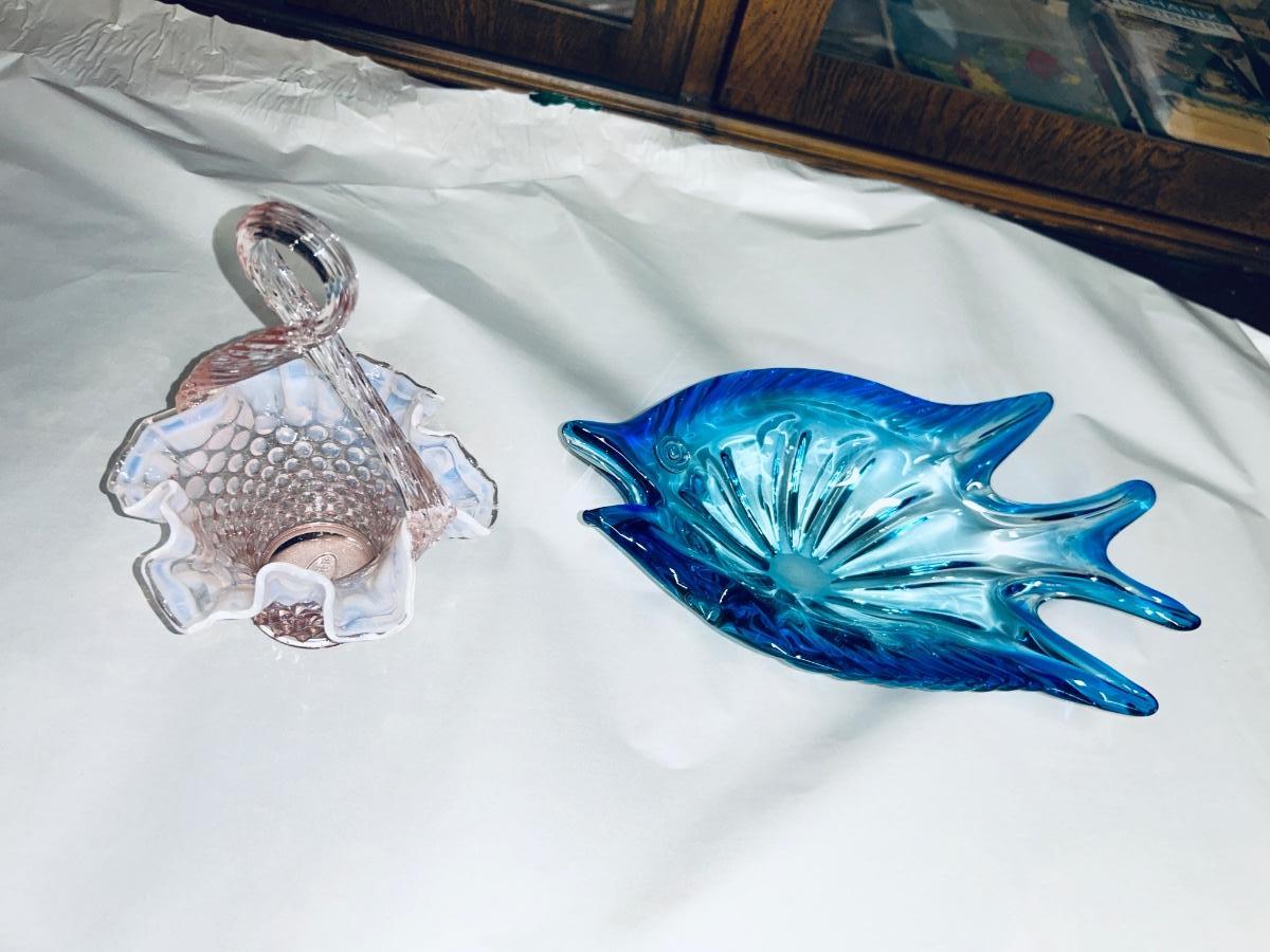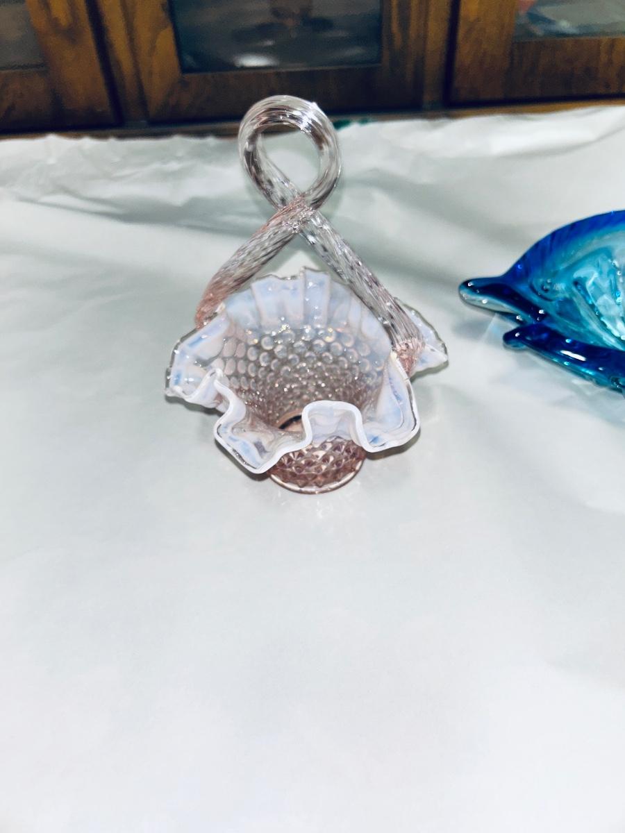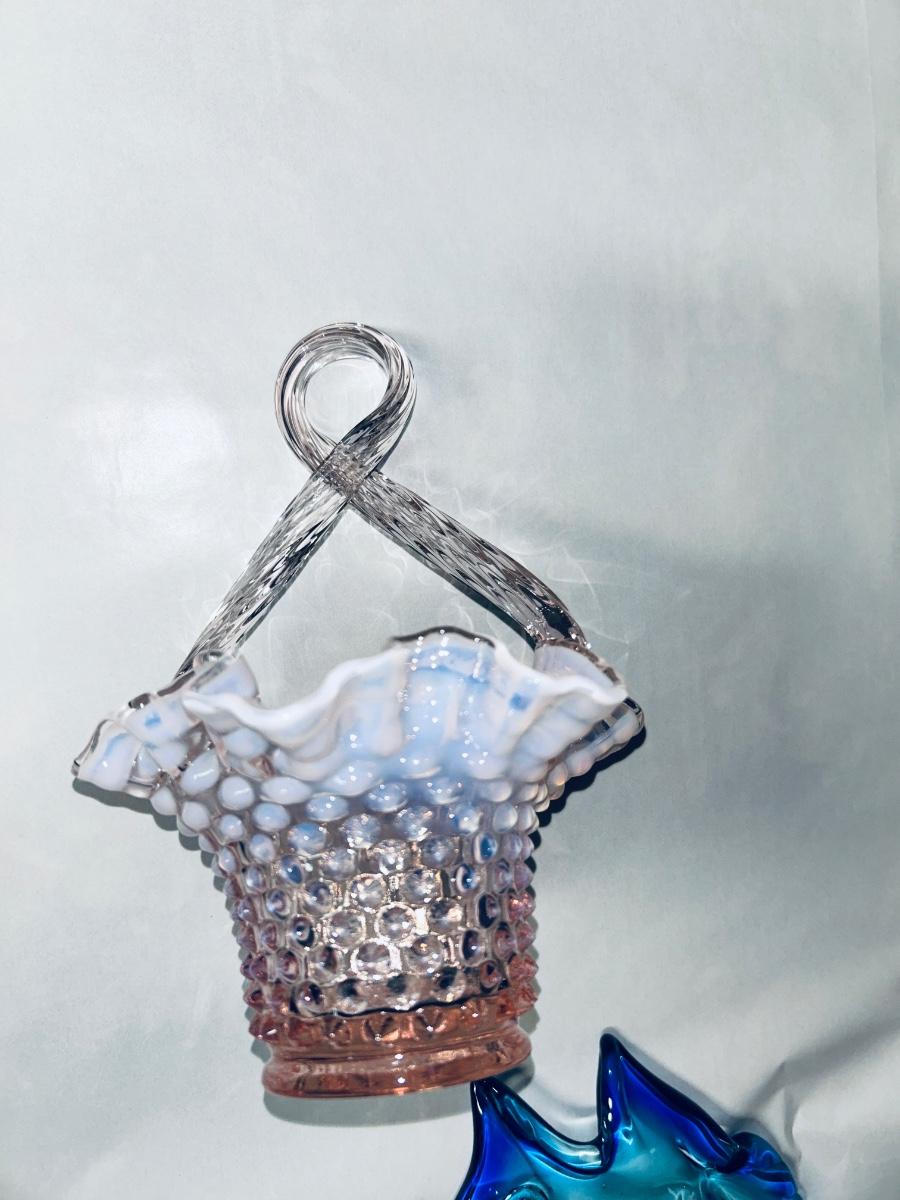 PRETTY IRIDESCENT, WHITE AND PINK RUFFLED FENTON HOBNAIL BASKET AND MURANO BLUE GLASS FISH BOWL