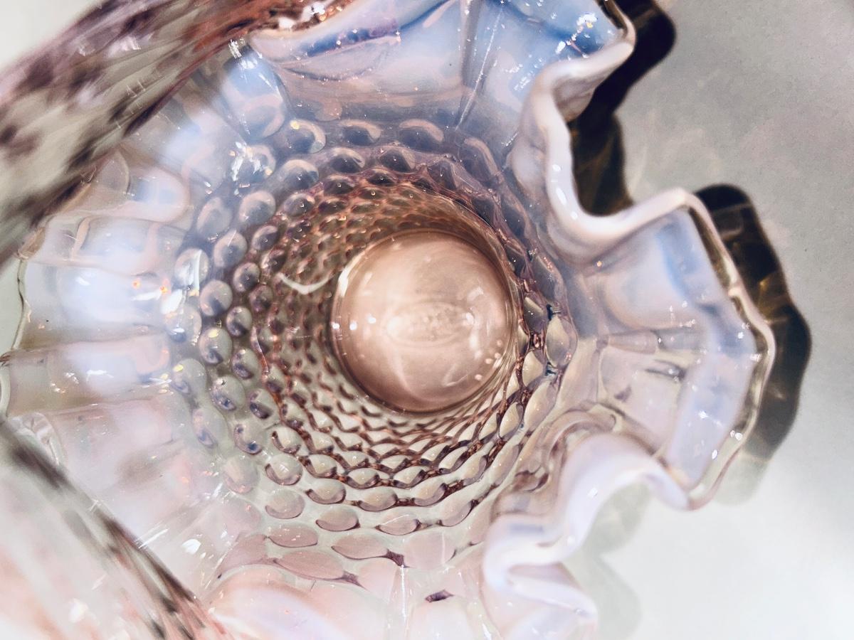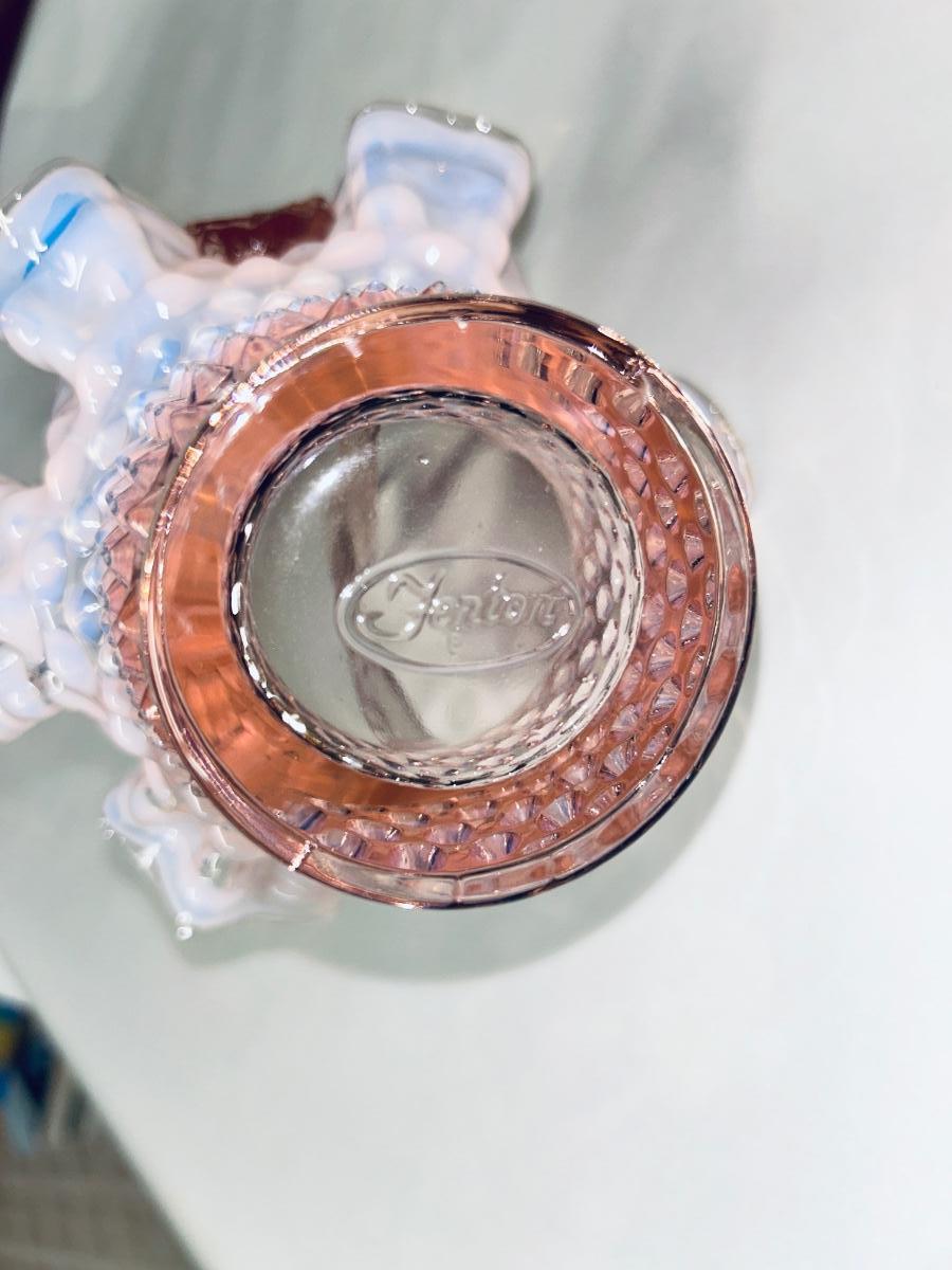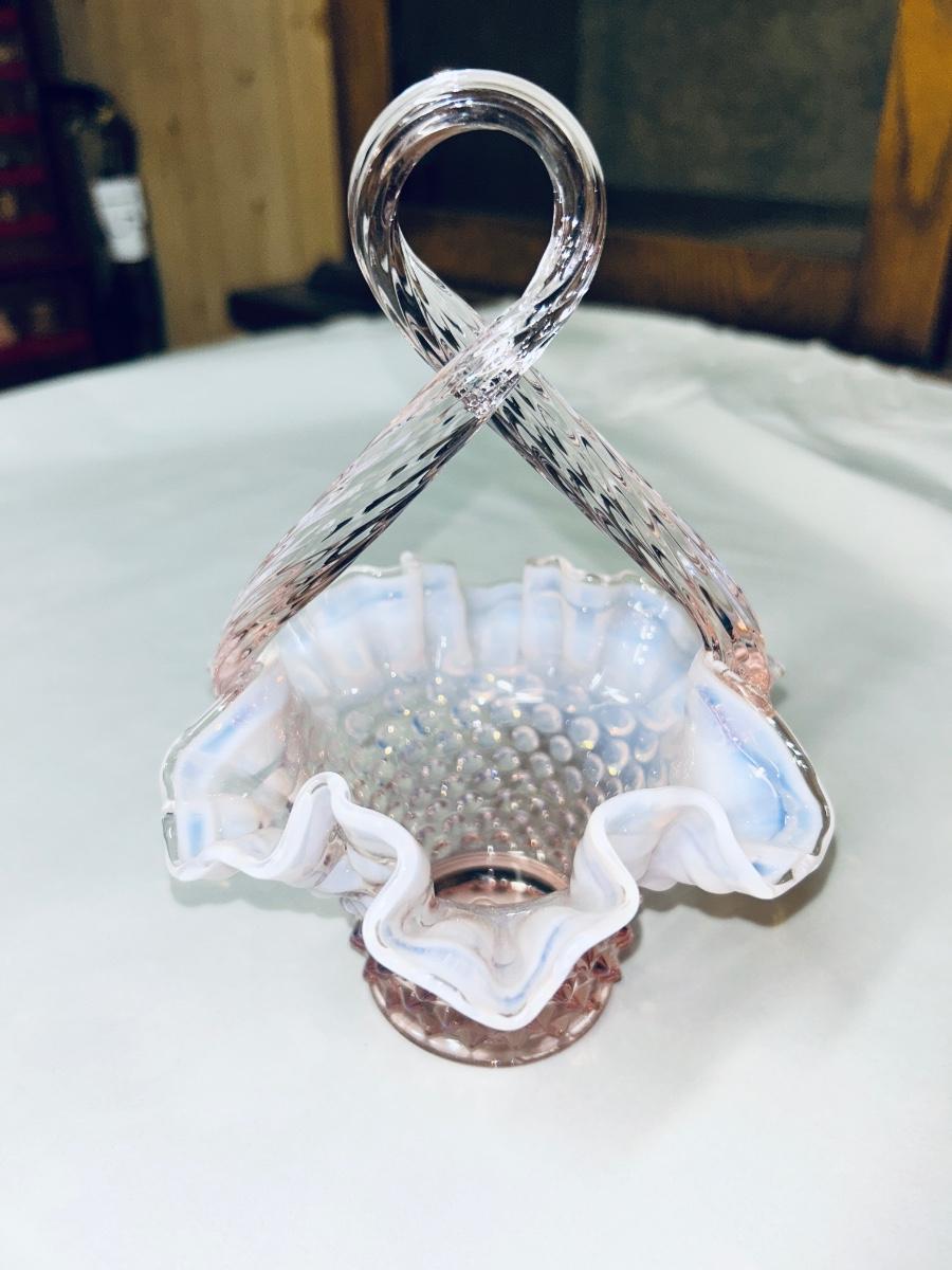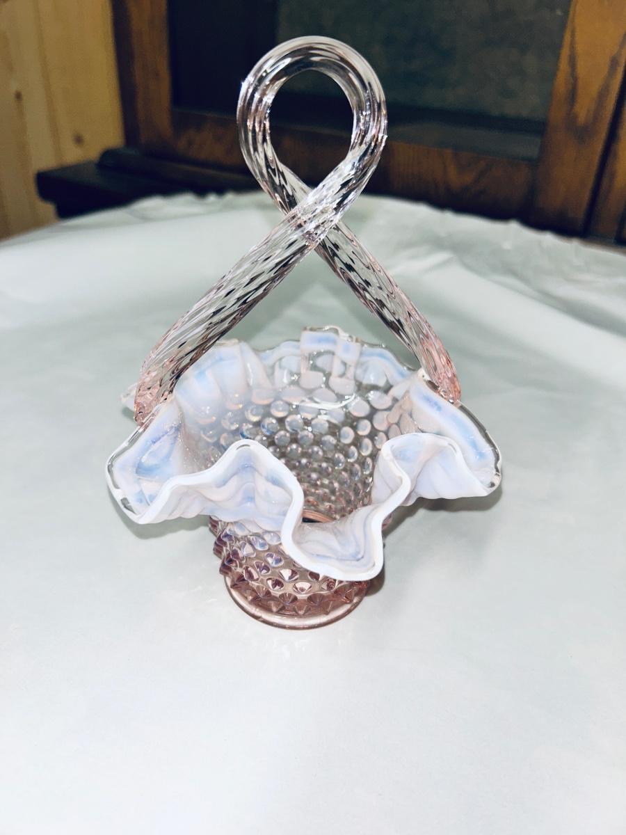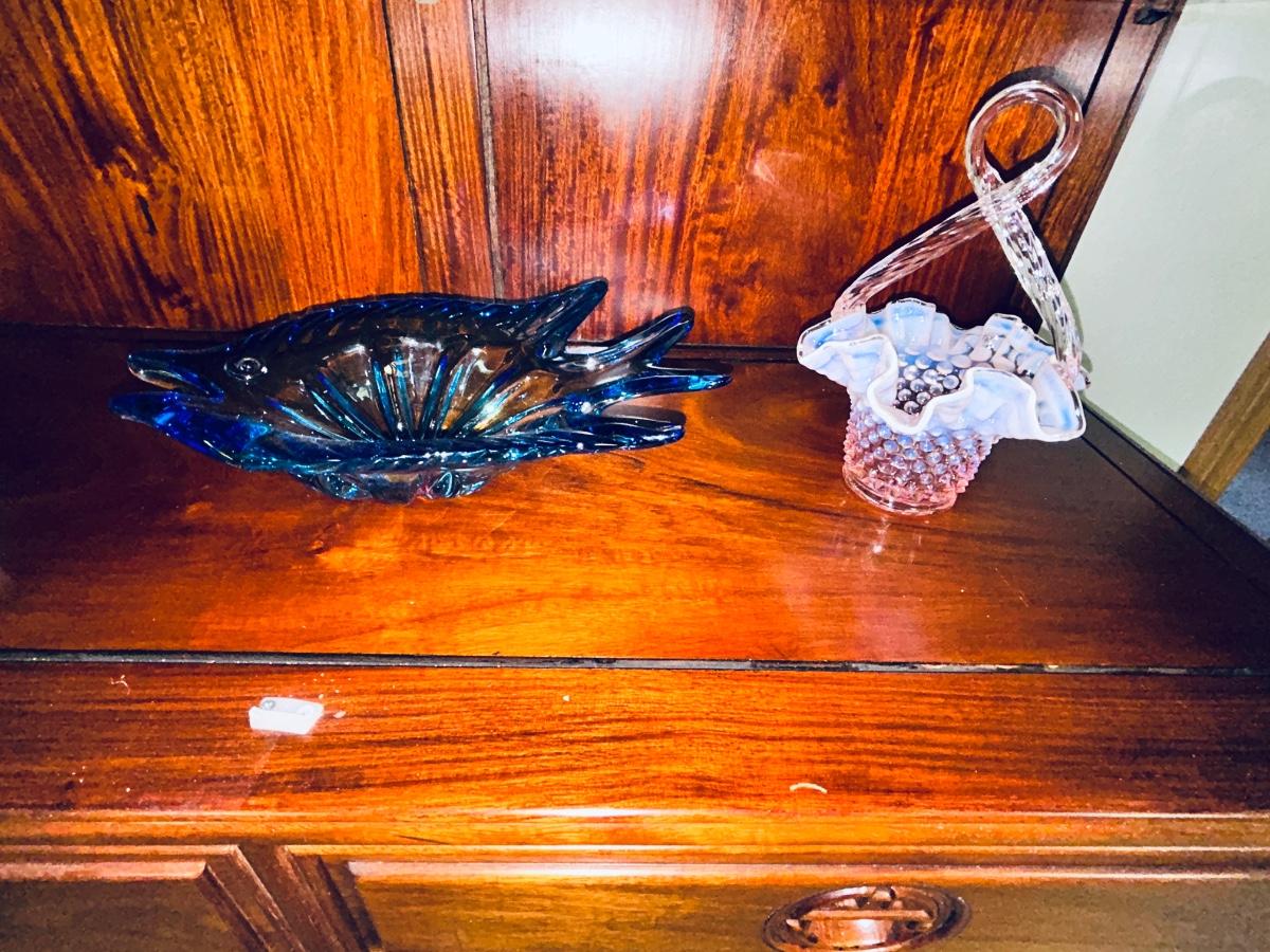 PRETTY IRIDESCENT, WHITE AND PINK RUFFLED FENTON HOBNAIL BASKET AND MURANO BLUE GLASS FISH BOWL