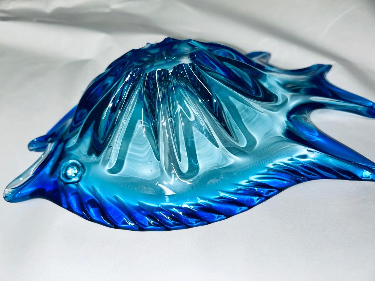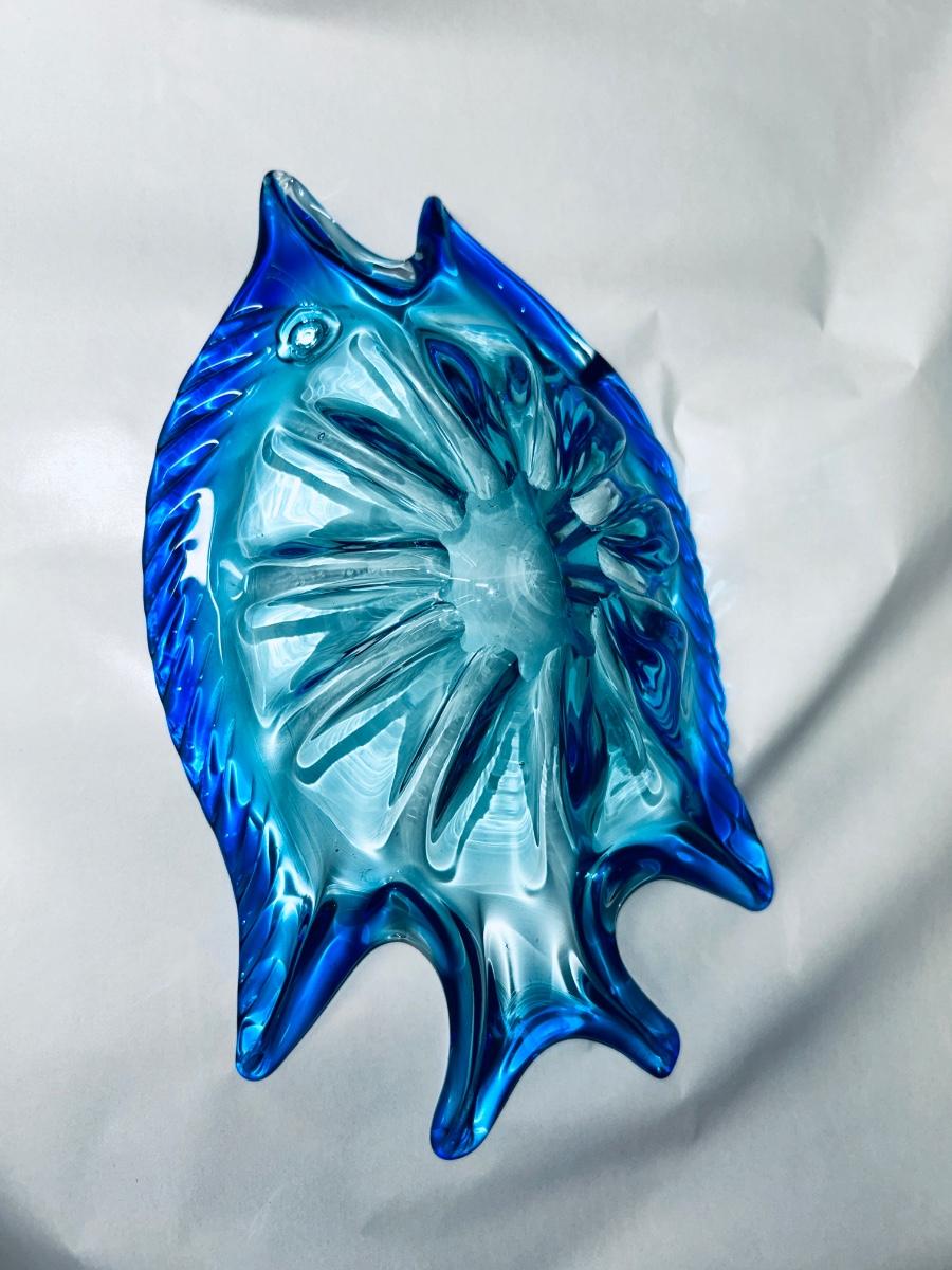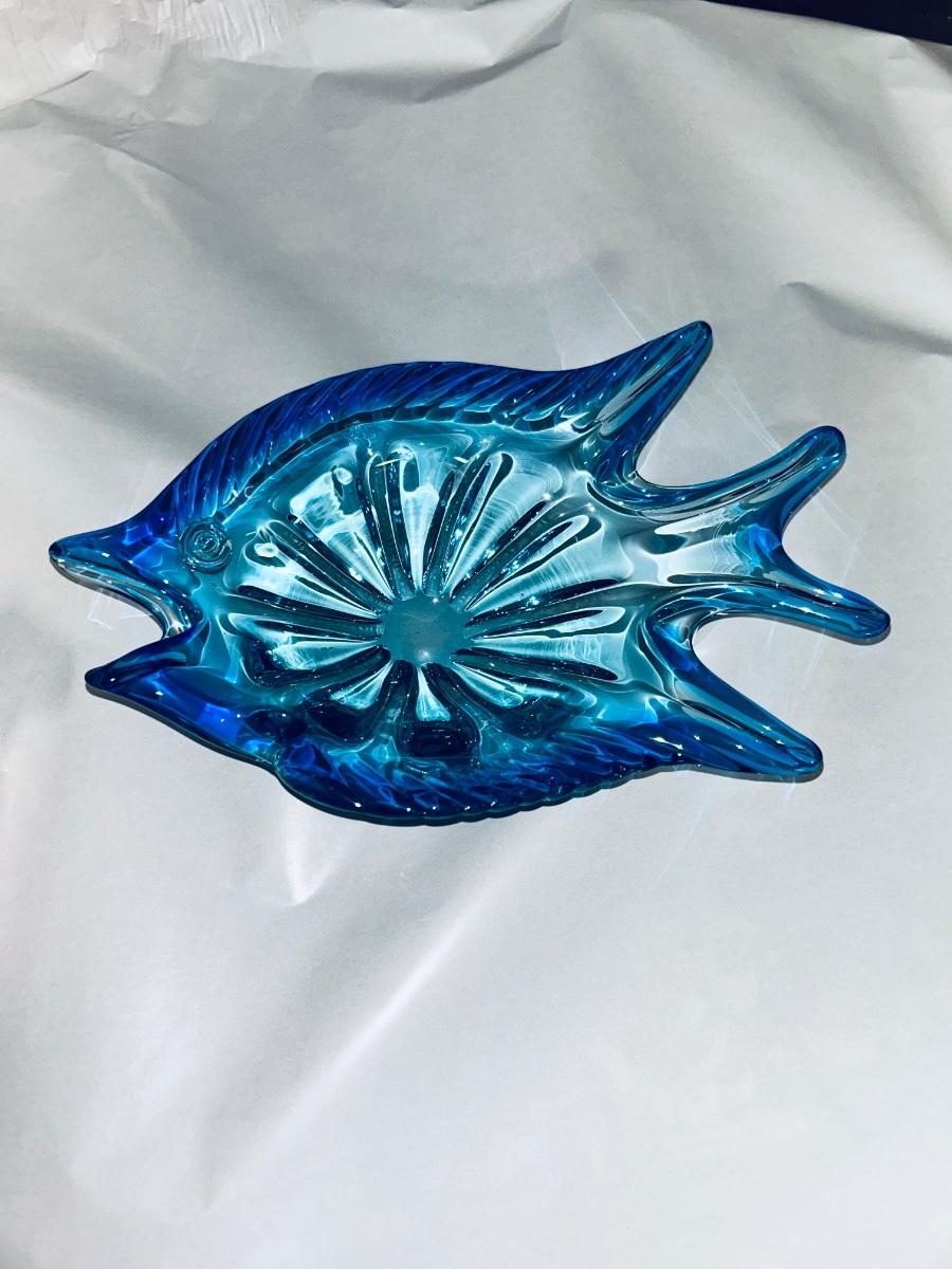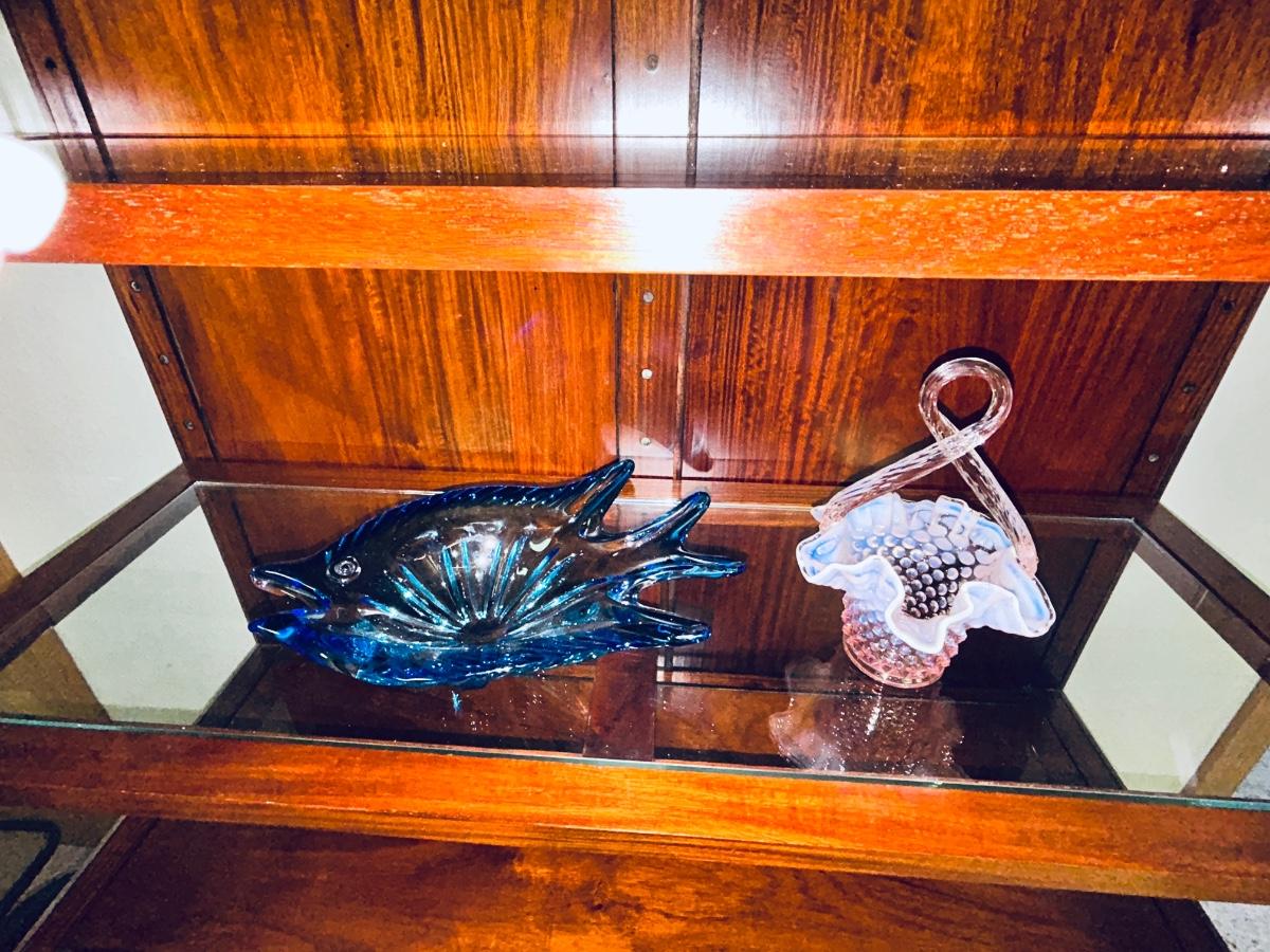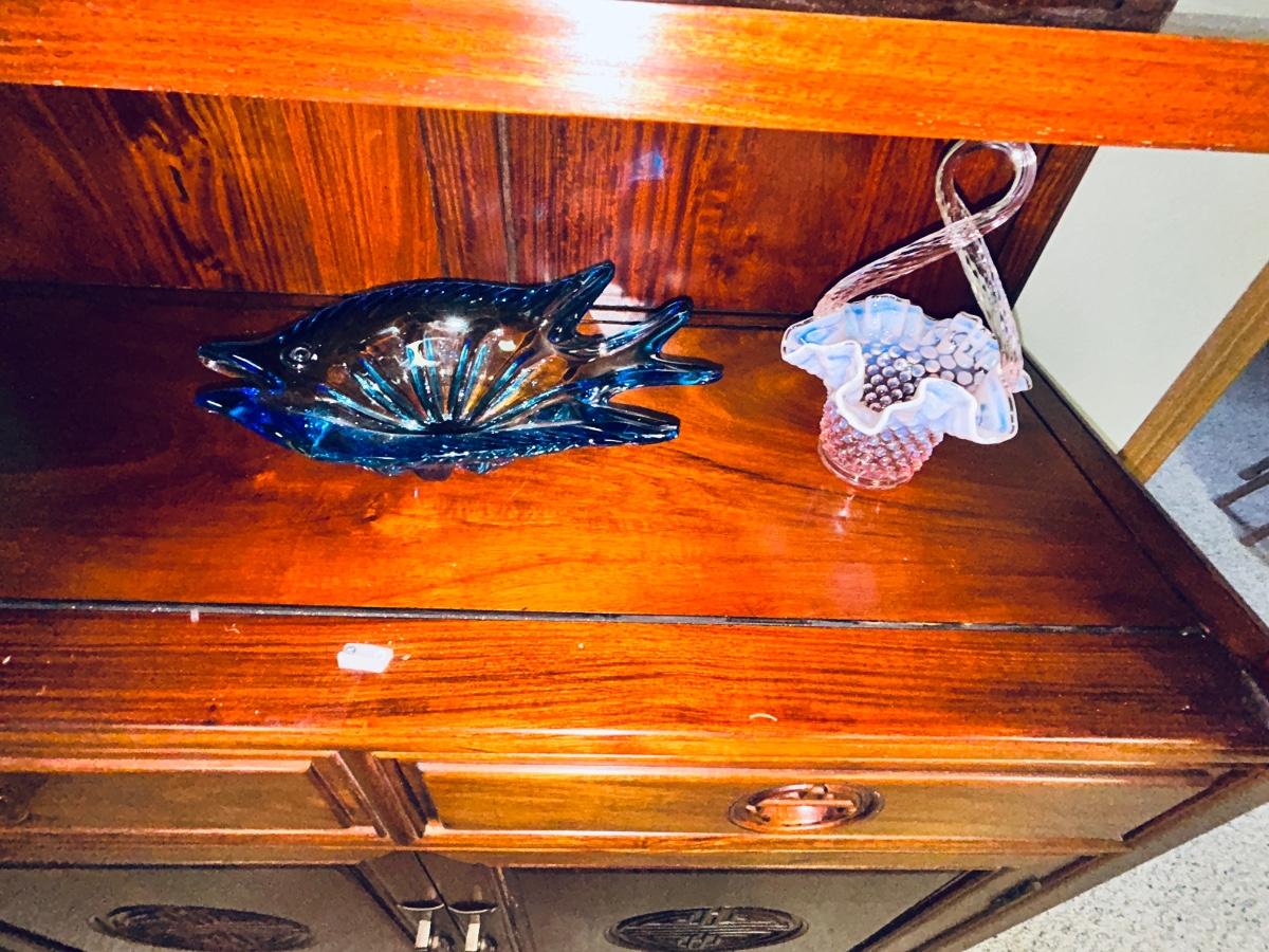 PRETTY IRIDESCENT, WHITE AND PINK RUFFLED FENTON HOBNAIL BASKET AND MURANO BLUE GLASS FISH BOWL