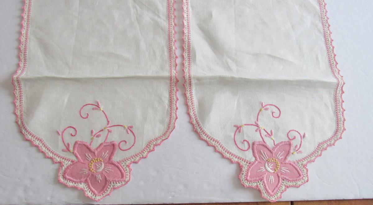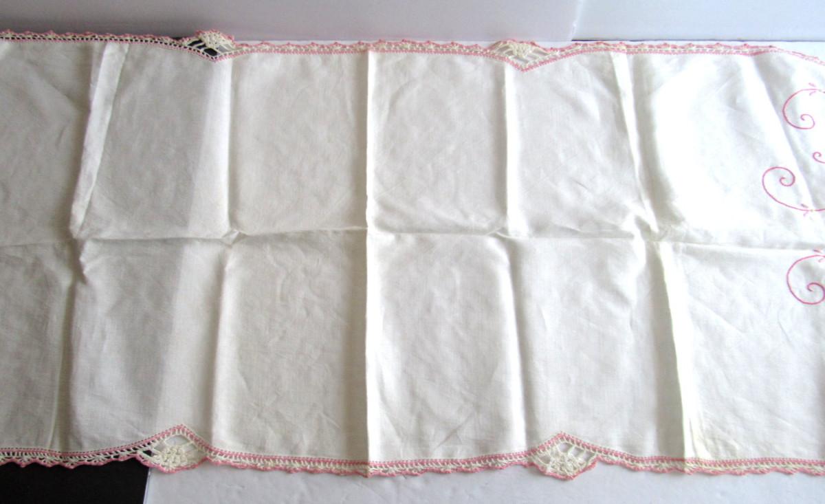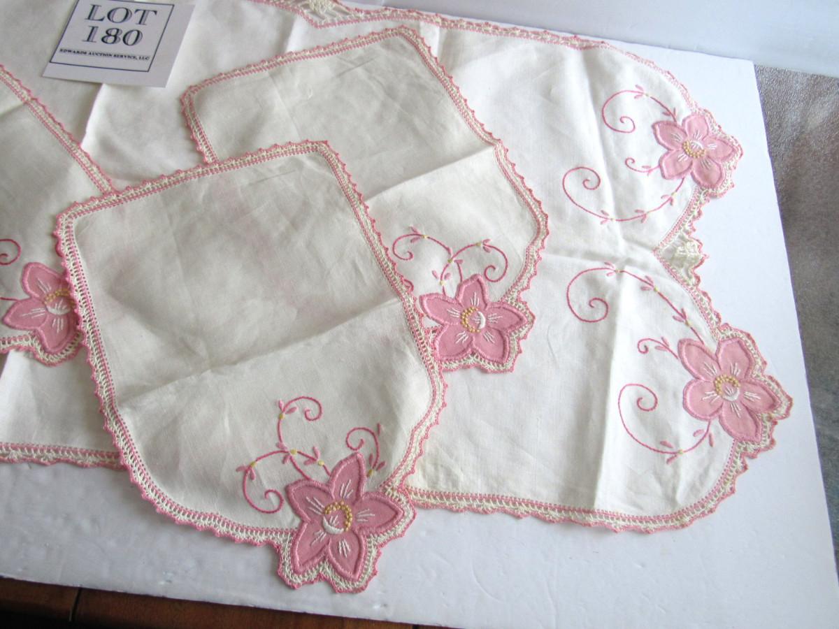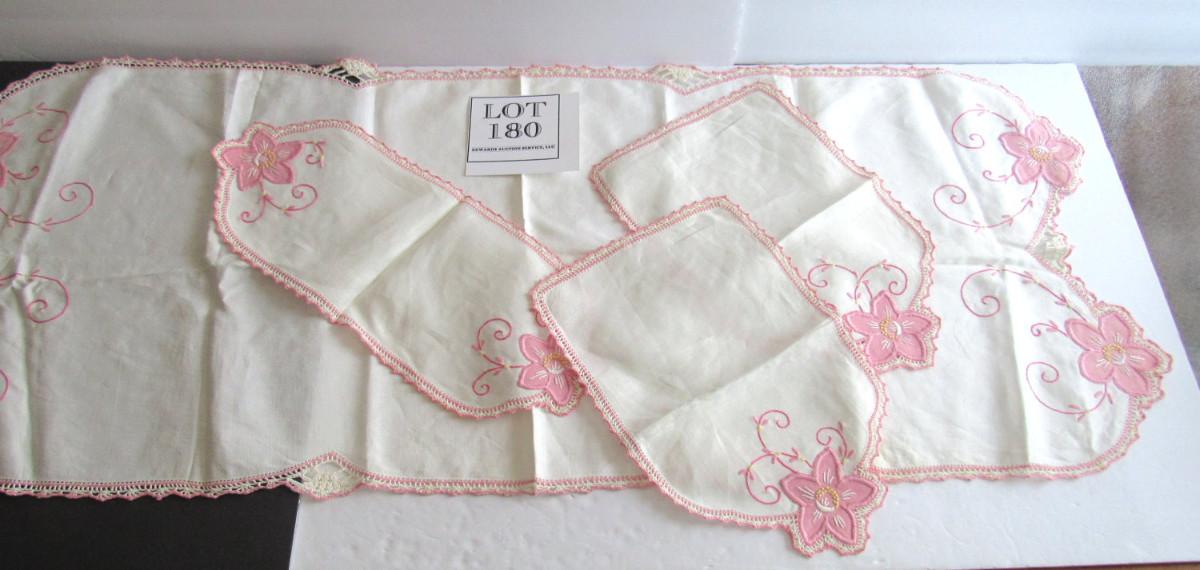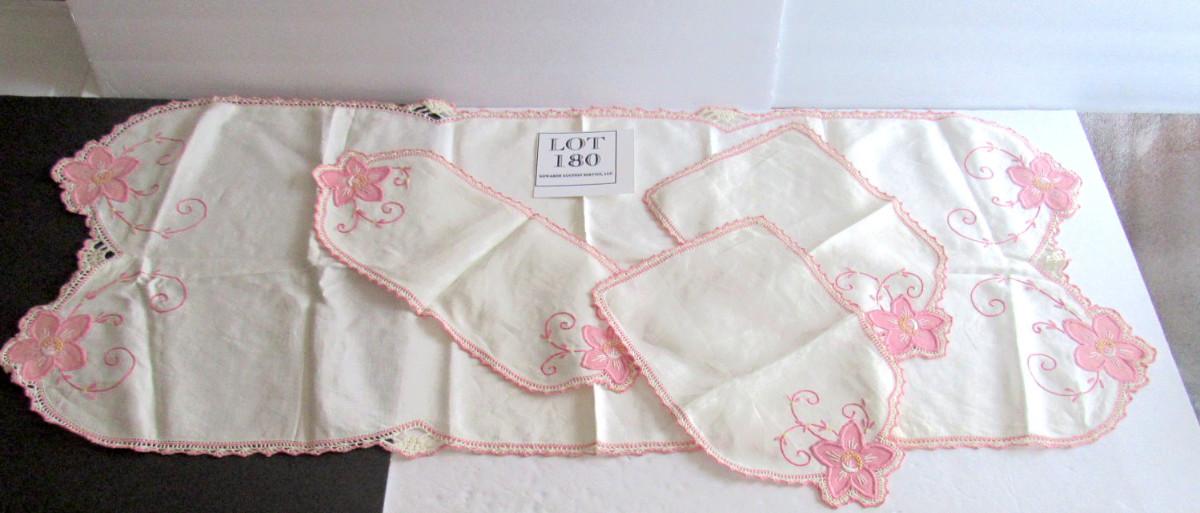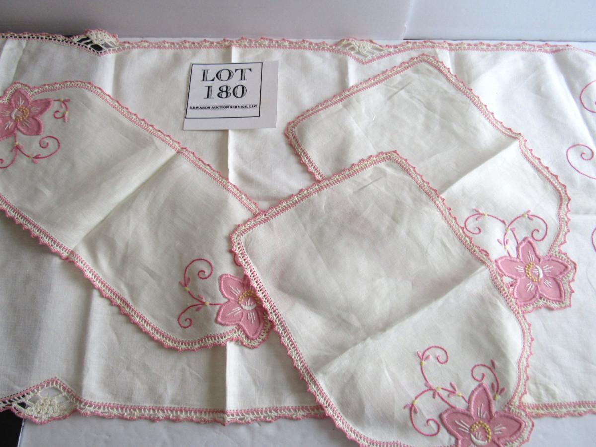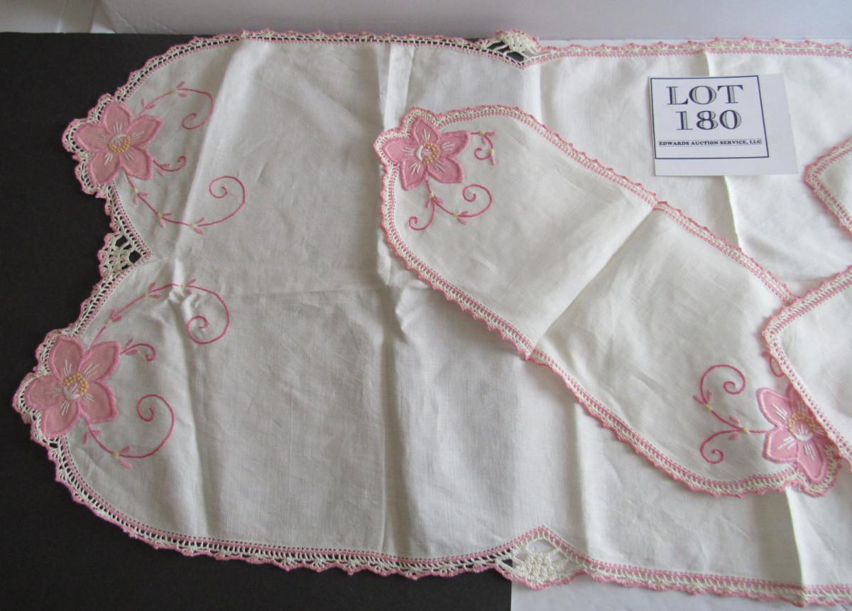Nice shape. Table runner, small doily and arm rest doilies. Shipping is available at actual cost plus $5.00 per box handling and supply fee. See our terms for details. All sales final.
