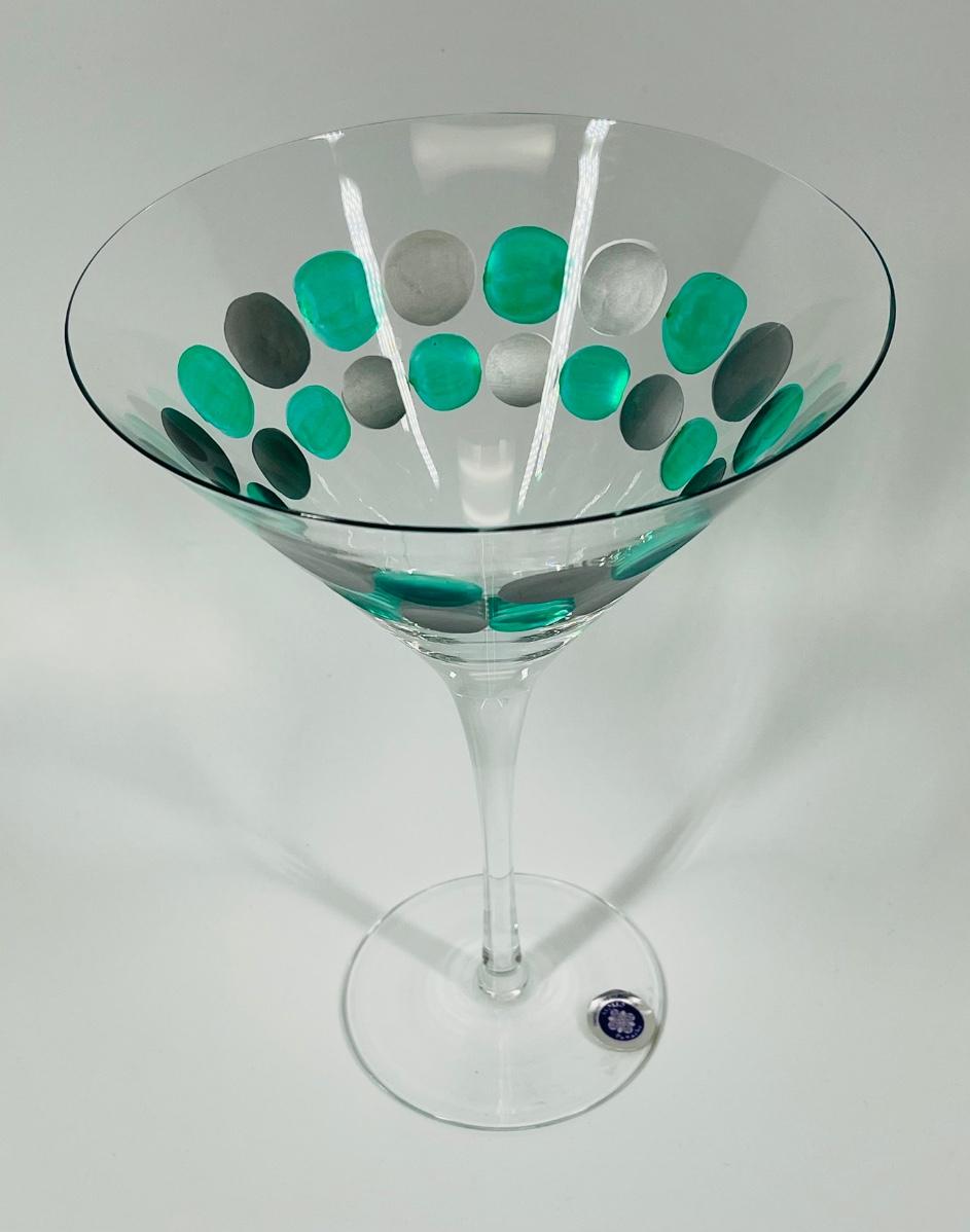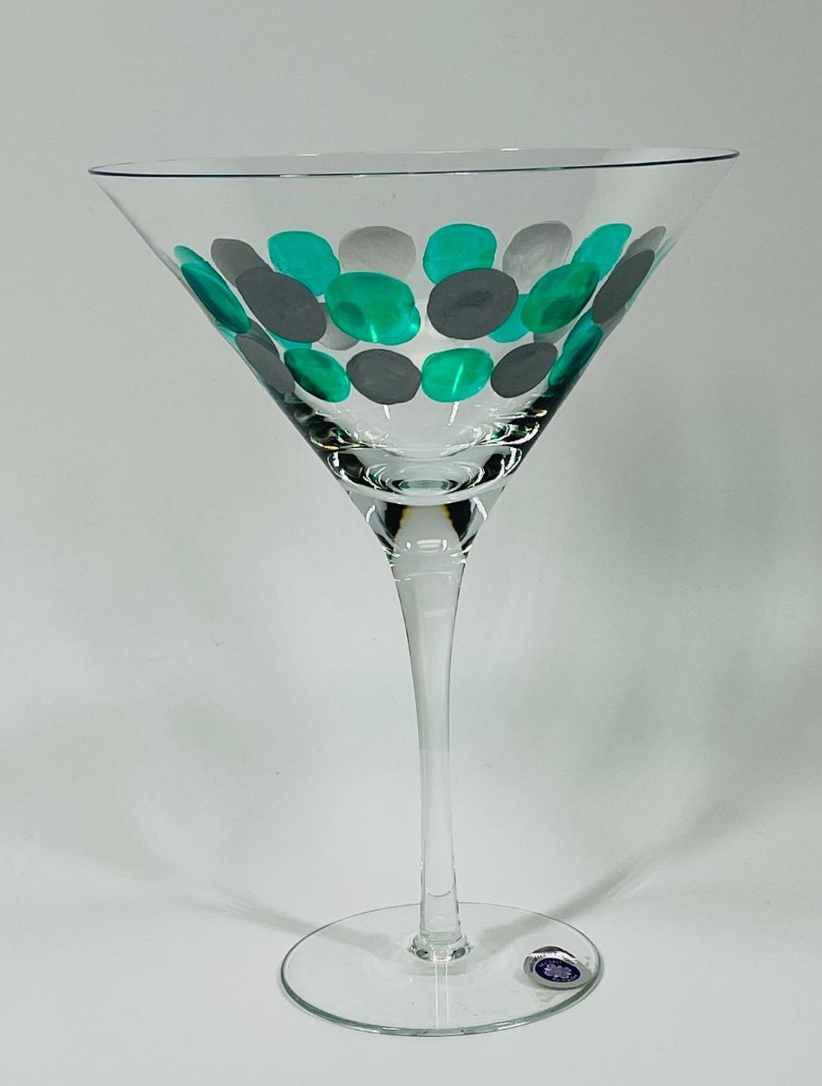 Single glass with original sticker, very large martini style, with retro mid-century colors.