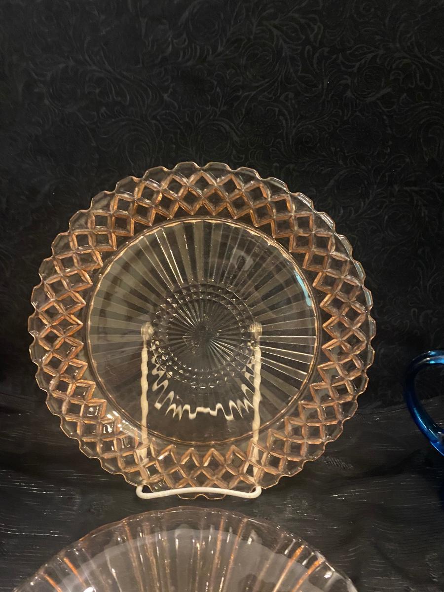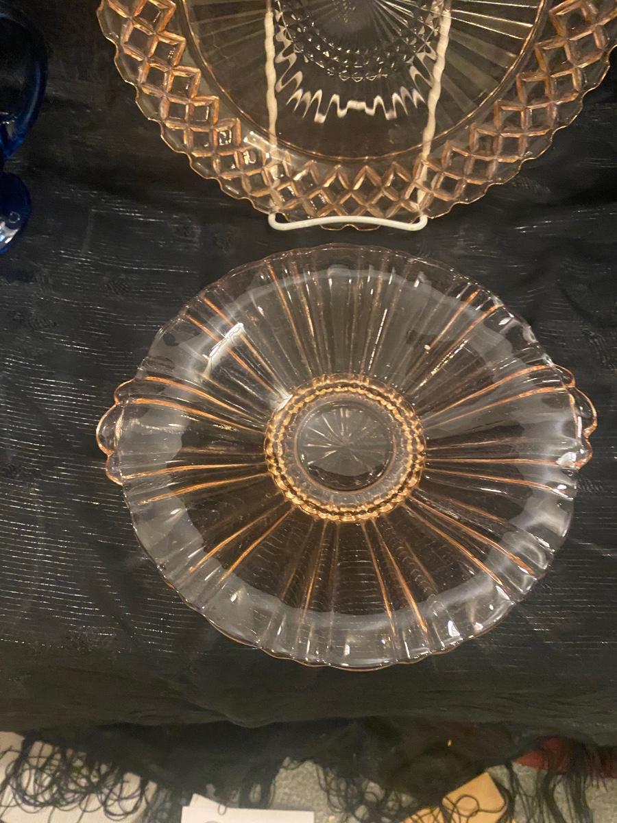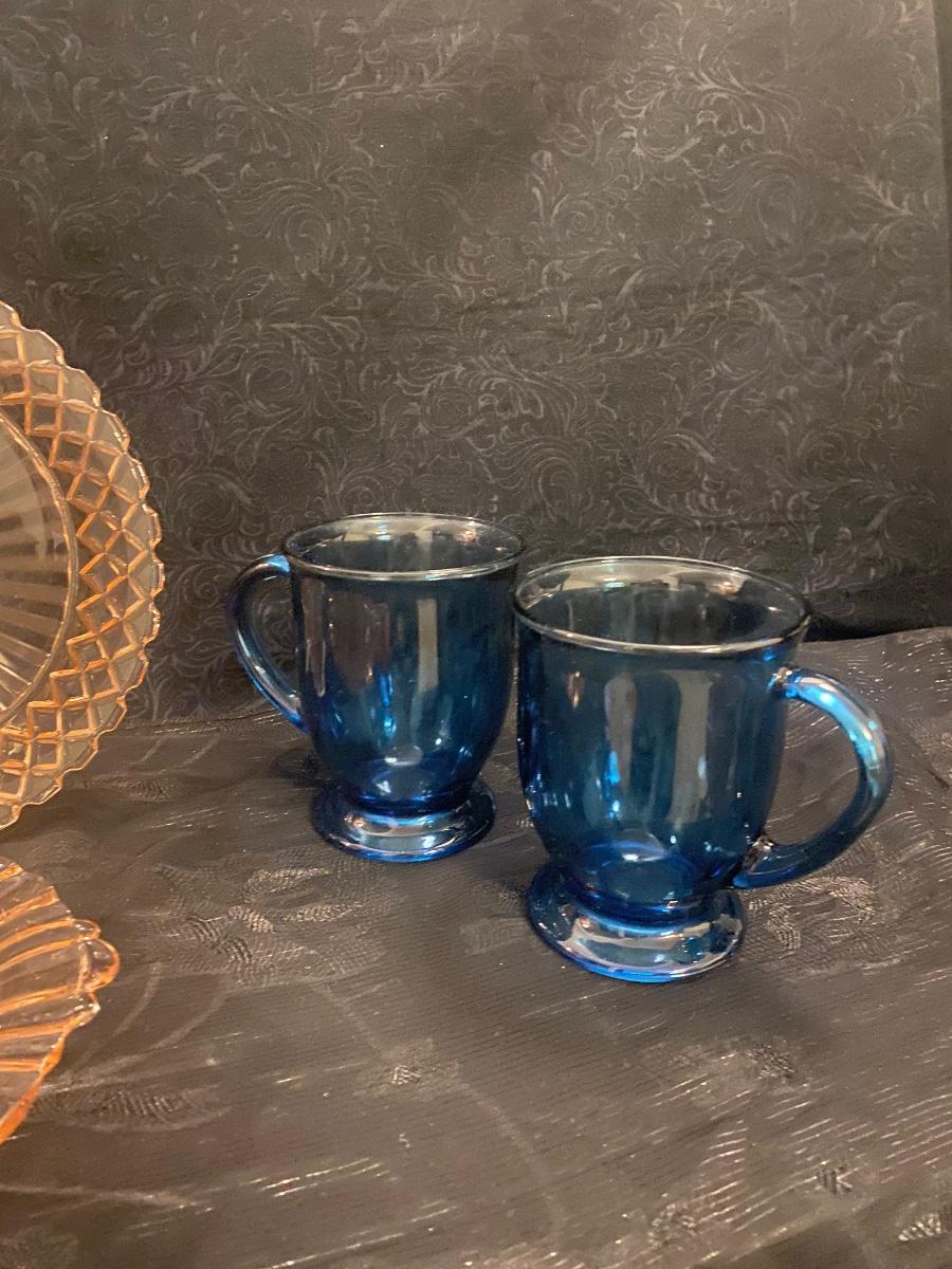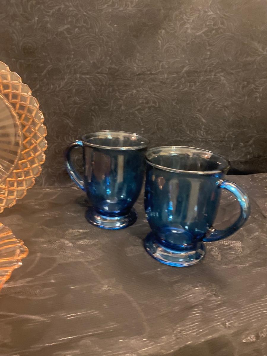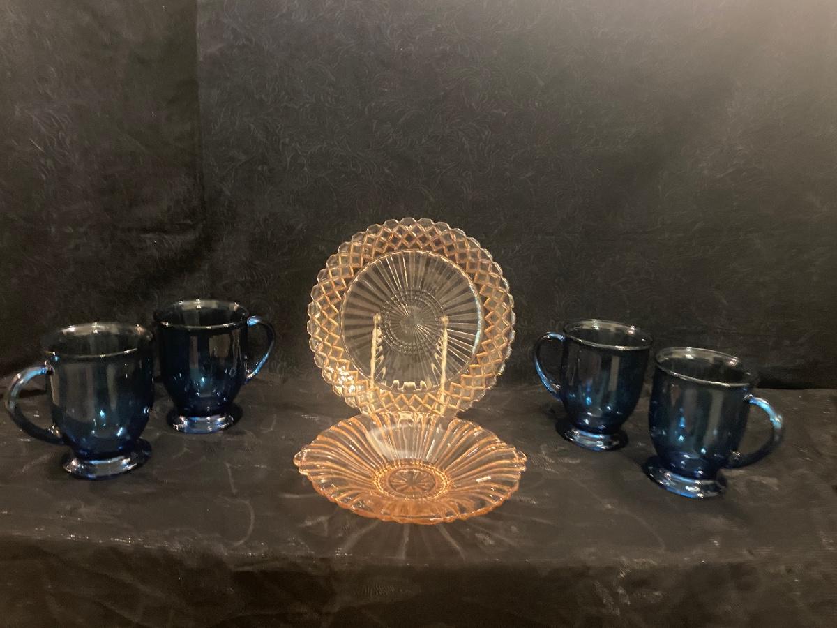 2 PINK GLASS PLATTERS AND 4 BLUE GLASS MUGS