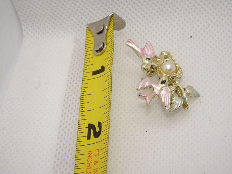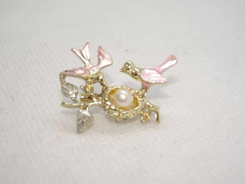 Pretty Pink Birds Brooch, Center Pearl, Bird Nest Brooch