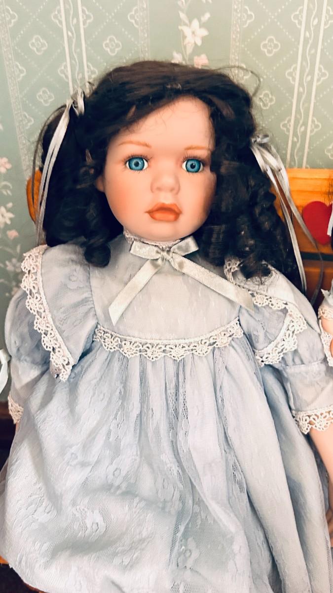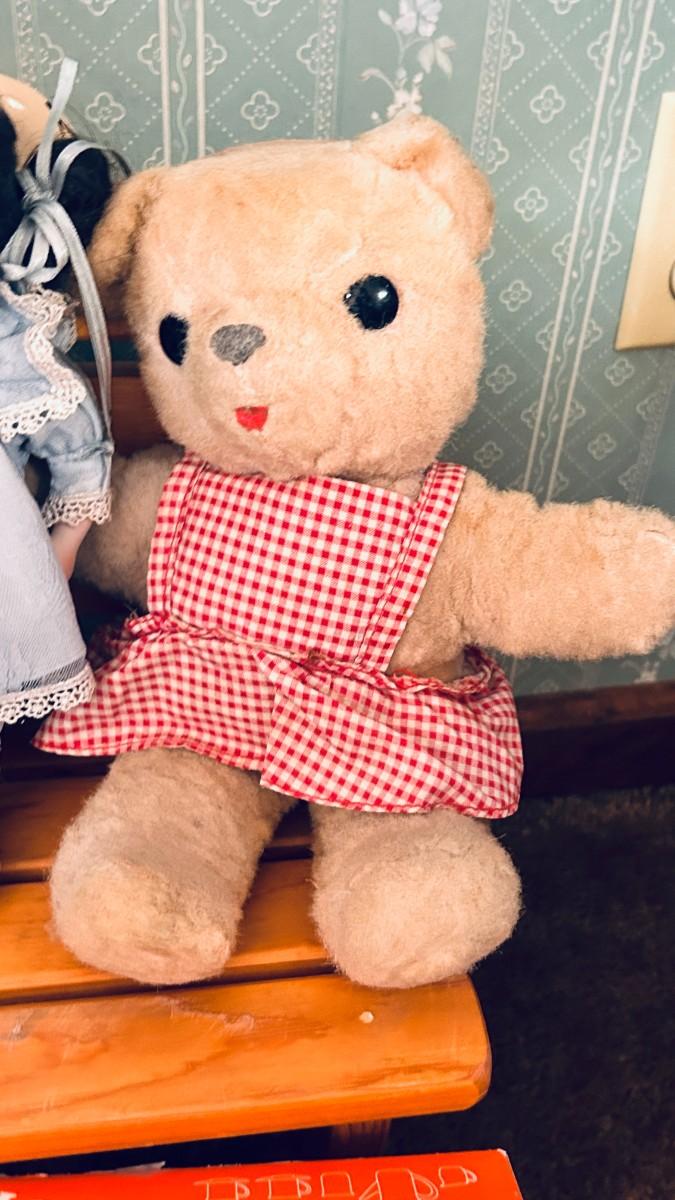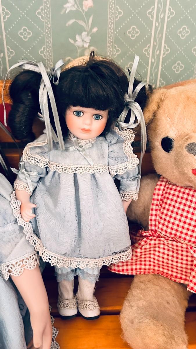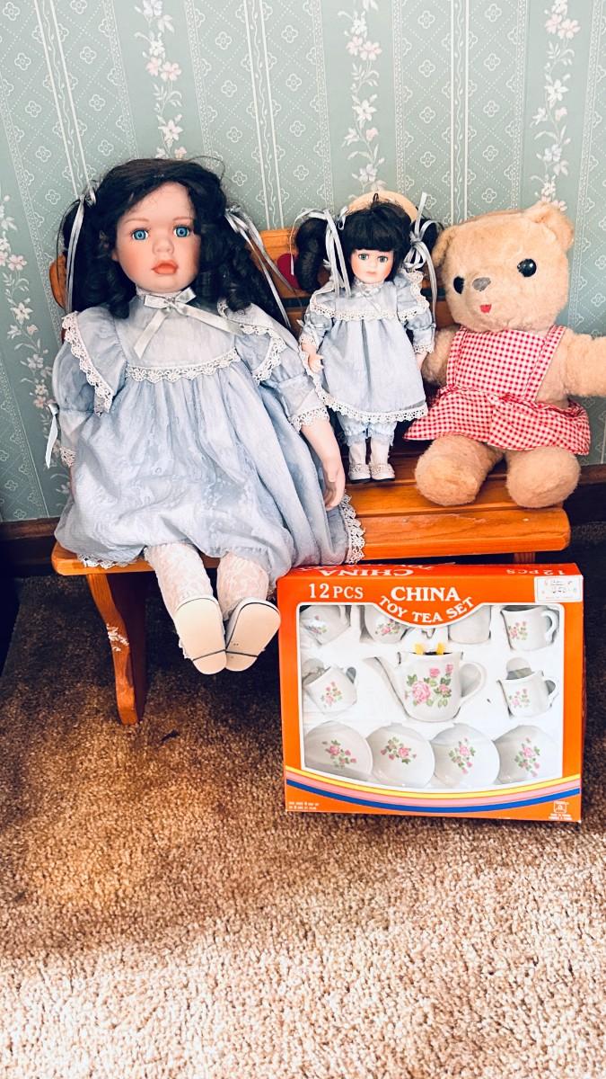 PRETTY PORCELAIN DOLLS, BENCH AND VINTAGE BEAR