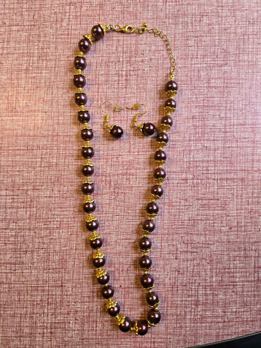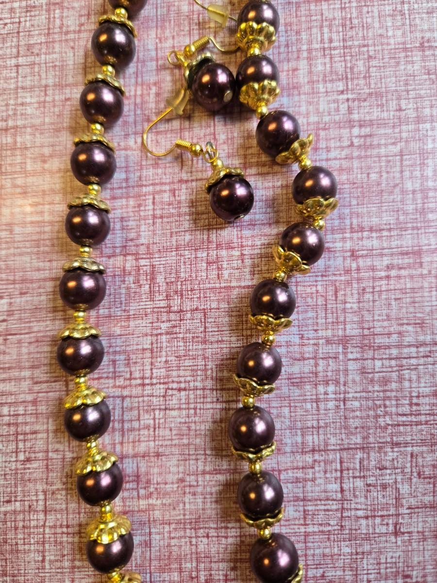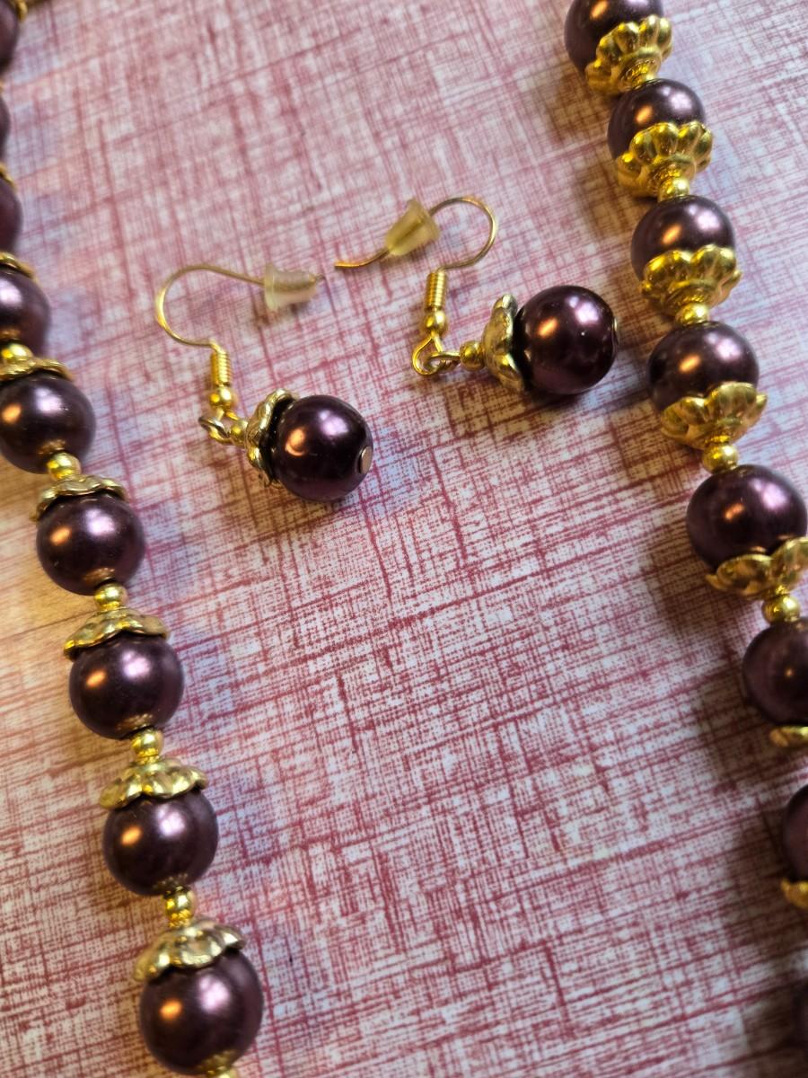 Matching necklace & pierced earring set. Purple looking pearls with gold spacers, wire dangle matching earrings. Very pretty! 12"