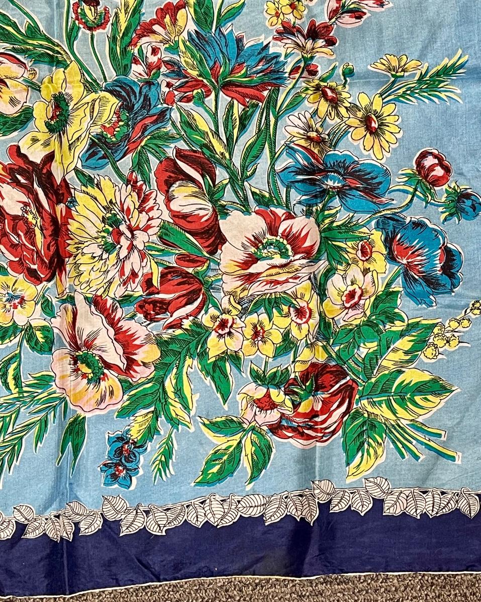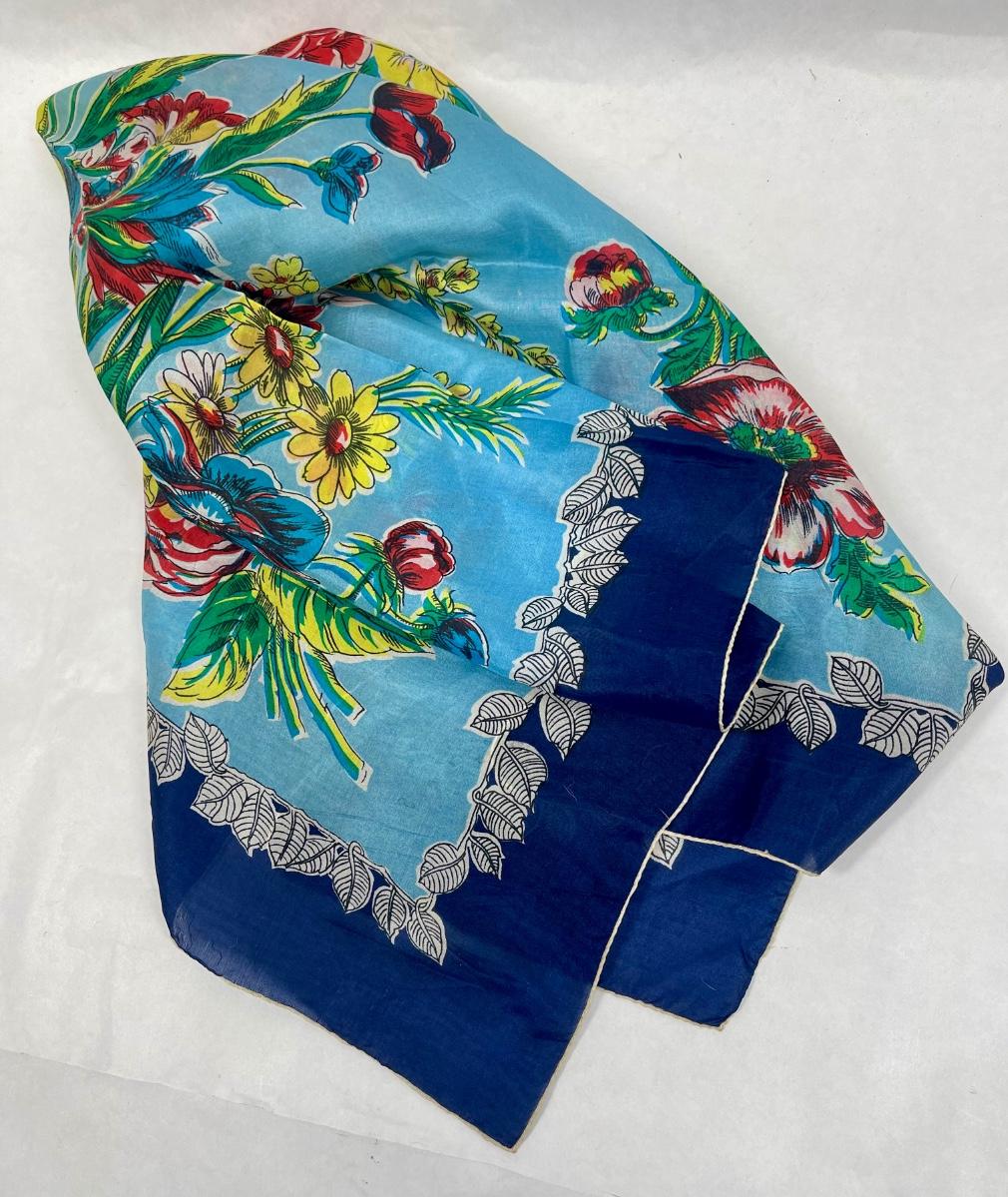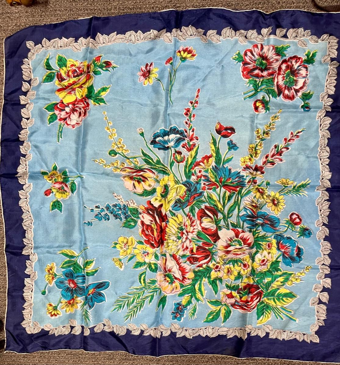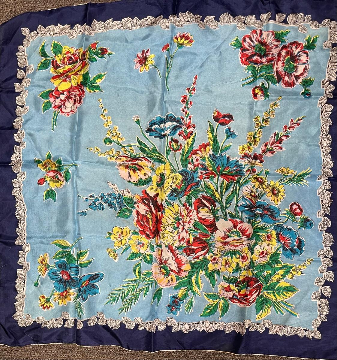 Blue scarf with multi-colored Floral Bouquet 30" square
