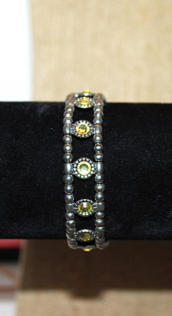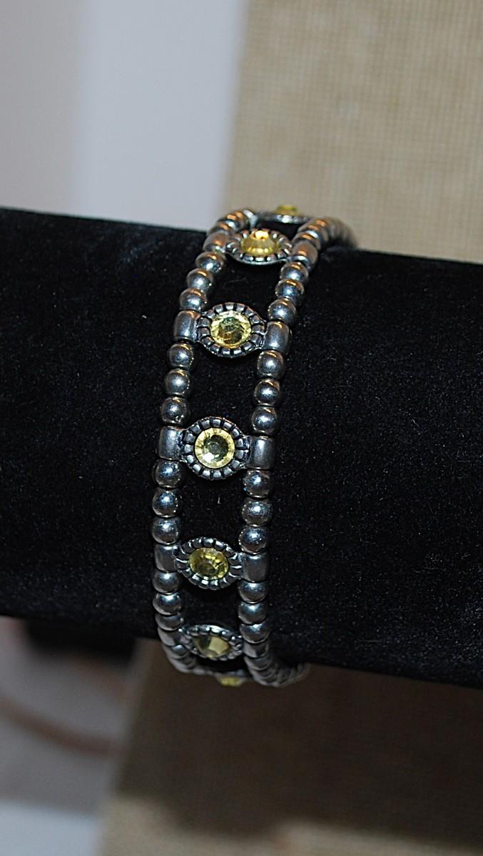 Pretty Yellow Green Round Stones Elastic BRACELET (2¼" Opening) with Silver Tone Globes & Barrels Accent CHAIN