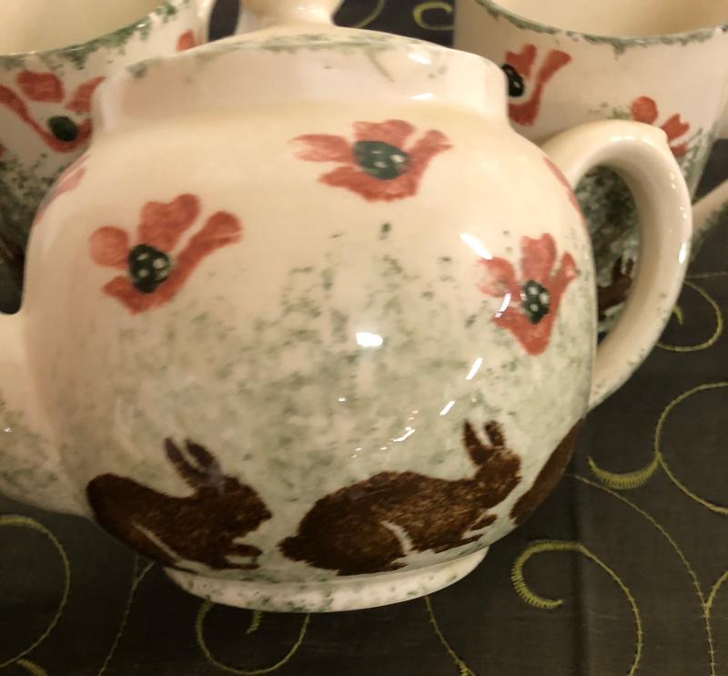 Hand painted Bunny motif on this Tea Set from the Price & Kensington Potteries of England....Very good condition...includes four mugs....as shown...
