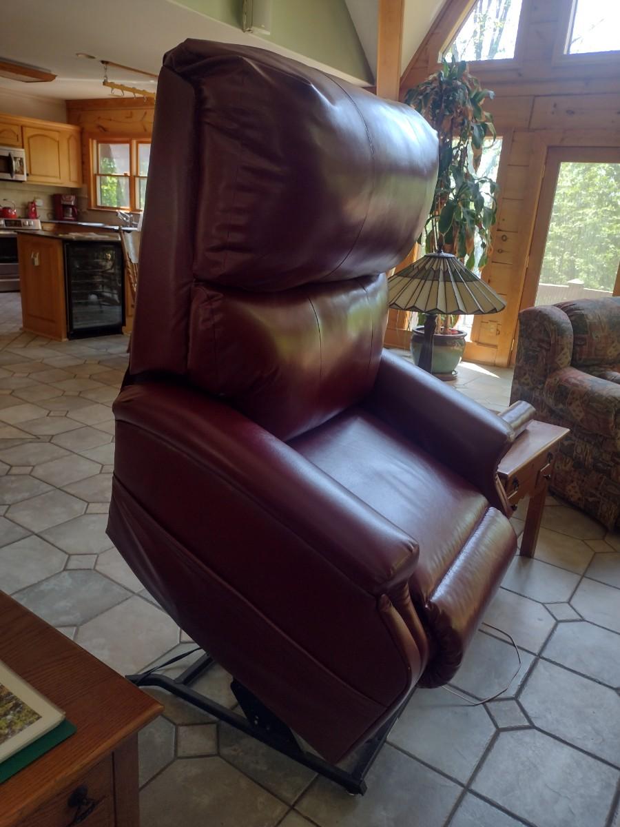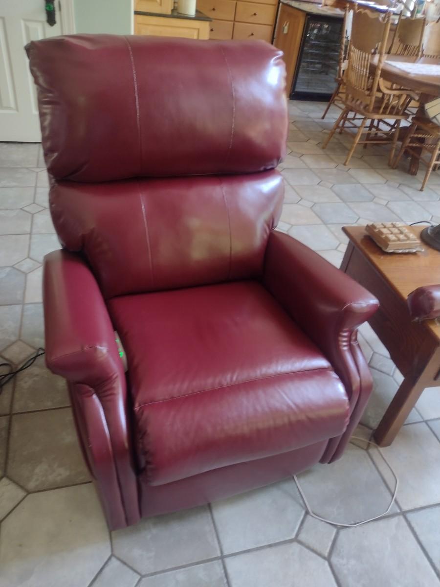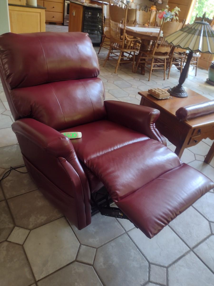 Pride Brand Faux Leather Lift/Recliner with Separate Controls for Footrest and Reclining Back. Has some claw picks from a cat as shown. No tears or shredding noted.