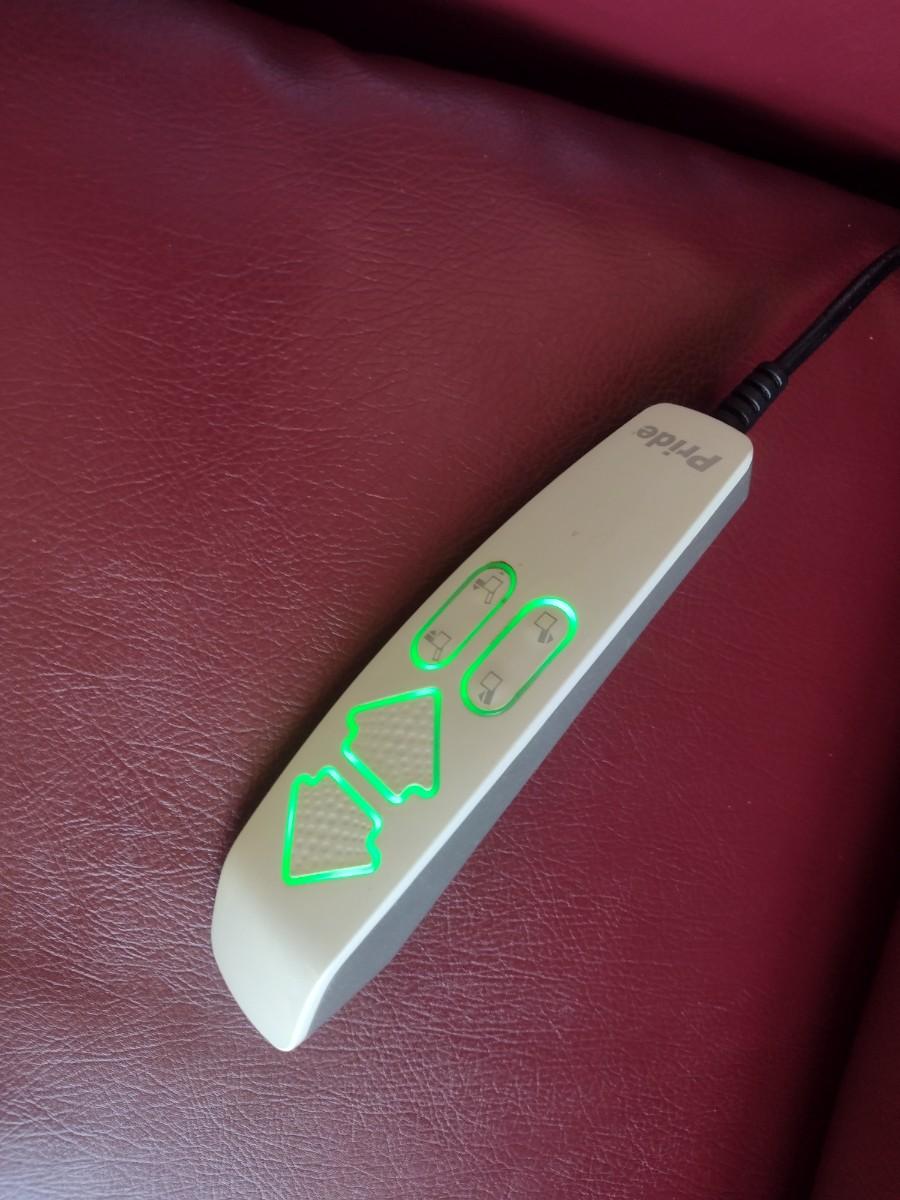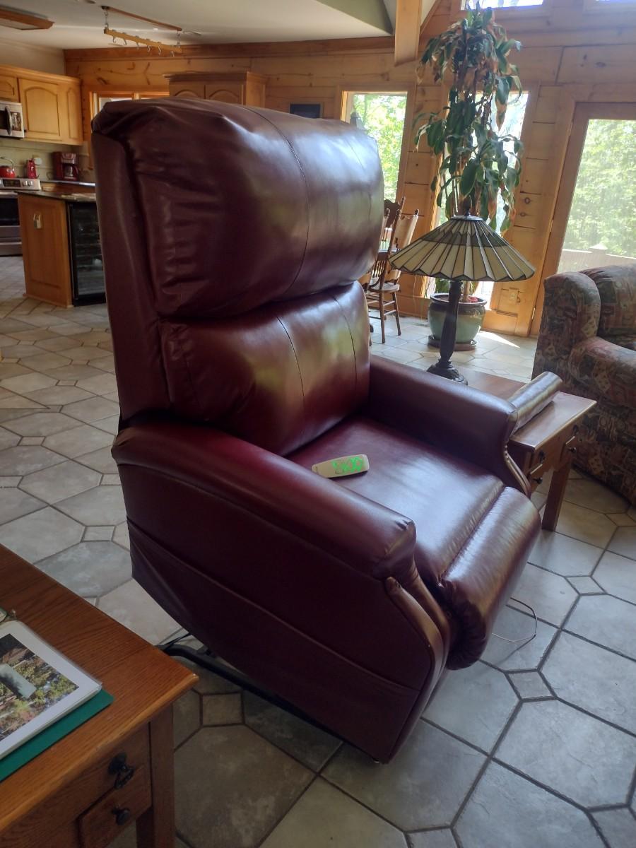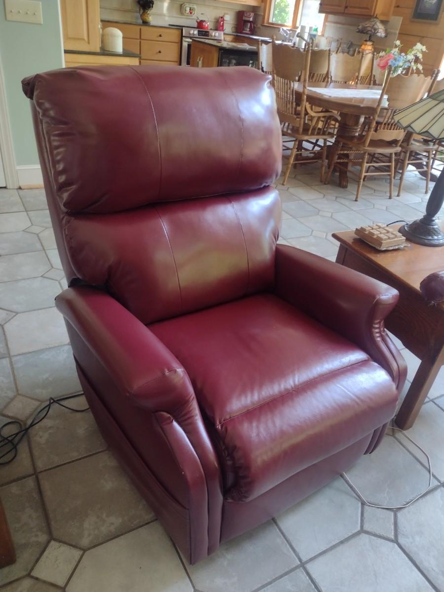 Pride Brand Faux Leather Lift/Recliner with Separate Controls for Footrest and Reclining Back. Has some claw picks from a cat as shown. No tears or shredding noted.