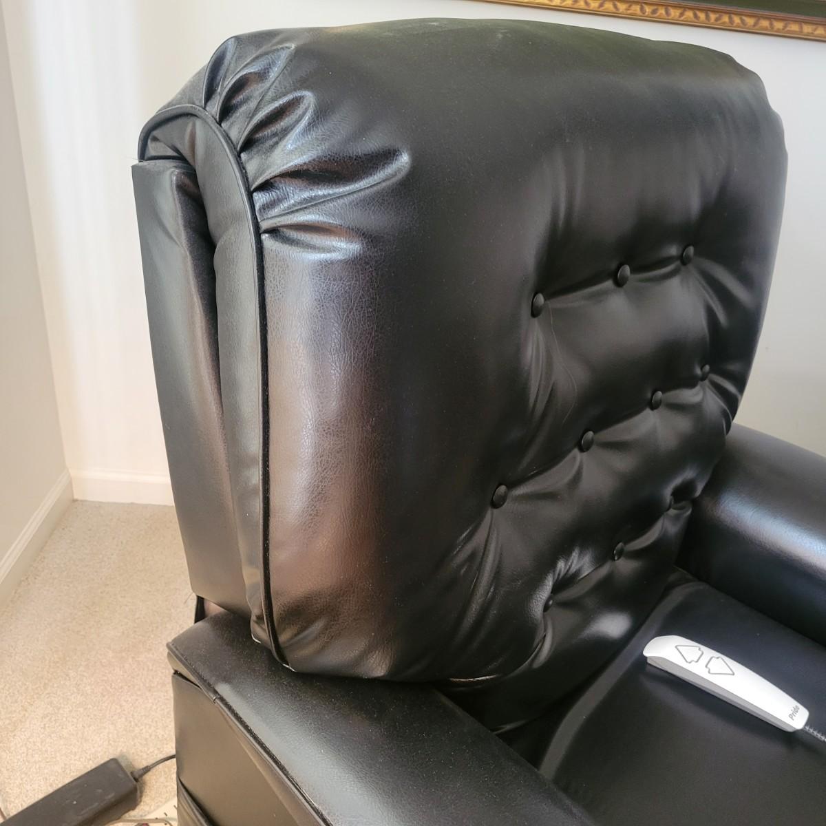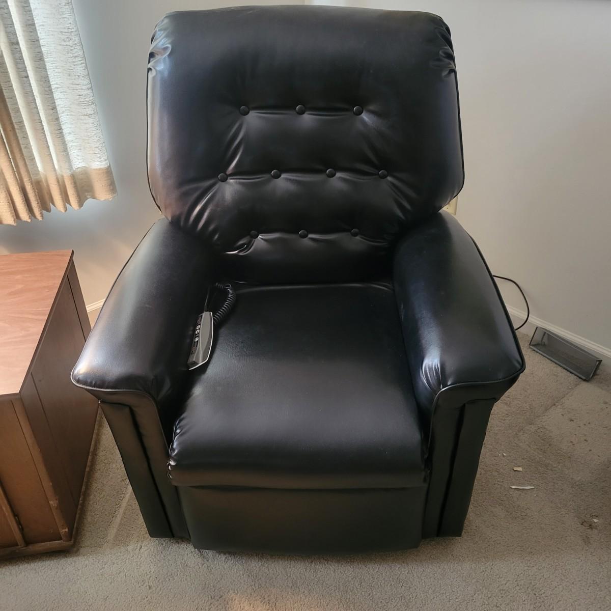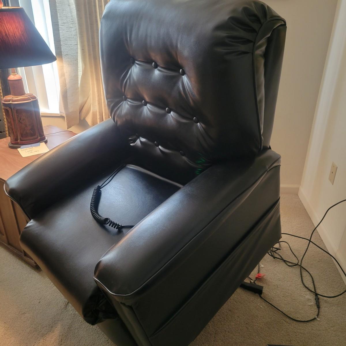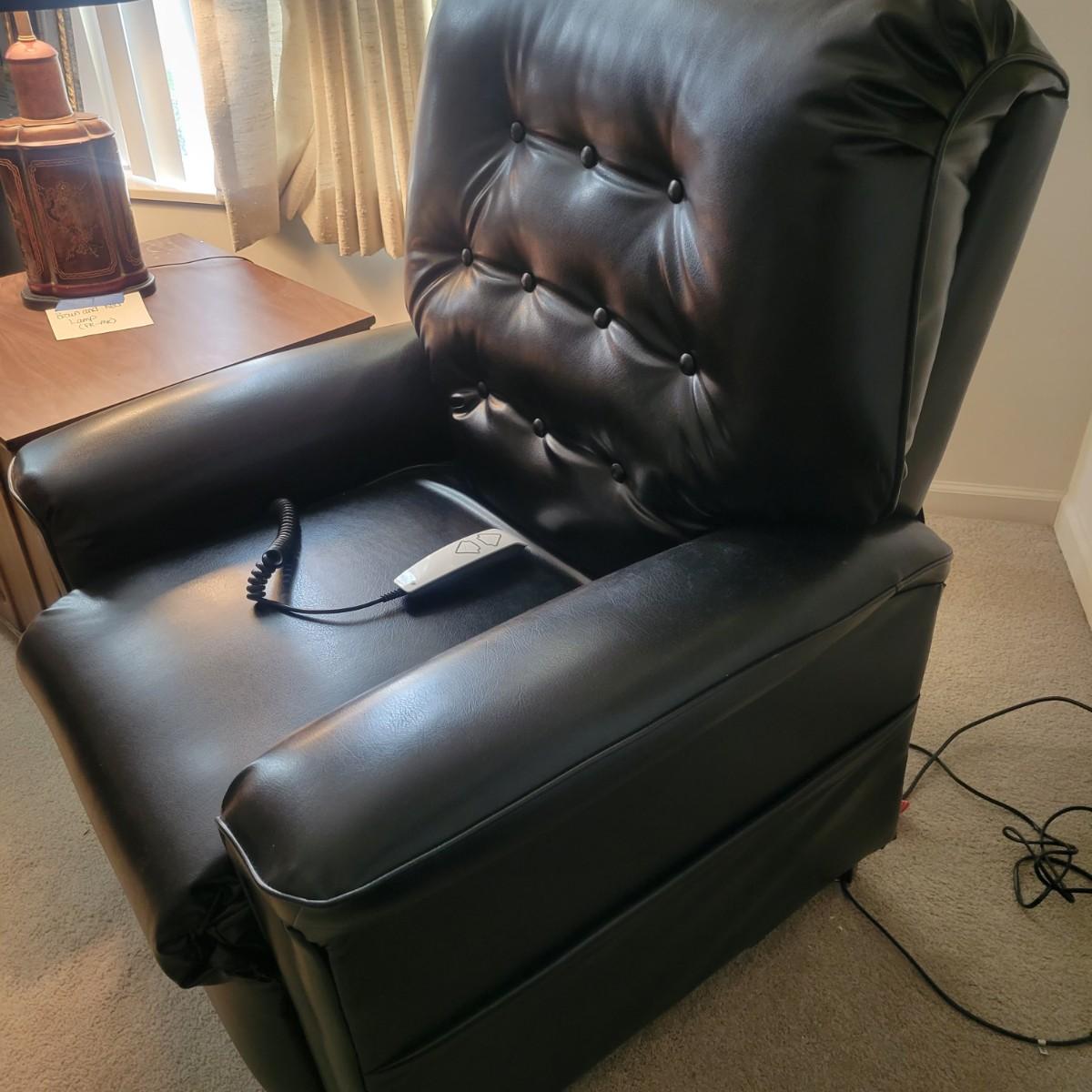 A Pride power lift recliner that powered on when plugged in. This recliner is made of a soft faux leather and has a motorized lift and reclining functions. It measures approximately 33.5" x 34" x 40"H with a seat height of 18". Local pickup only. Winning bidder must bring assistance to help move and load this item due to its weight and/or size.