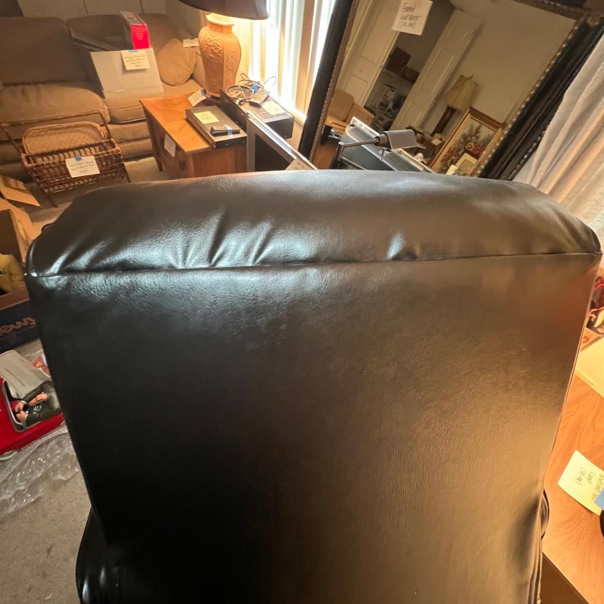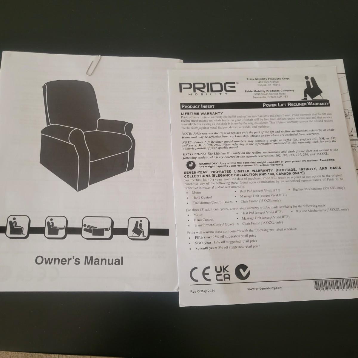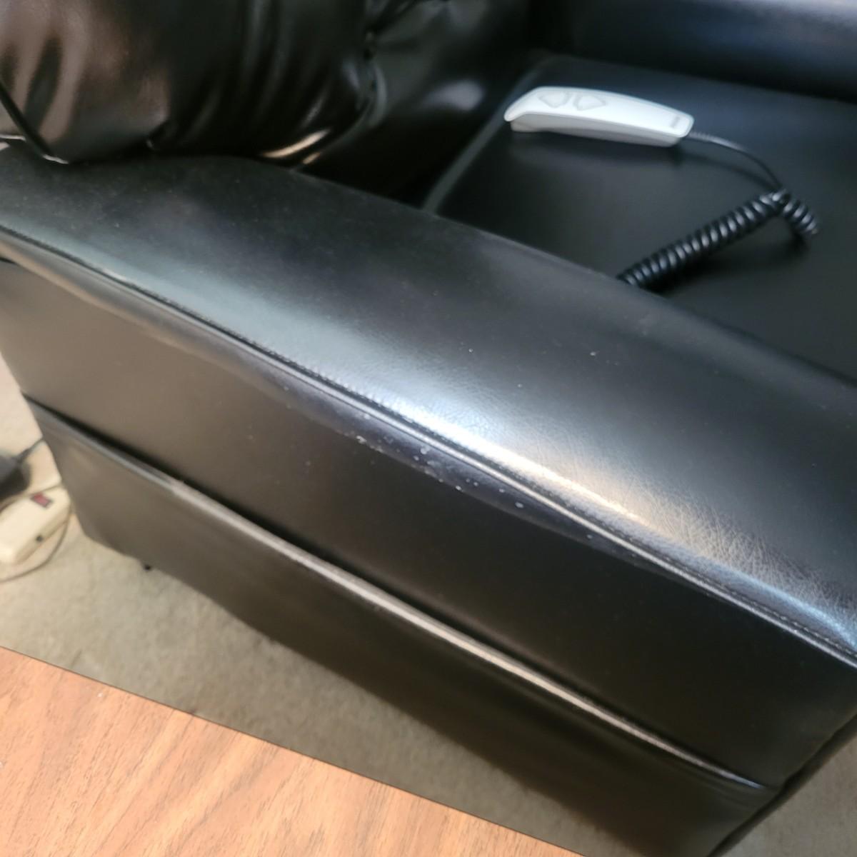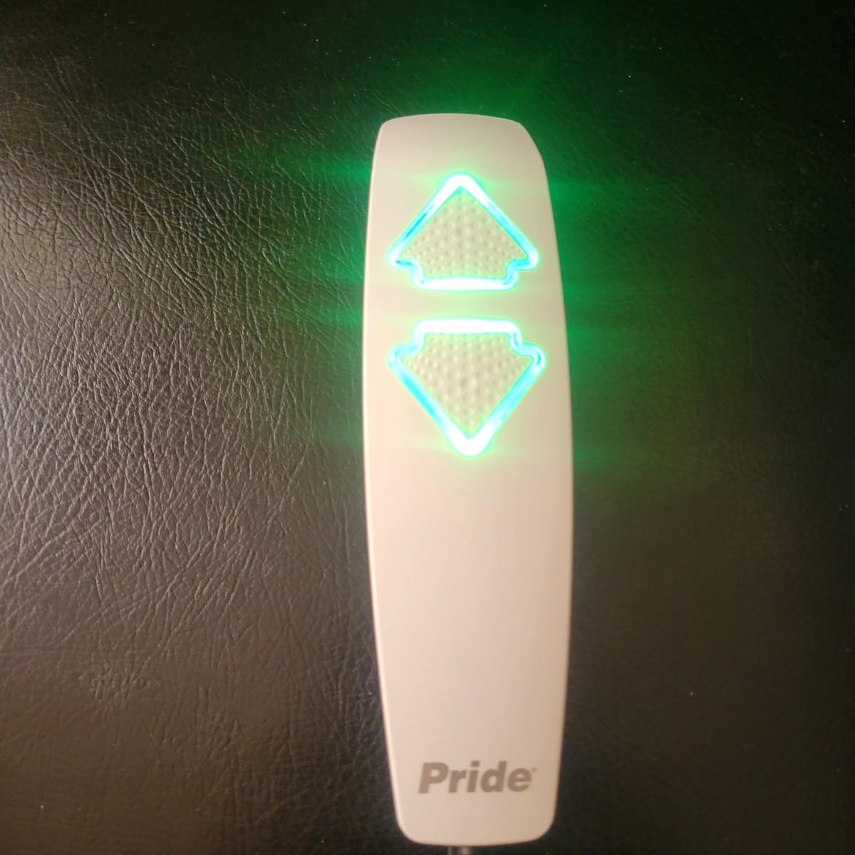 A Pride power lift recliner that powered on when plugged in. This recliner is made of a soft faux leather and has a motorized lift and reclining functions. It measures approximately 33.5" x 34" x 40"H with a seat height of 18". Local pickup only. Winning bidder must bring assistance to help move and load this item due to its weight and/or size.