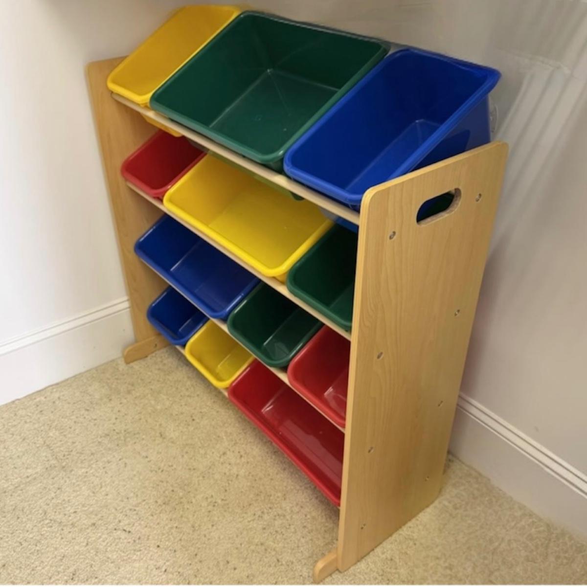 Primary color toy organizer. The base is made out of manufactured wood and the bins are plastic. It measures 34” x 15.5” x34”H. The bins are made up of two different sizes, the smaller measuring 8” x 11.5” x 5”H. It’s pretty lightweight and has handles on each side. Local pick up only.