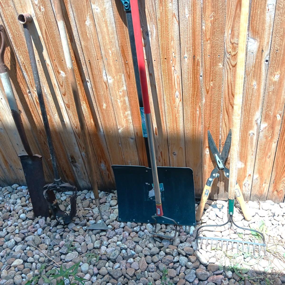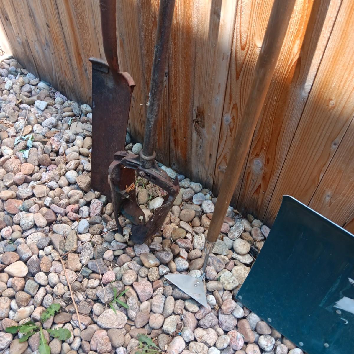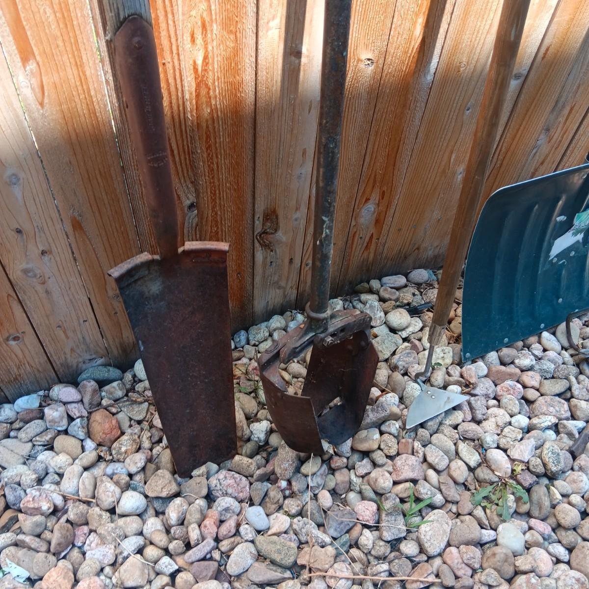 PRIMATIVE SHOVEL AND OTHER YARD TOOLS