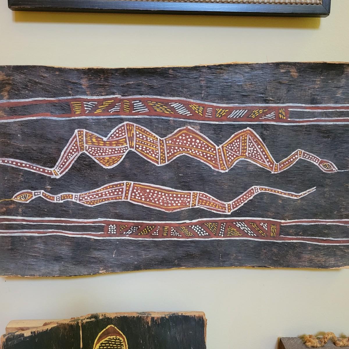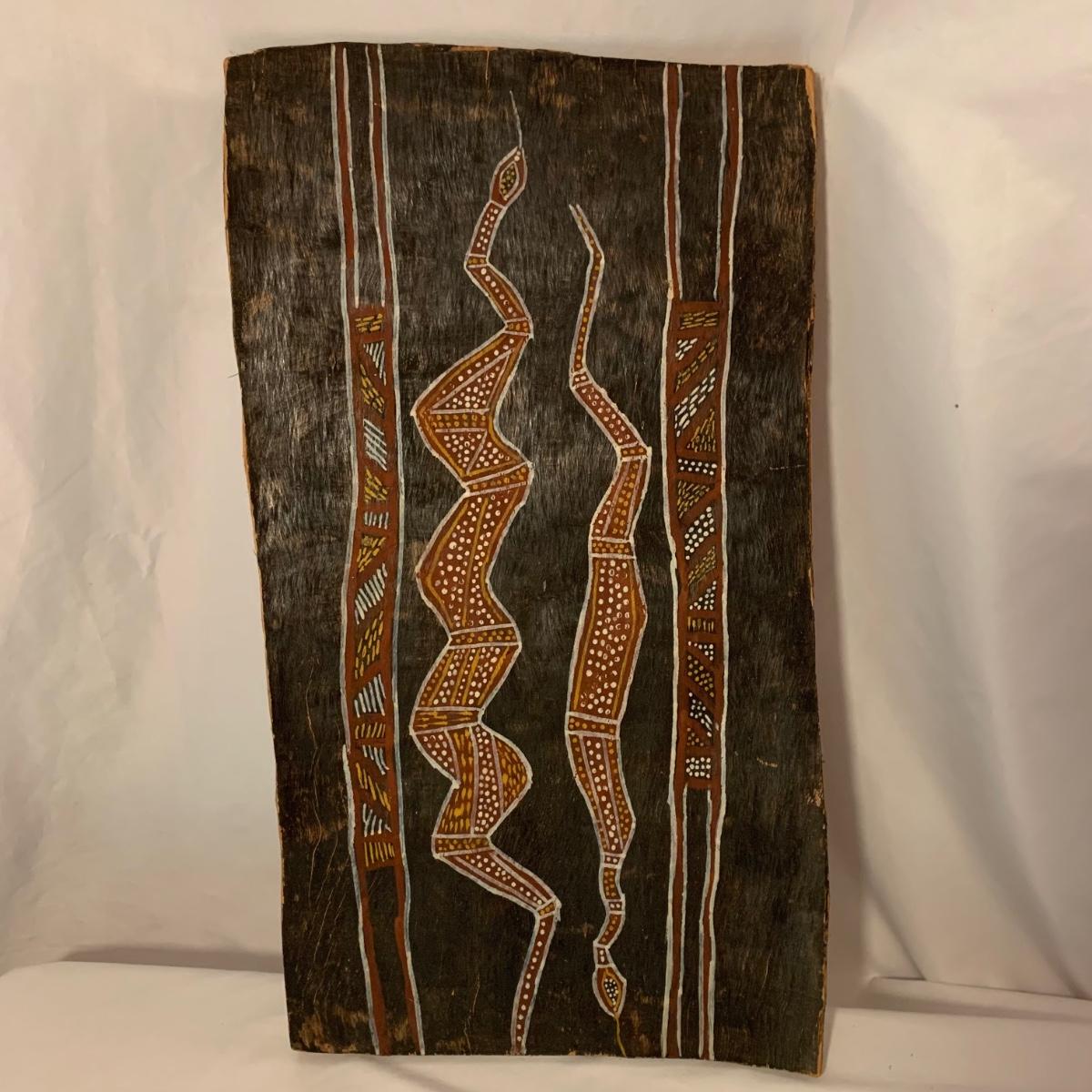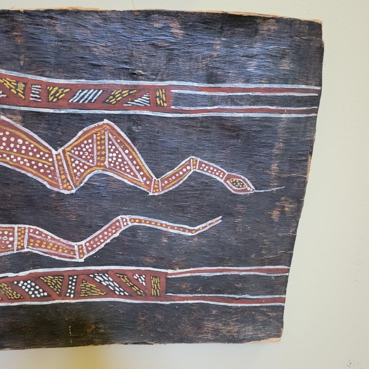 According to the seller, this is an authentic piece of Australian aboriginal art depicting snakes that is painted on bark. This piece is attached to a stretcher bar for hanging and protection of the piece. It measures approximately 22" x 1" x 12.5". Shipping available. Shipping art can be costly. We suggest contacting our preferred local shipping provider, Postage Express, with dimensions and getting an estimate before bidding: (828) 670-5501 or postageexpress@yahoo.com.