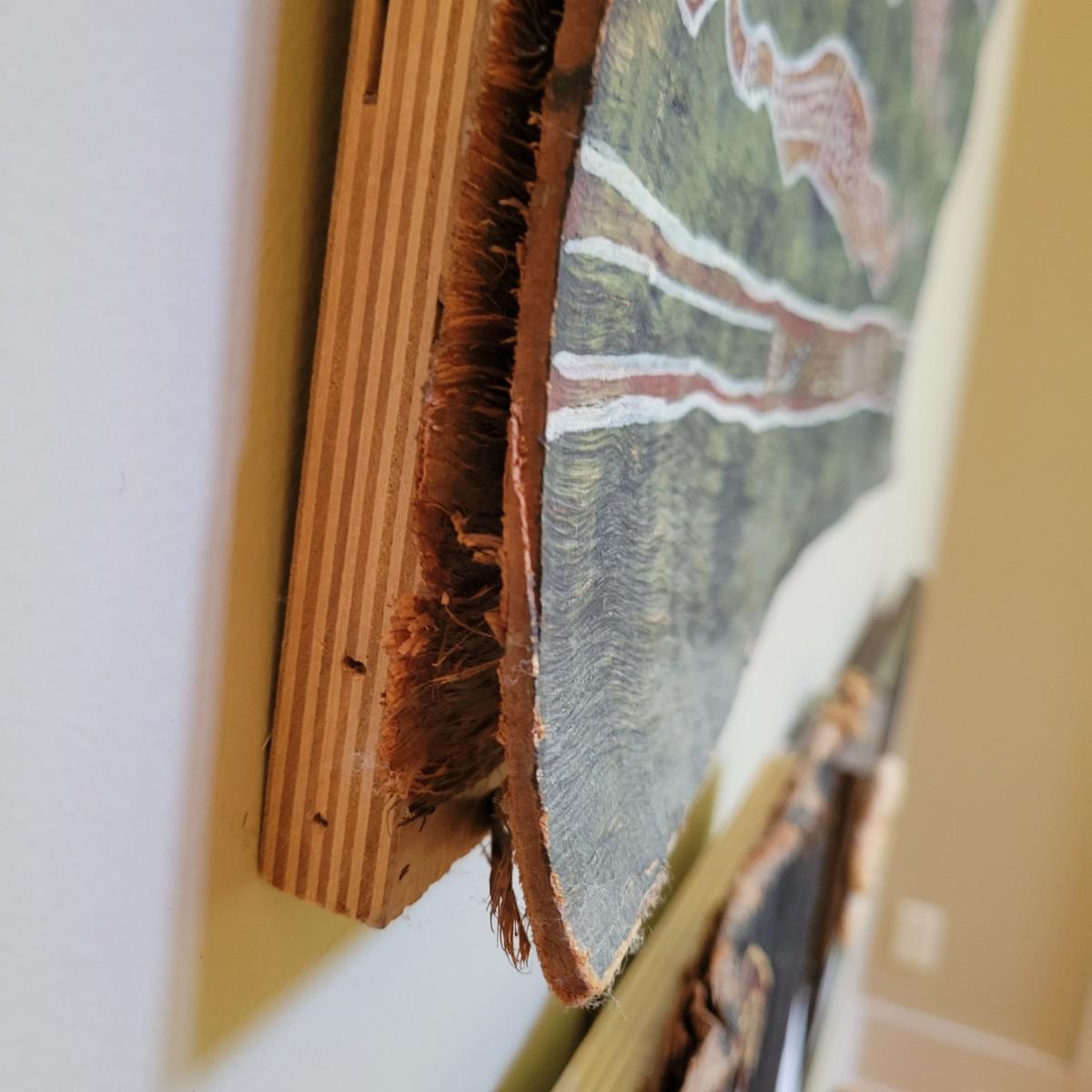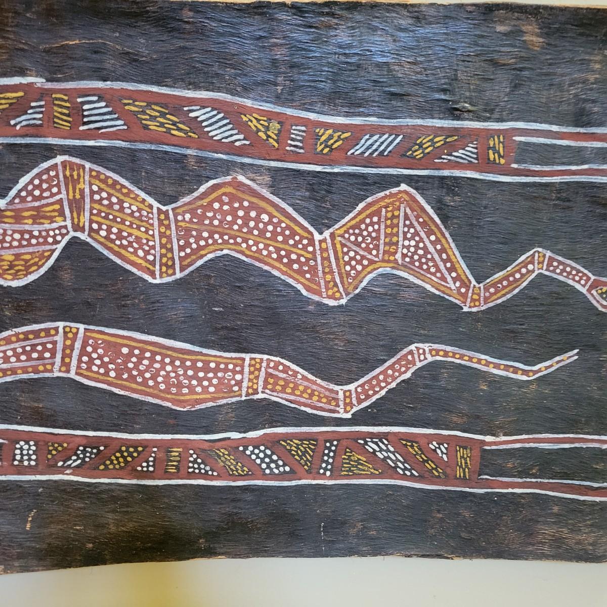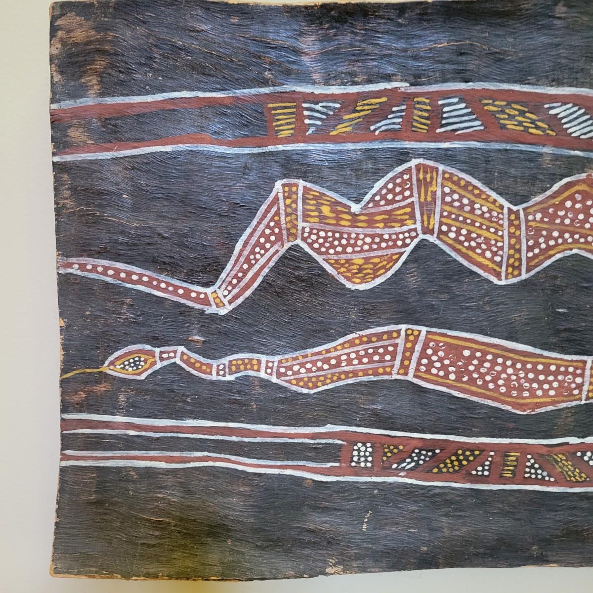 According to the seller, this is an authentic piece of Australian aboriginal art depicting snakes that is painted on bark. This piece is attached to a stretcher bar for hanging and protection of the piece. It measures approximately 22" x 1" x 12.5". Shipping available. Shipping art can be costly. We suggest contacting our preferred local shipping provider, Postage Express, with dimensions and getting an estimate before bidding: (828) 670-5501 or postageexpress@yahoo.com.