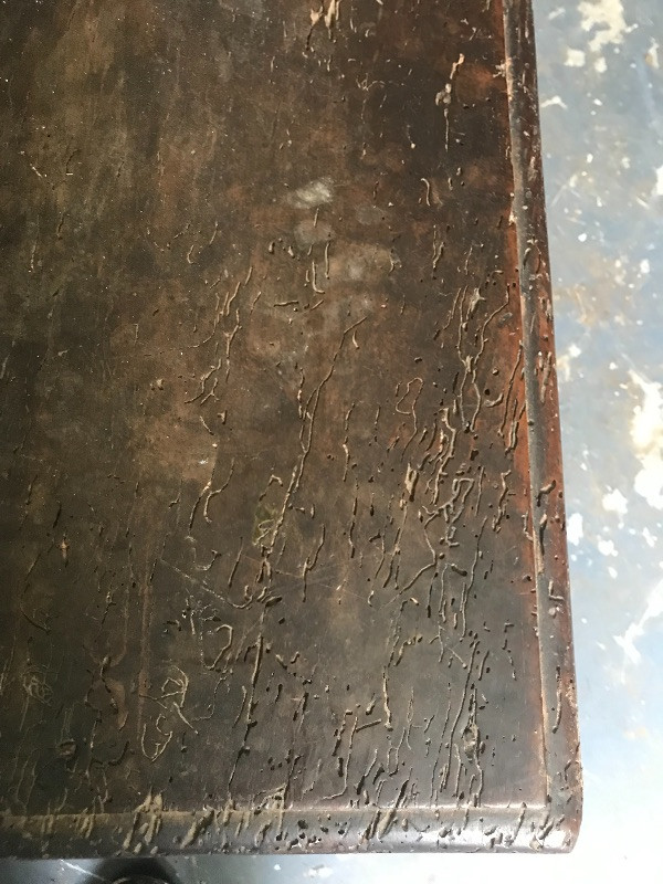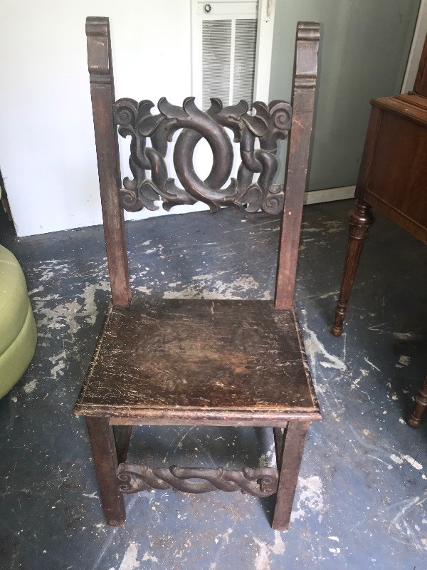 This is a very old antique side chair. There is a deep carving in the center back of the chair. It has the old worm holes in it which shows its age.