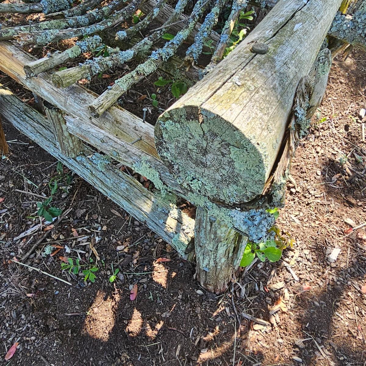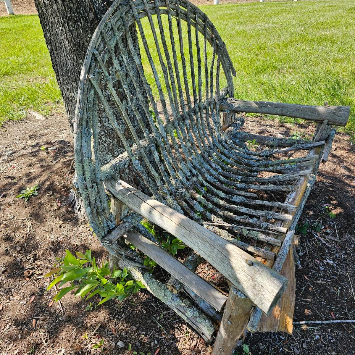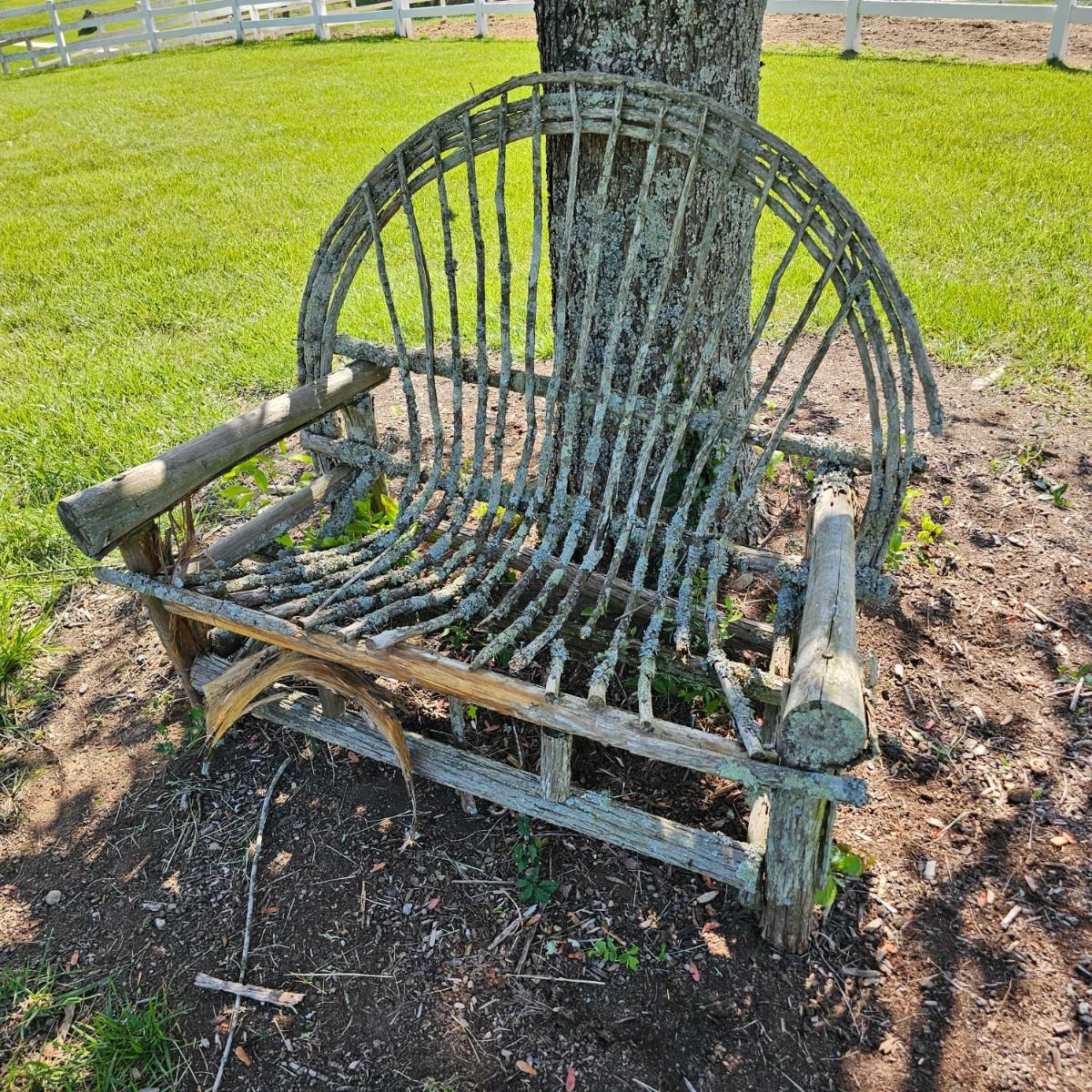 A very rustic looking bench made from logs and branches. Chair has curving, arched back, arms and a dipped seat. Measures 27" x 51" x 40"H, seat height 16". Very fragile, may only be suitable for yard decor. See photos for details. Local pickup only.