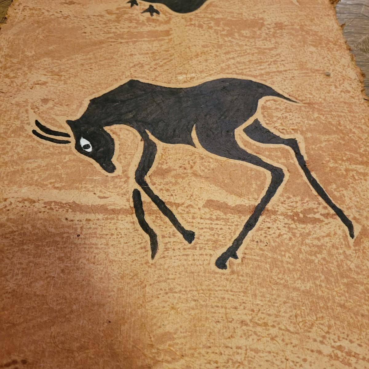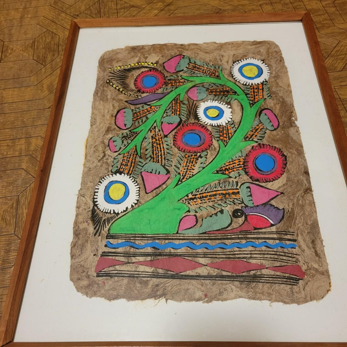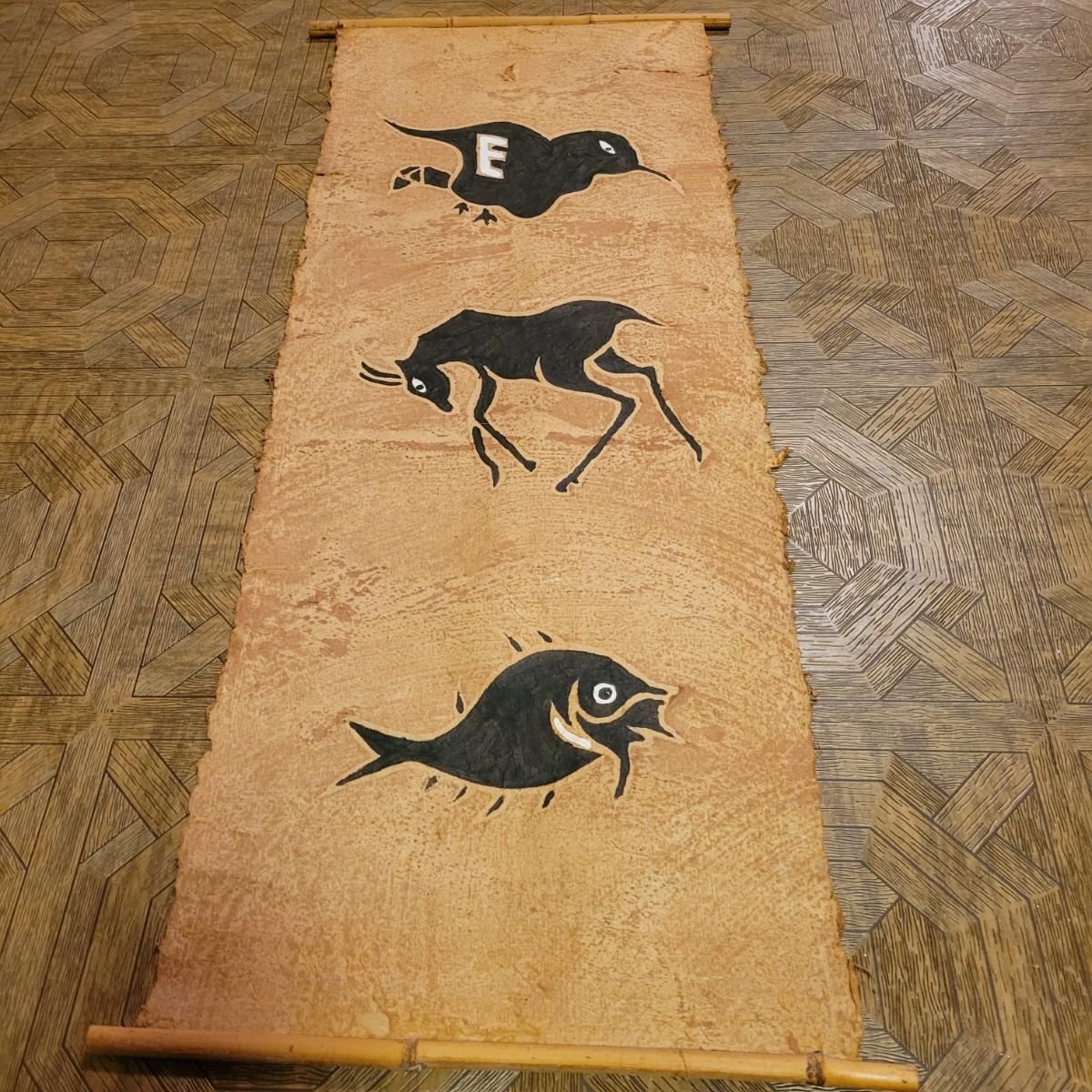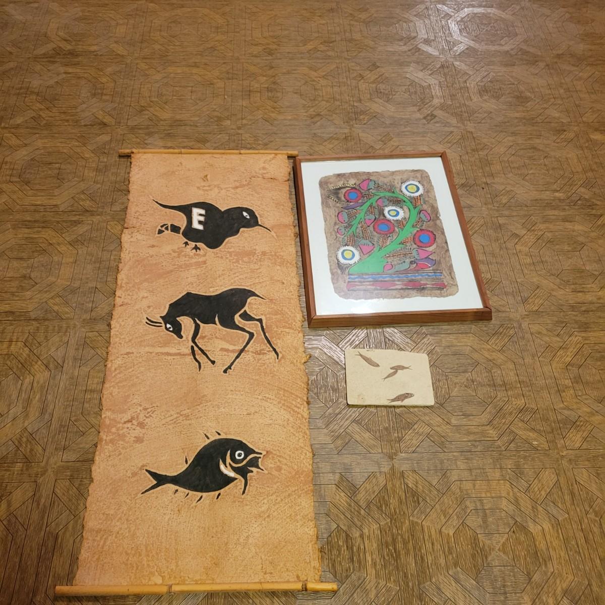 Two pieces of primitive art on bark and a fossil of fish. The smaller, more colorful piece is in a wood frame and top mounted on a mat. The larger piece is unframed, but has bamboo pieces at its top and bottom for hanging. Larger piece measures approximately 17.5" x 40". Shipping art can be costly. We suggest contacting our preferred local shipping provider, Postage Express, with dimensions and getting an estimate before bidding: (828) 670-5501 or postageexpress@yahoo.com.