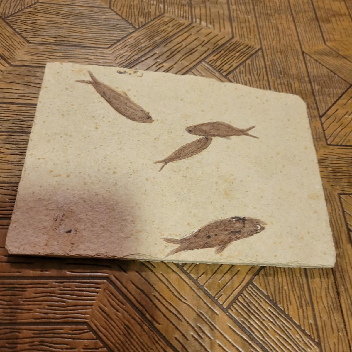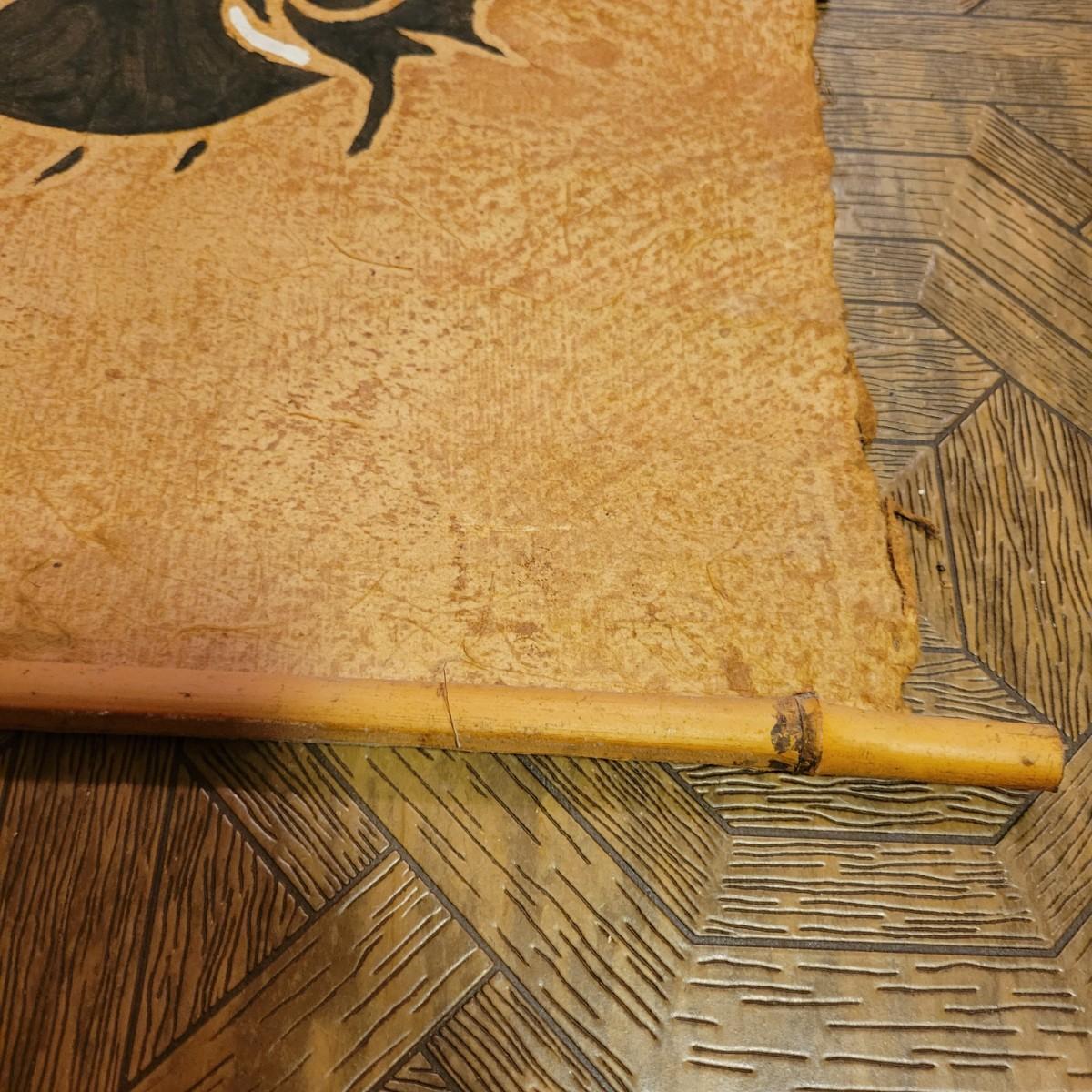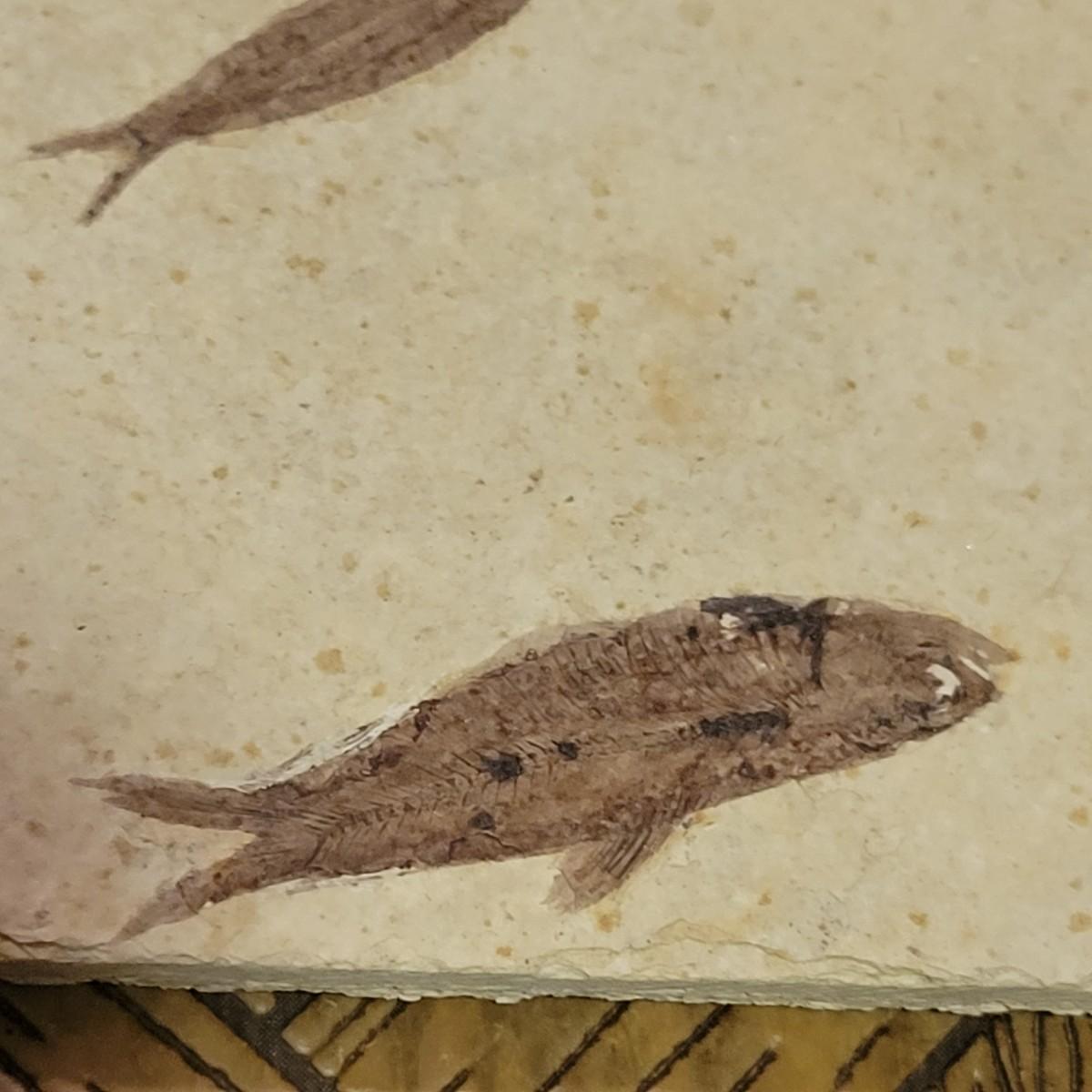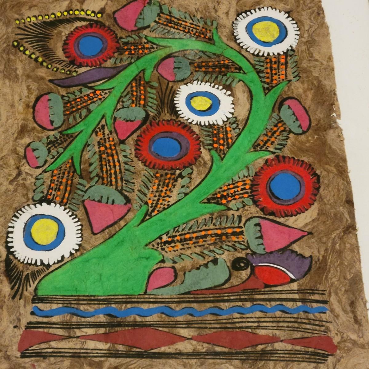 Two pieces of primitive art on bark and a fossil of fish. The smaller, more colorful piece is in a wood frame and top mounted on a mat. The larger piece is unframed, but has bamboo pieces at its top and bottom for hanging. Larger piece measures approximately 17.5" x 40". Shipping art can be costly. We suggest contacting our preferred local shipping provider, Postage Express, with dimensions and getting an estimate before bidding: (828) 670-5501 or postageexpress@yahoo.com.