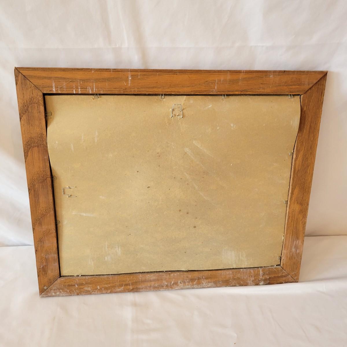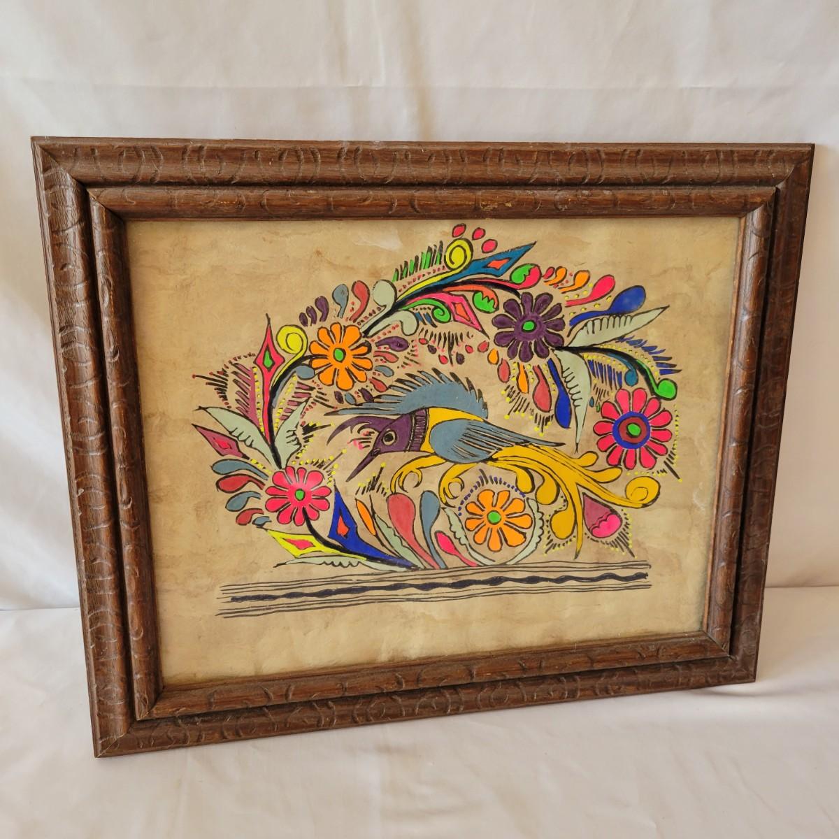 A colorful piece of original primitive art drawn on what appears to be a bark sheet. This piece is framed in wooden frame with carved details and measures approximately 16.5" x 14"H. Shipping available