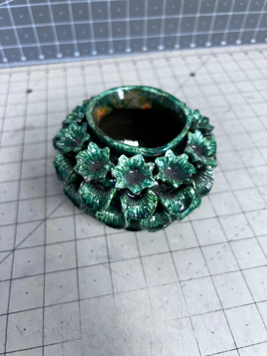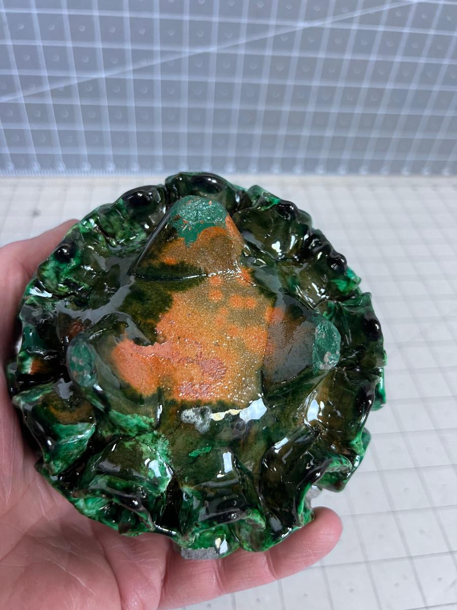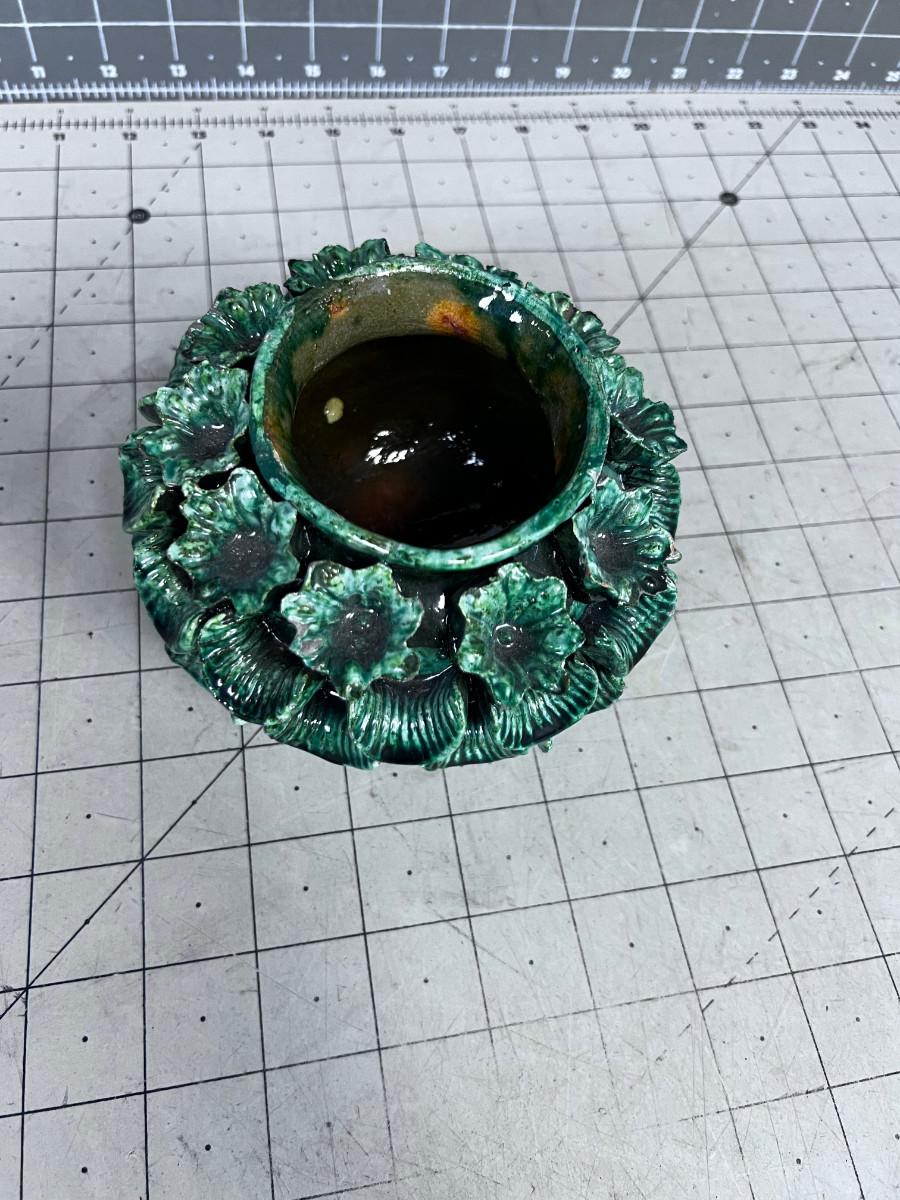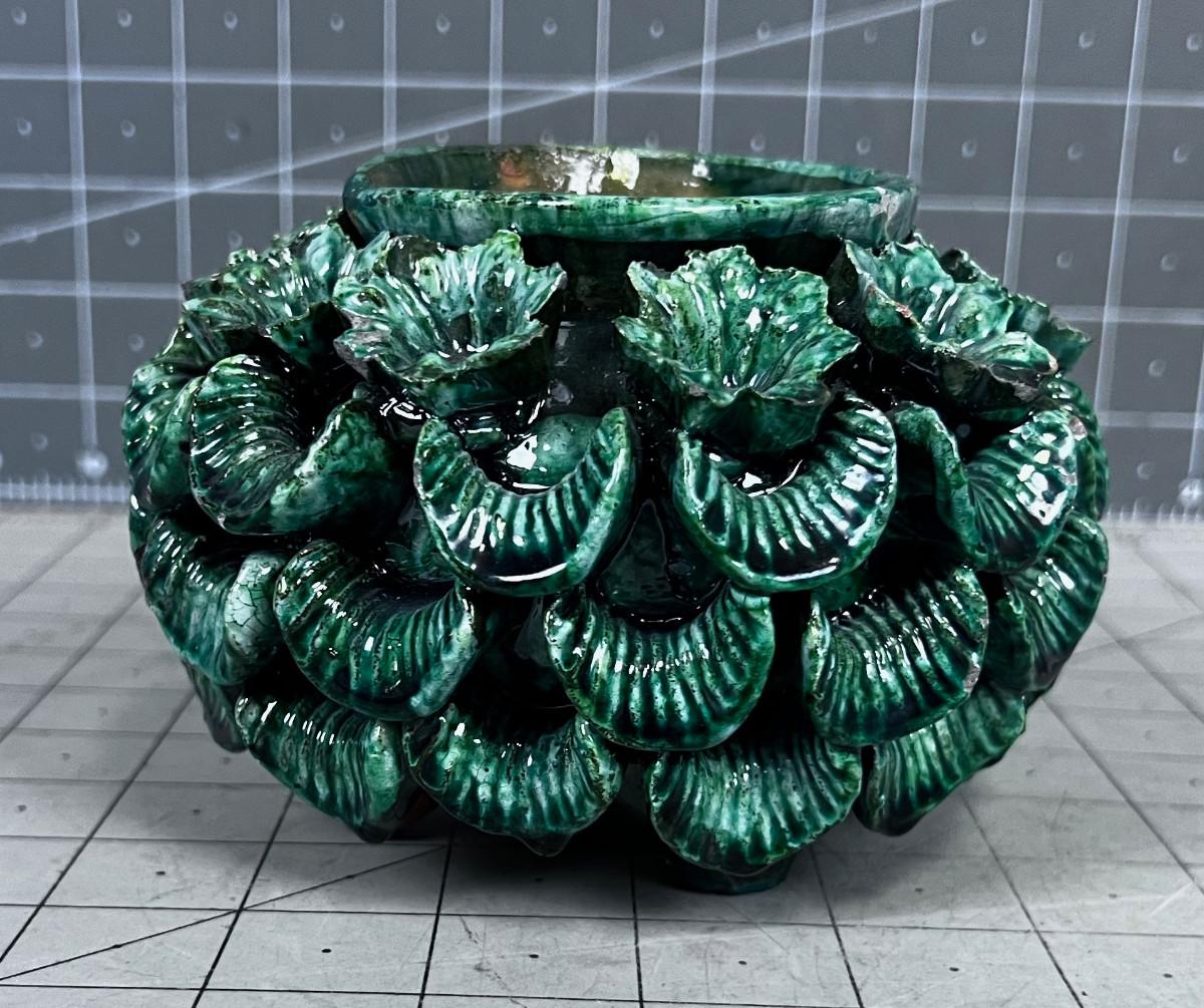 Primitive Brutalist Green Pineapple Like Majolica Footed Pot with Leaves