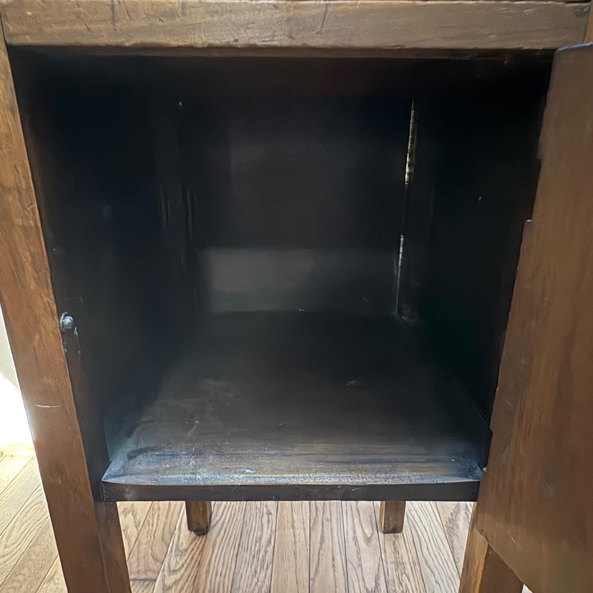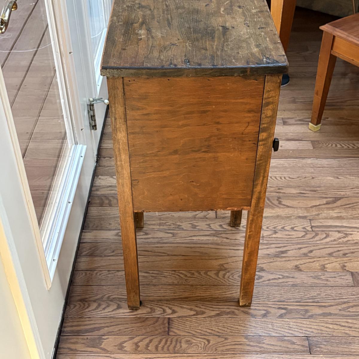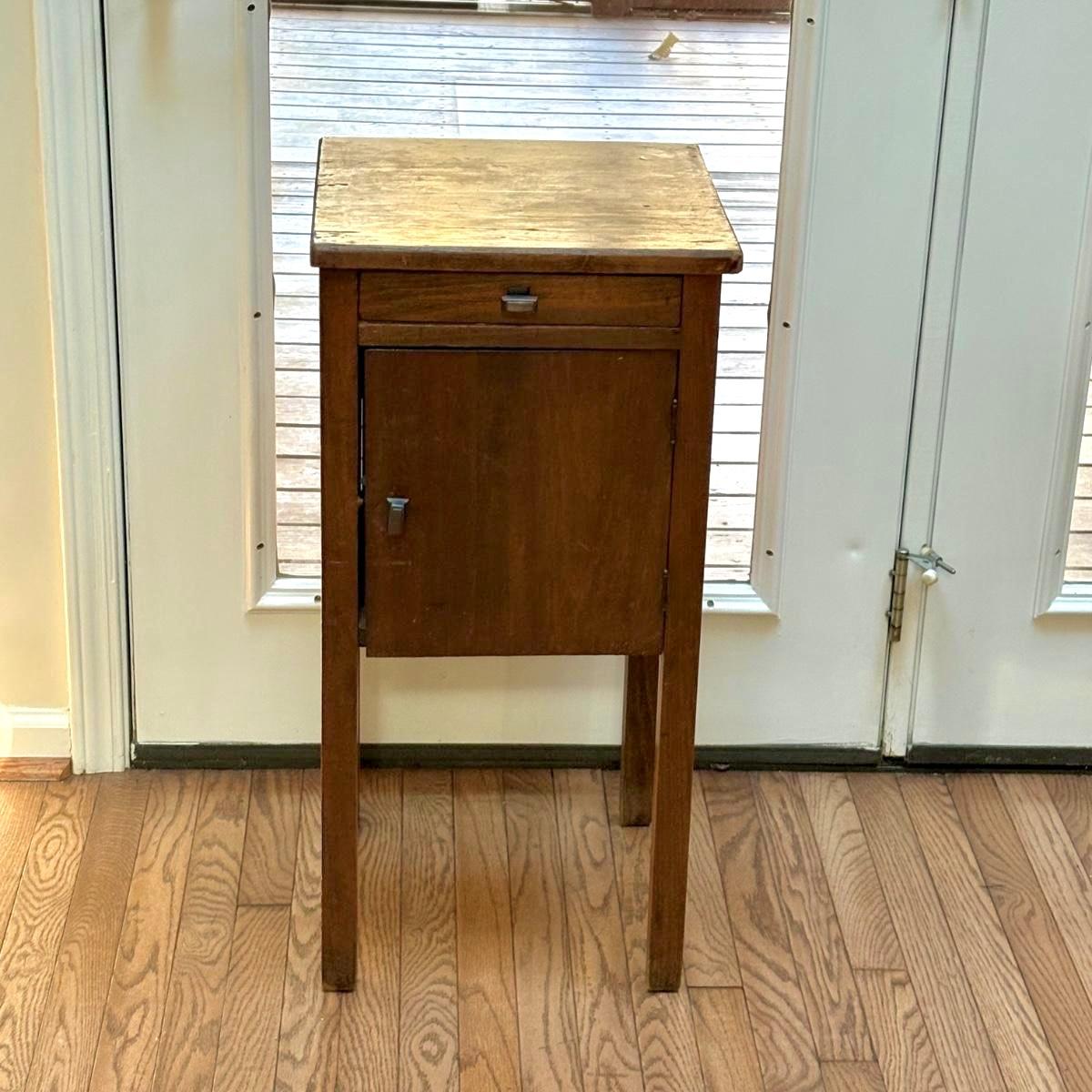 This wooden cabinet end table measures at approximately 15" x 15" x 30"H. It has blemishes, which adds to the rustic charm. Corner of drawer on left side is separating and wood on left side of cabinet is a bit lifted. See in pictures.