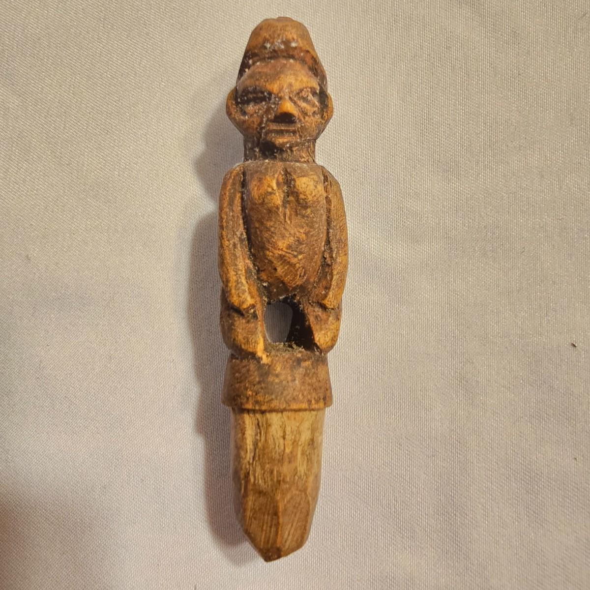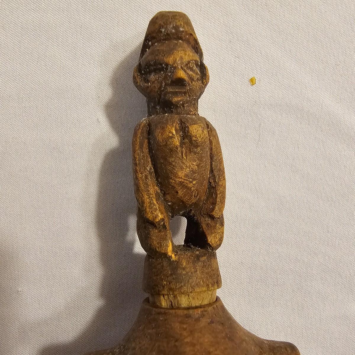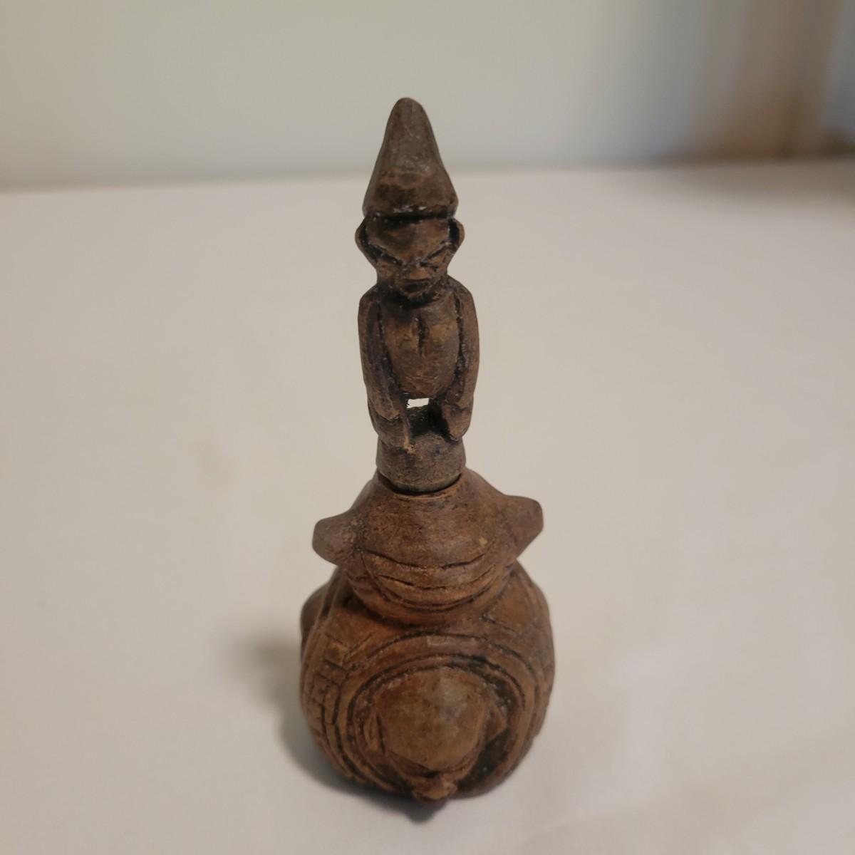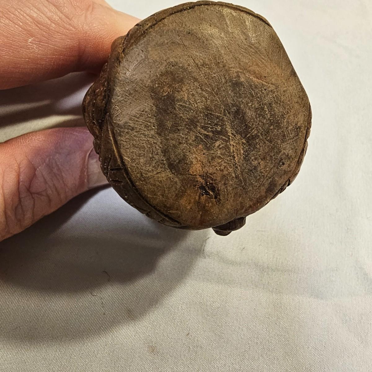 A hand carved wooden bottle with a full figure stopper and three faces in the base. Figure on stopper is kneeling, has hands on top of legs and a hat. Rest of bottle has cross hatch designs carved into it. Item is 2"D x 4.5"H. Shipping available.