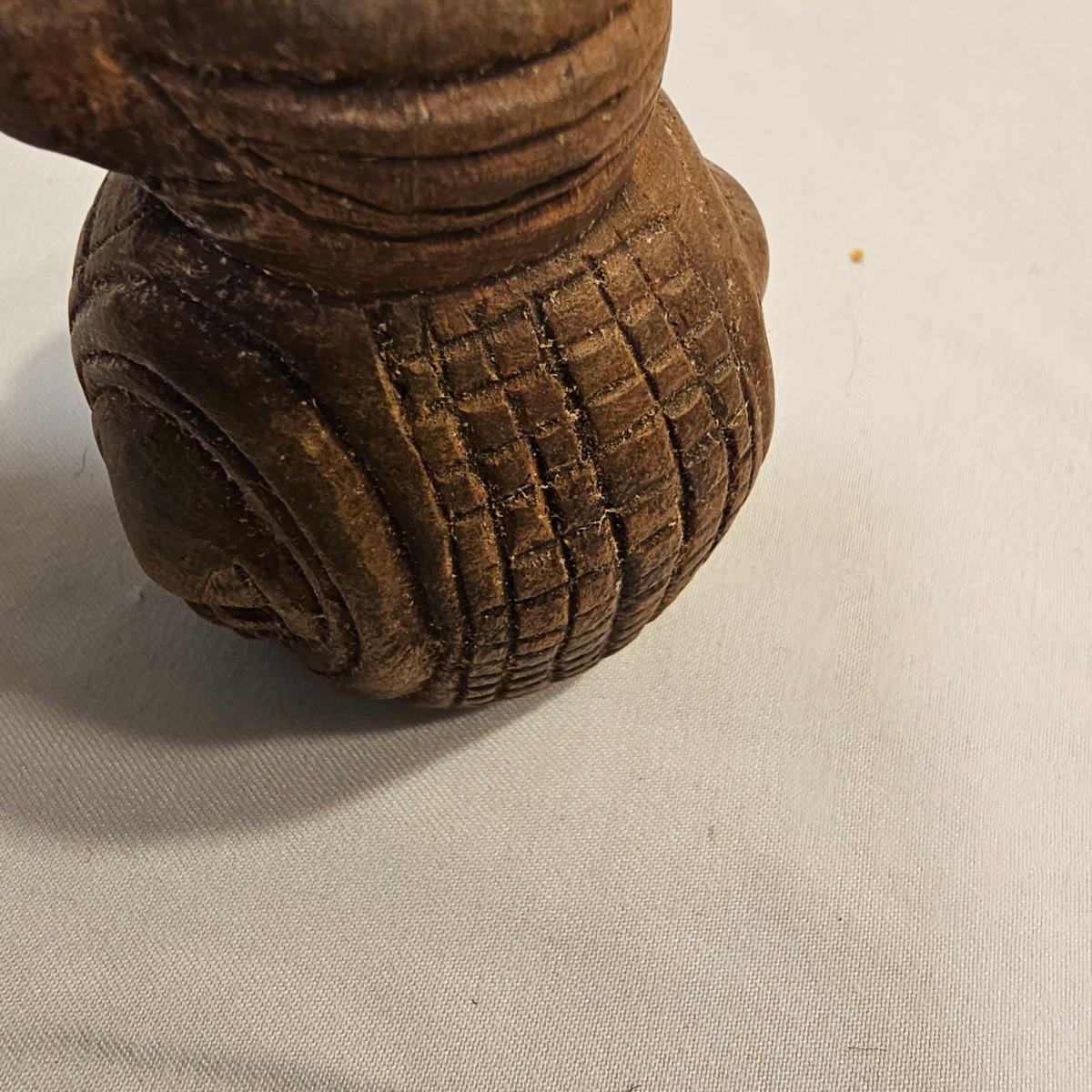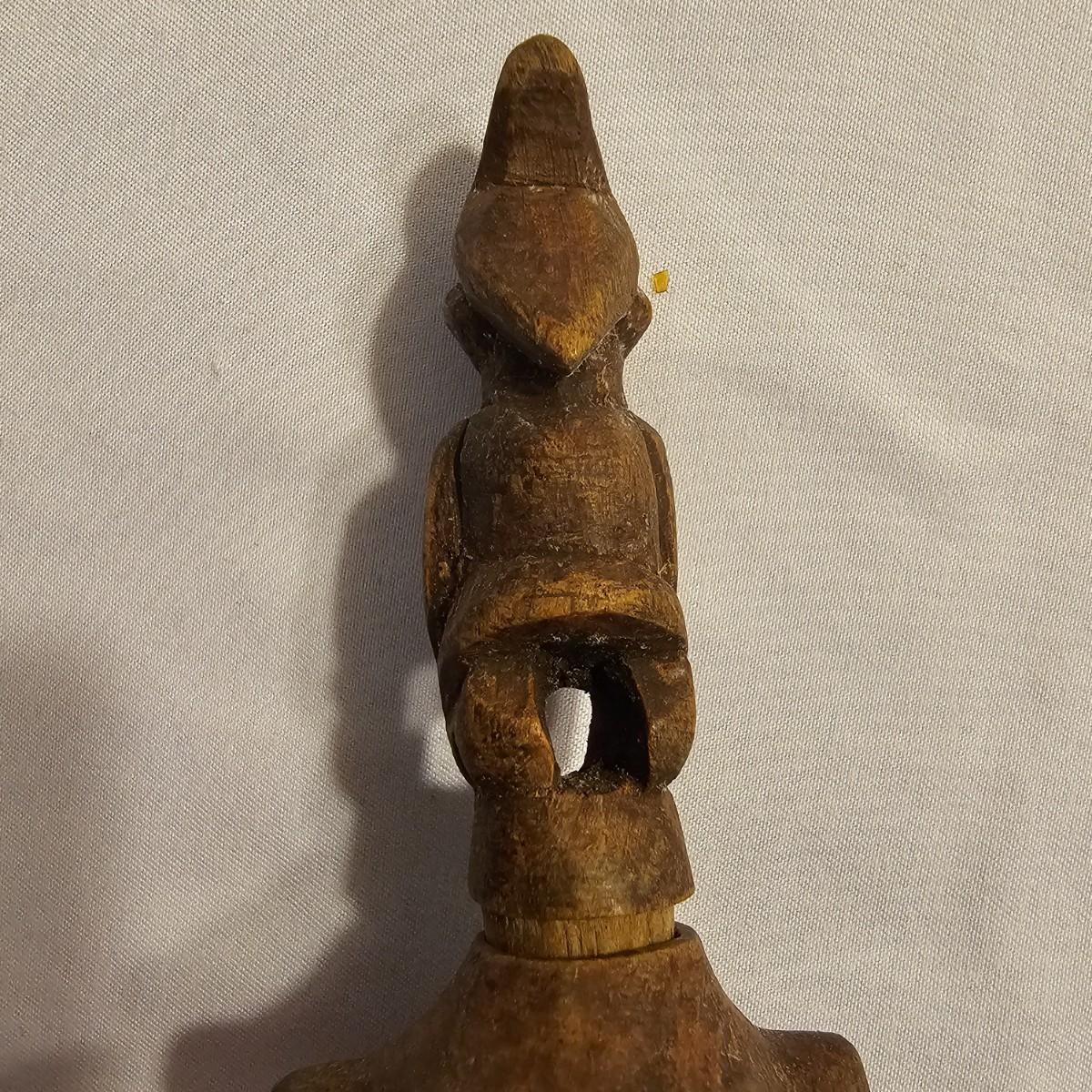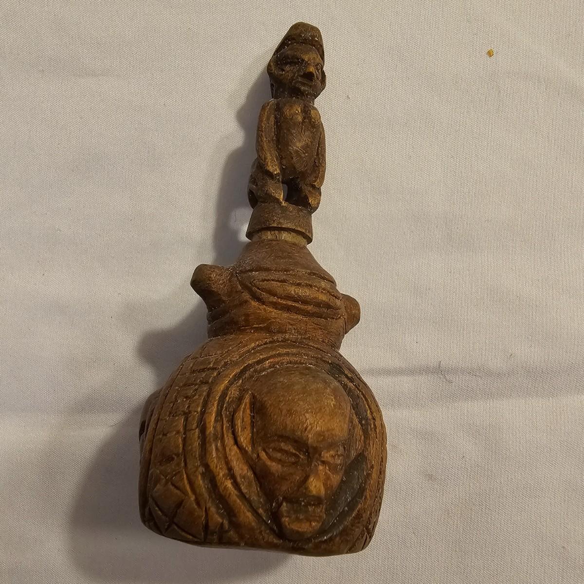 A hand carved wooden bottle with a full figure stopper and three faces in the base. Figure on stopper is kneeling, has hands on top of legs and a hat. Rest of bottle has cross hatch designs carved into it. Item is 2"D x 4.5"H. Shipping available.