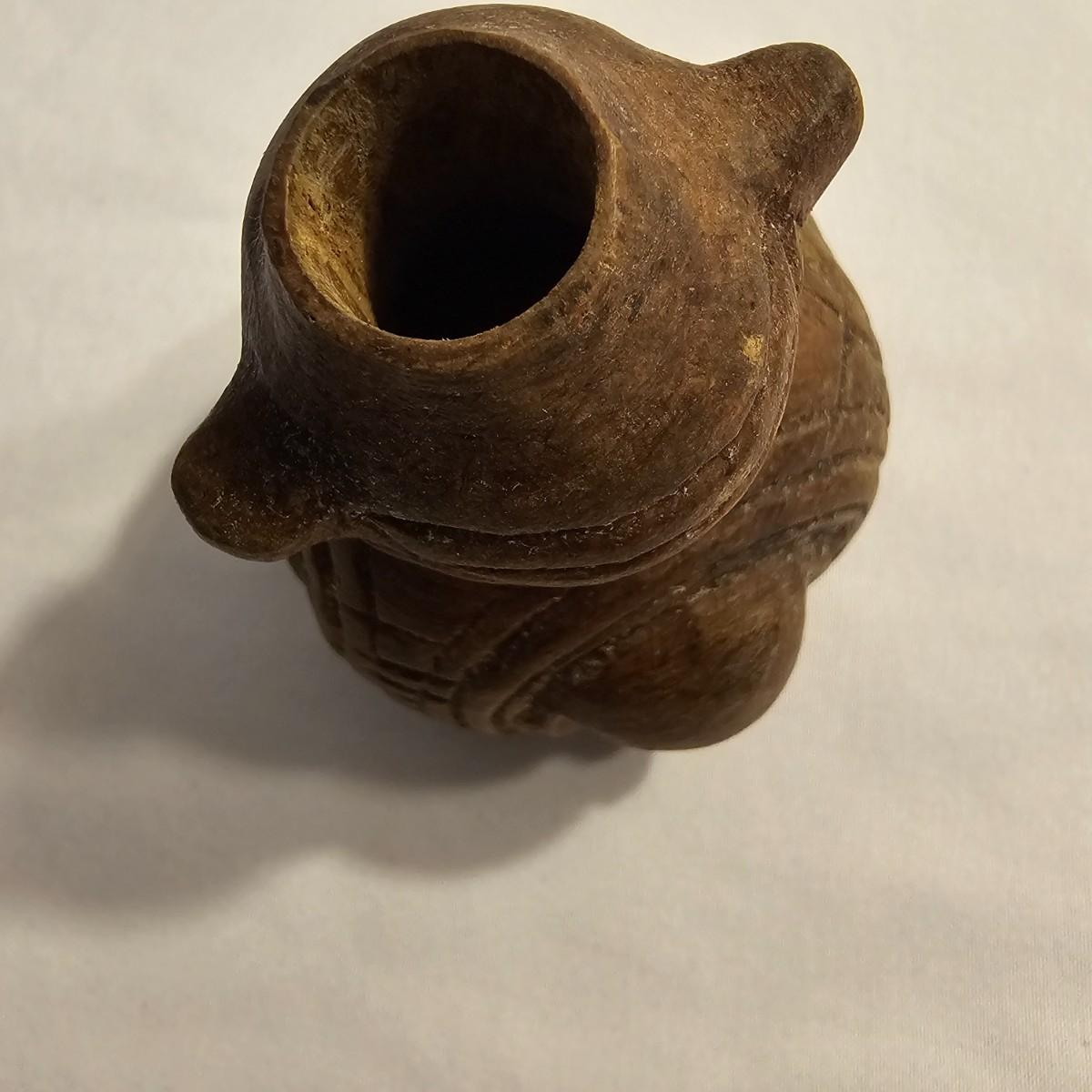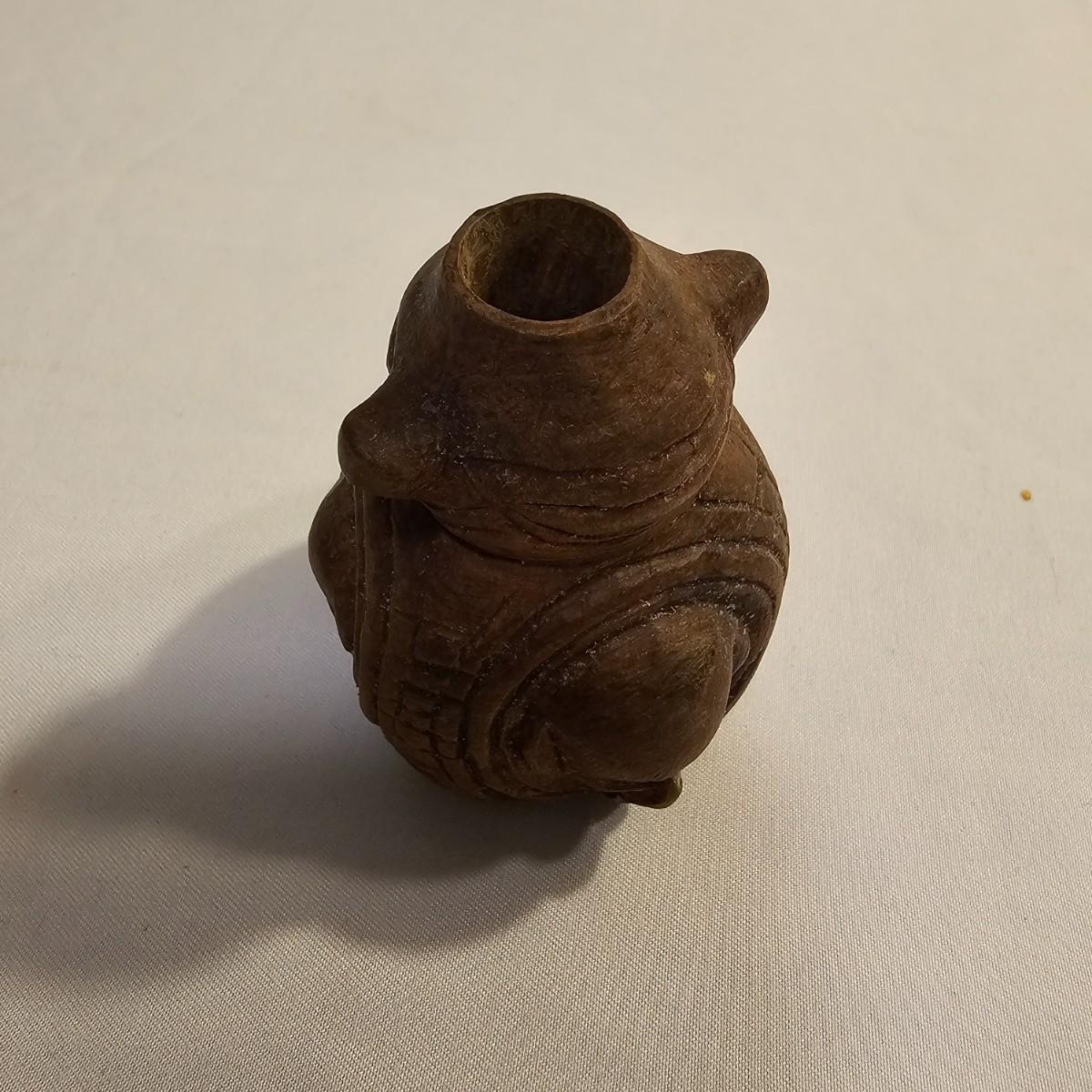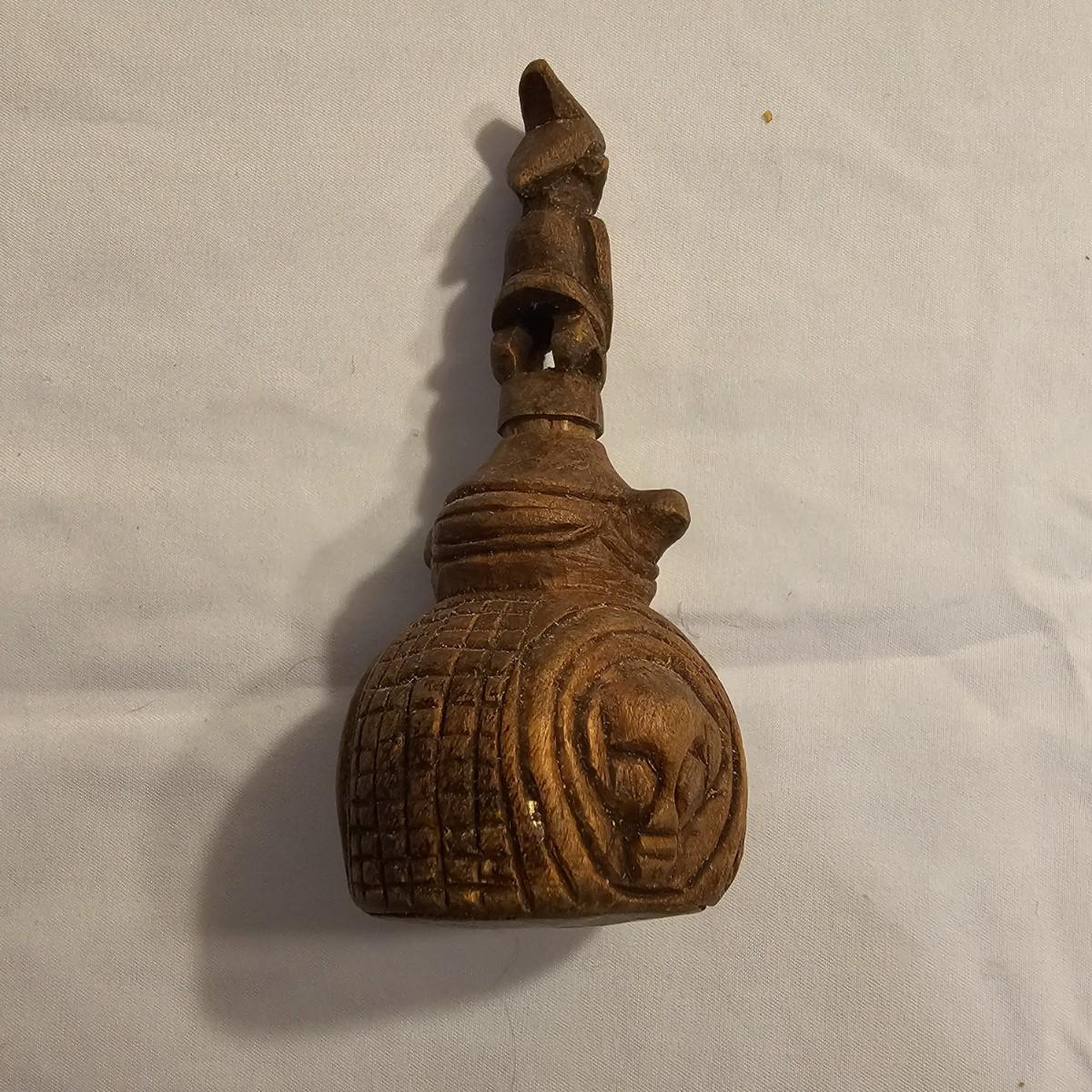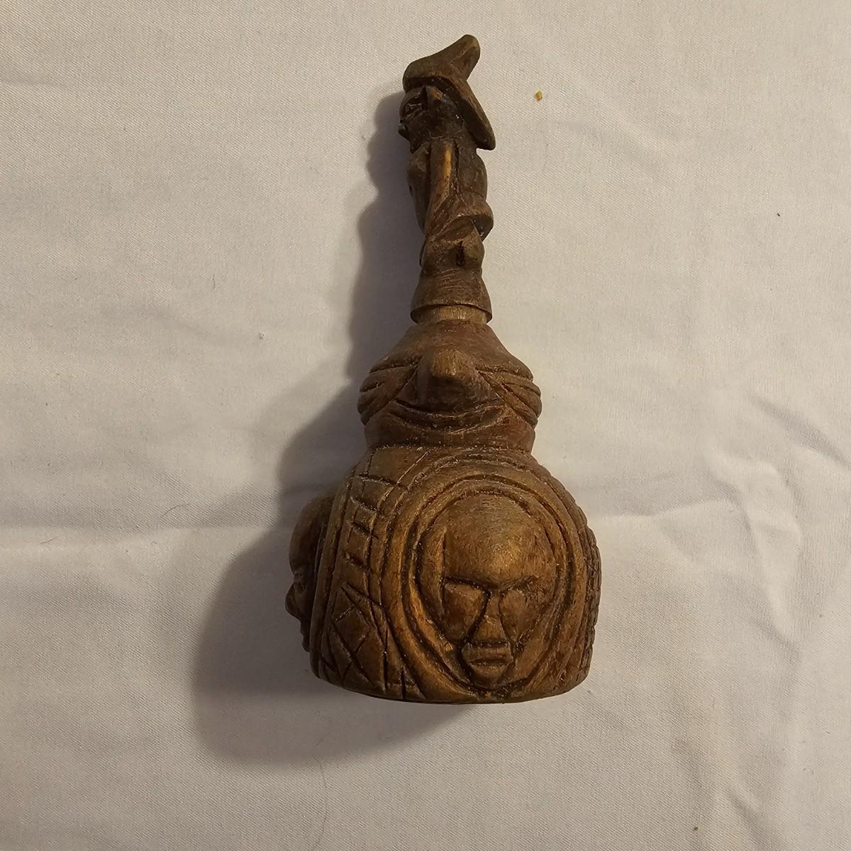 A hand carved wooden bottle with a full figure stopper and three faces in the base. Figure on stopper is kneeling, has hands on top of legs and a hat. Rest of bottle has cross hatch designs carved into it. Item is 2"D x 4.5"H. Shipping available.