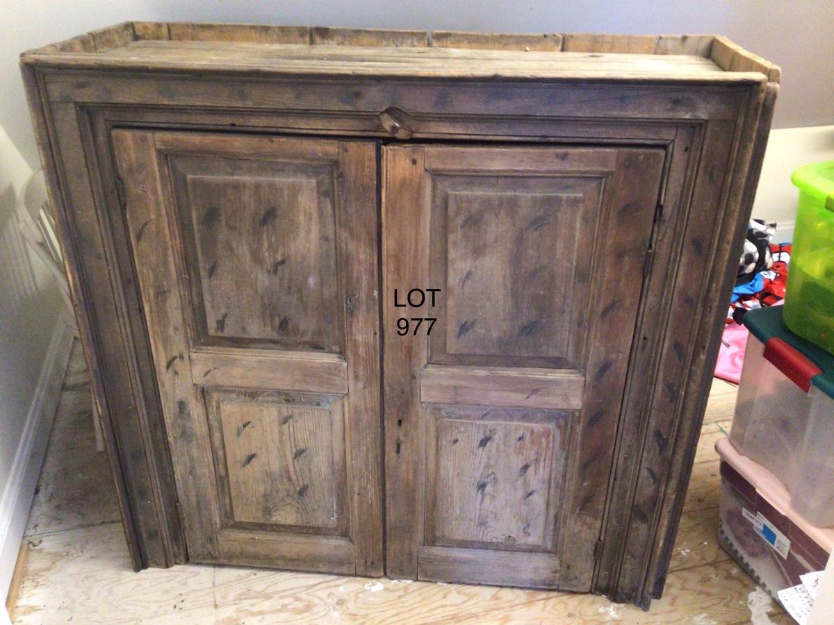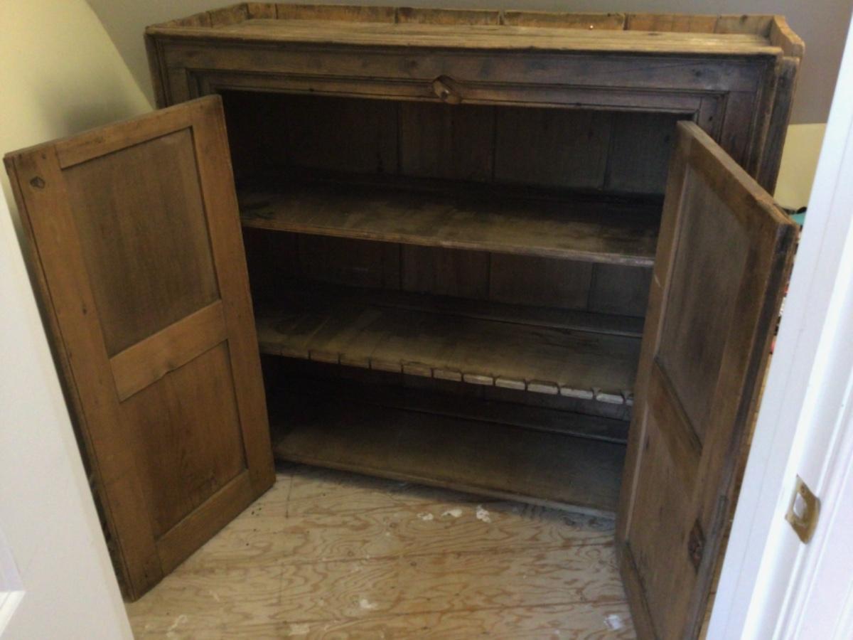 Cupboard has some original paint. Two shelves. Doors hinged left and right.