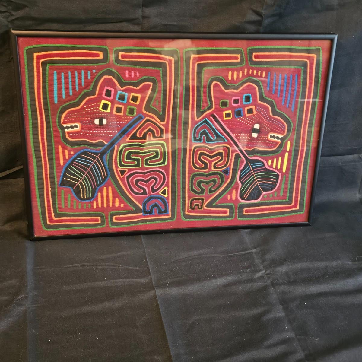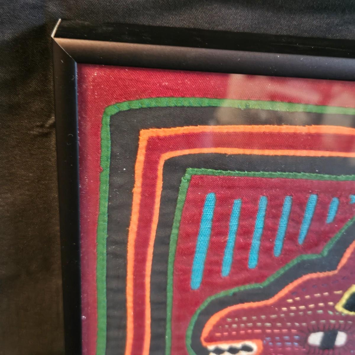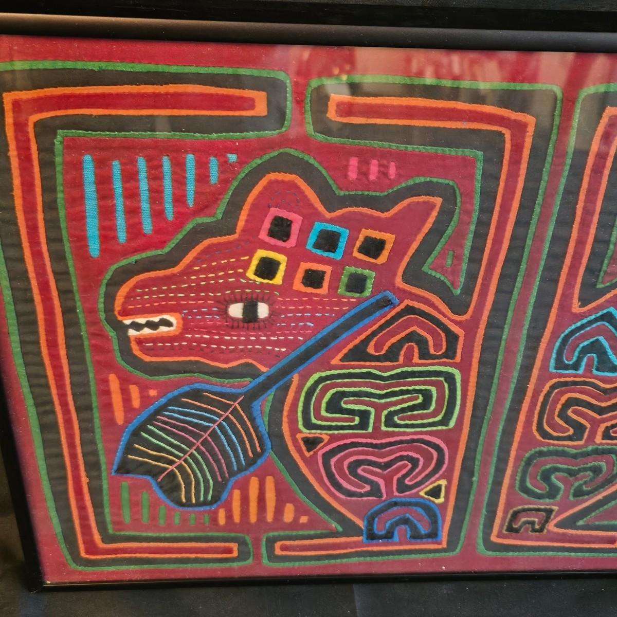 A framed piece of Panamanian Mola-style fabric art and a gorgeous colorful rug. The rug measures approximately 36" x 81" (3' x 6.75'). The fabric art is framed in a black metal frame and measures approximately 17.5" x 12"H. Shipping available