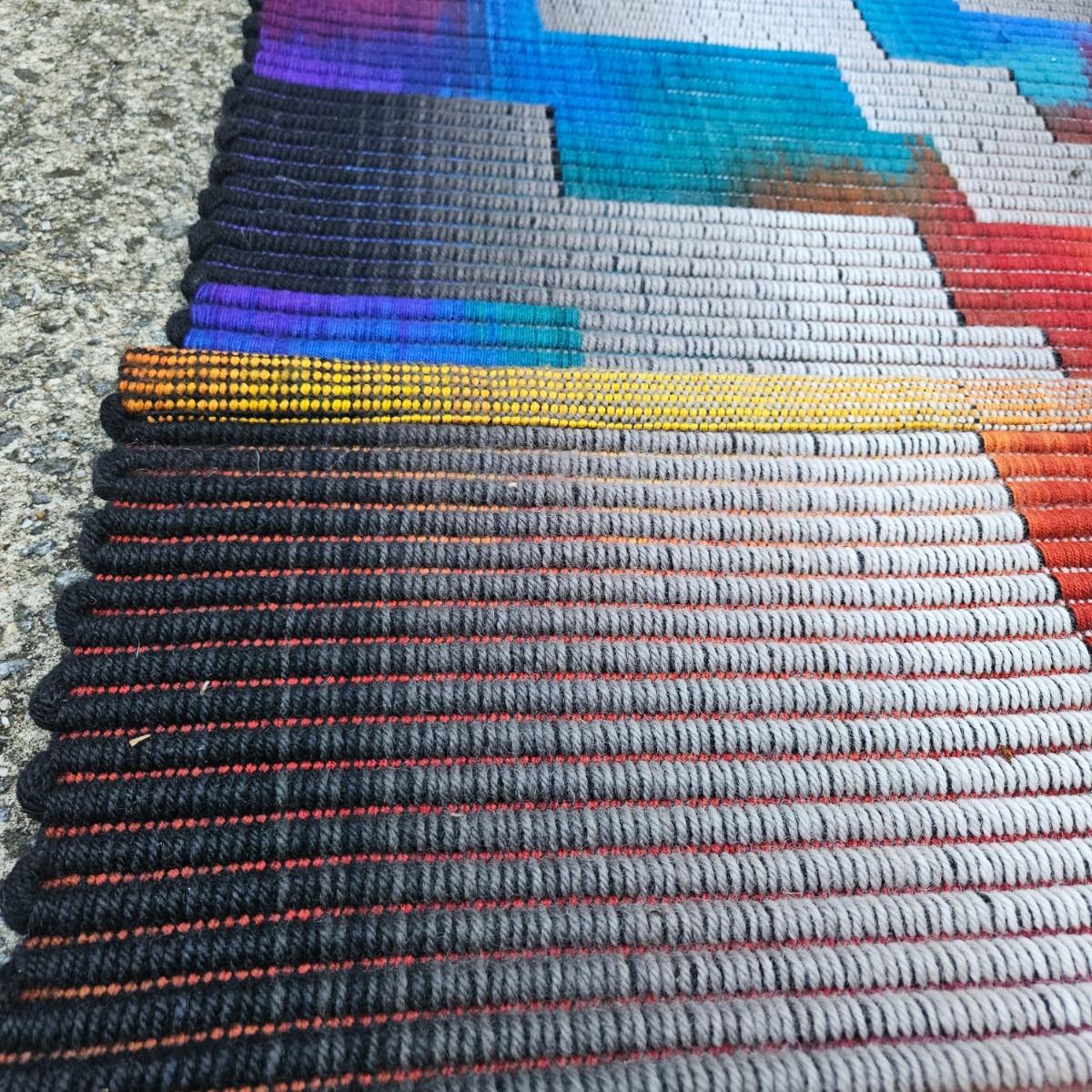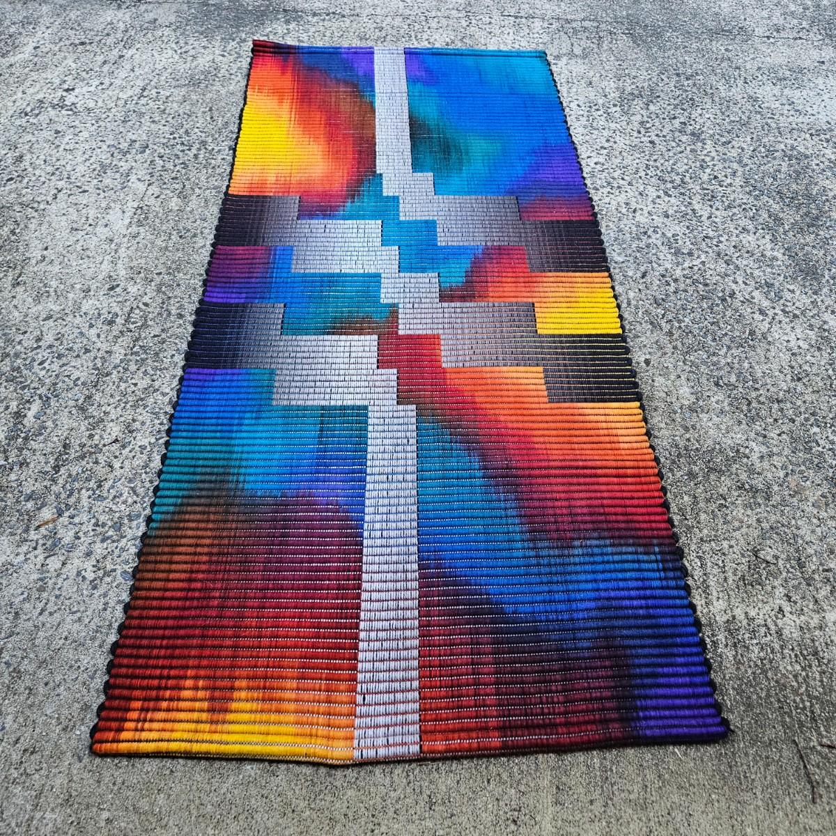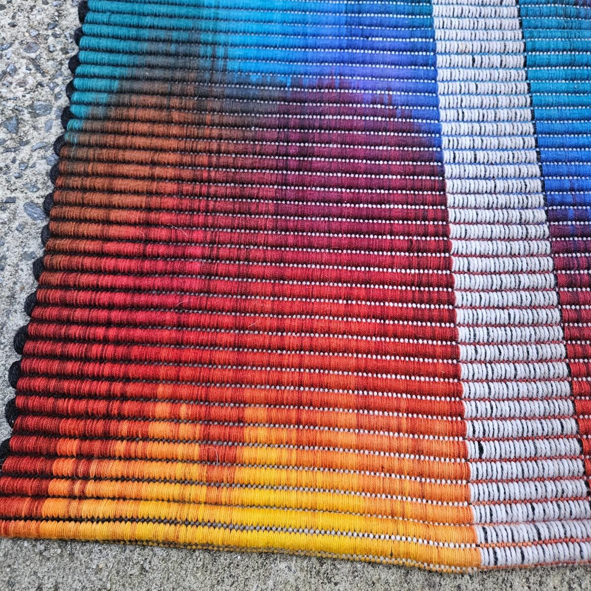 A framed piece of Panamanian Mola-style fabric art and a gorgeous colorful rug. The rug measures approximately 36" x 81" (3' x 6.75'). The fabric art is framed in a black metal frame and measures approximately 17.5" x 12"H. Shipping available