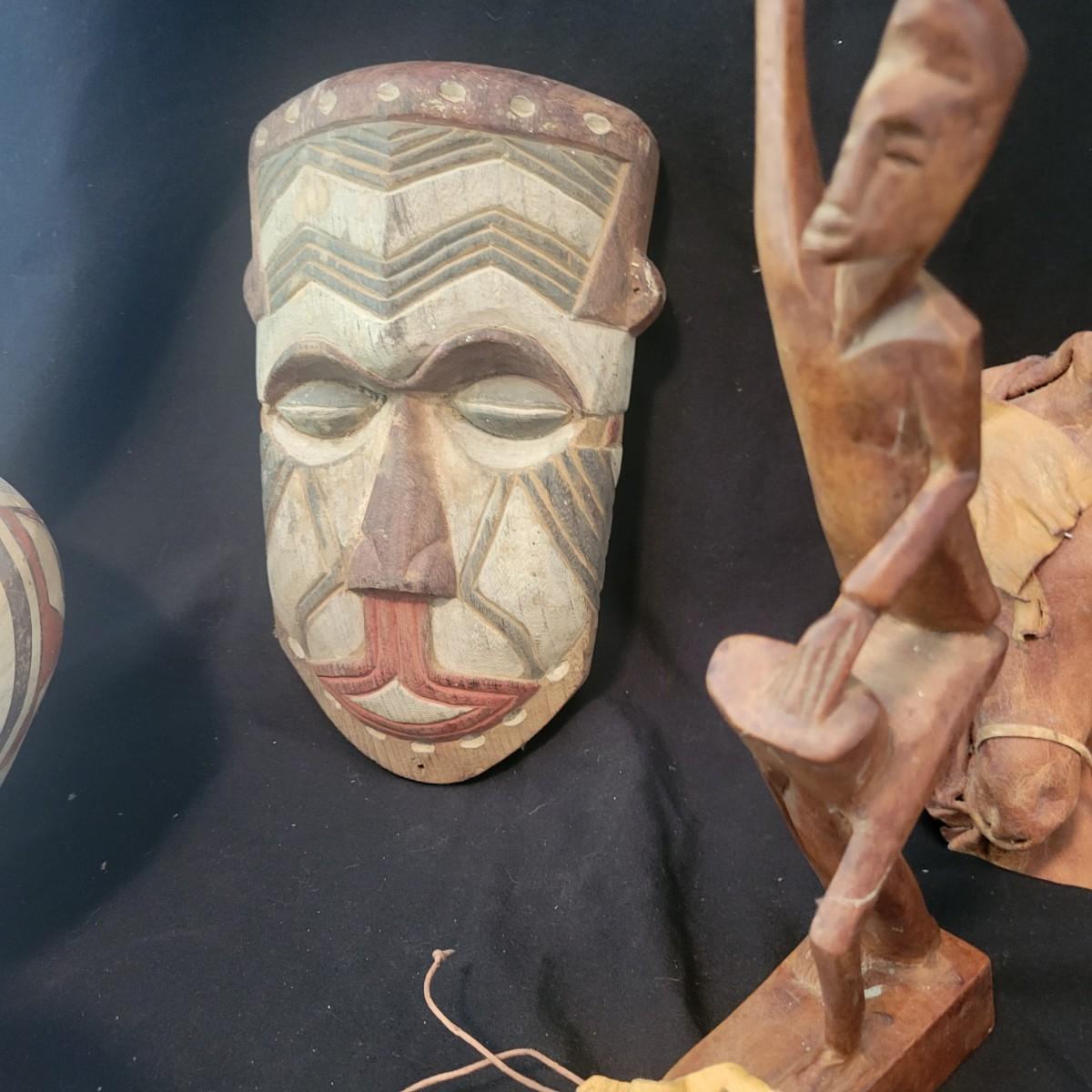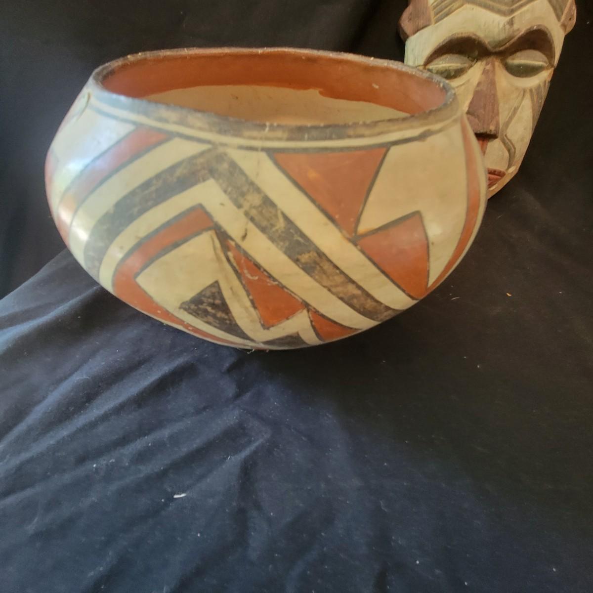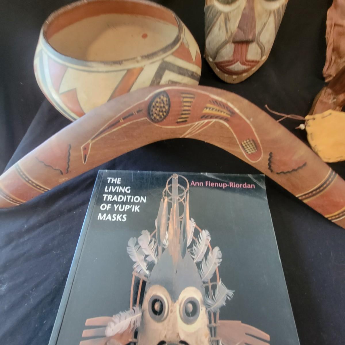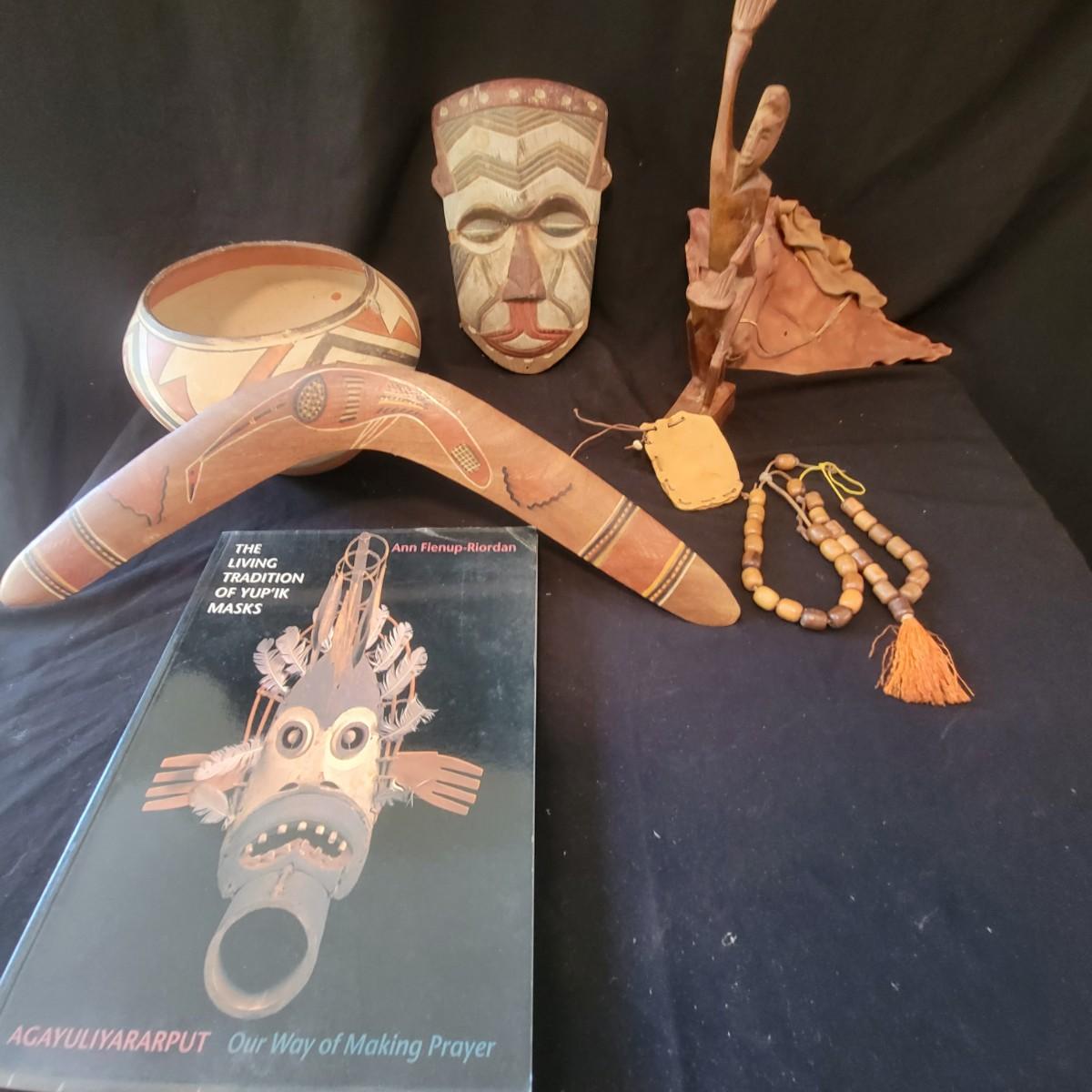 A mix of primitive folk art from different cultures. A hand painted boomerang, strands of beads of unknown origin. A bowl of mixed terracotta and pottery, appears to be hand painted, but does have damage, see attached pictures. A hand carved and painted mask with no identifying markings, a carved figurine beating a drum with no identifying markings and a horse head made from leather crafted by the estate owner. Also included is a book on the Living Tradition of Yup'Ik Masks. Hand painted bowl measures approximately 9" x 6" Shipping available