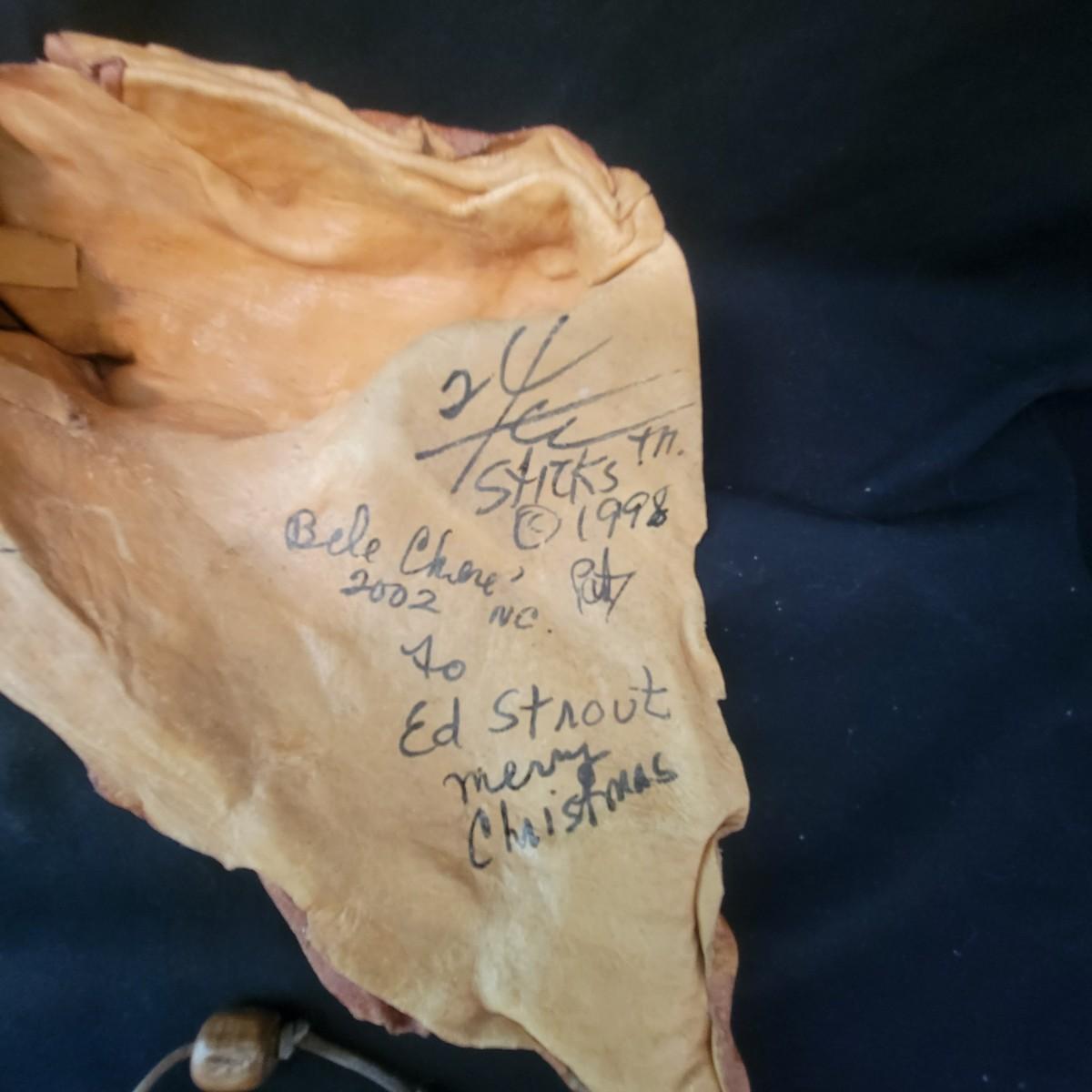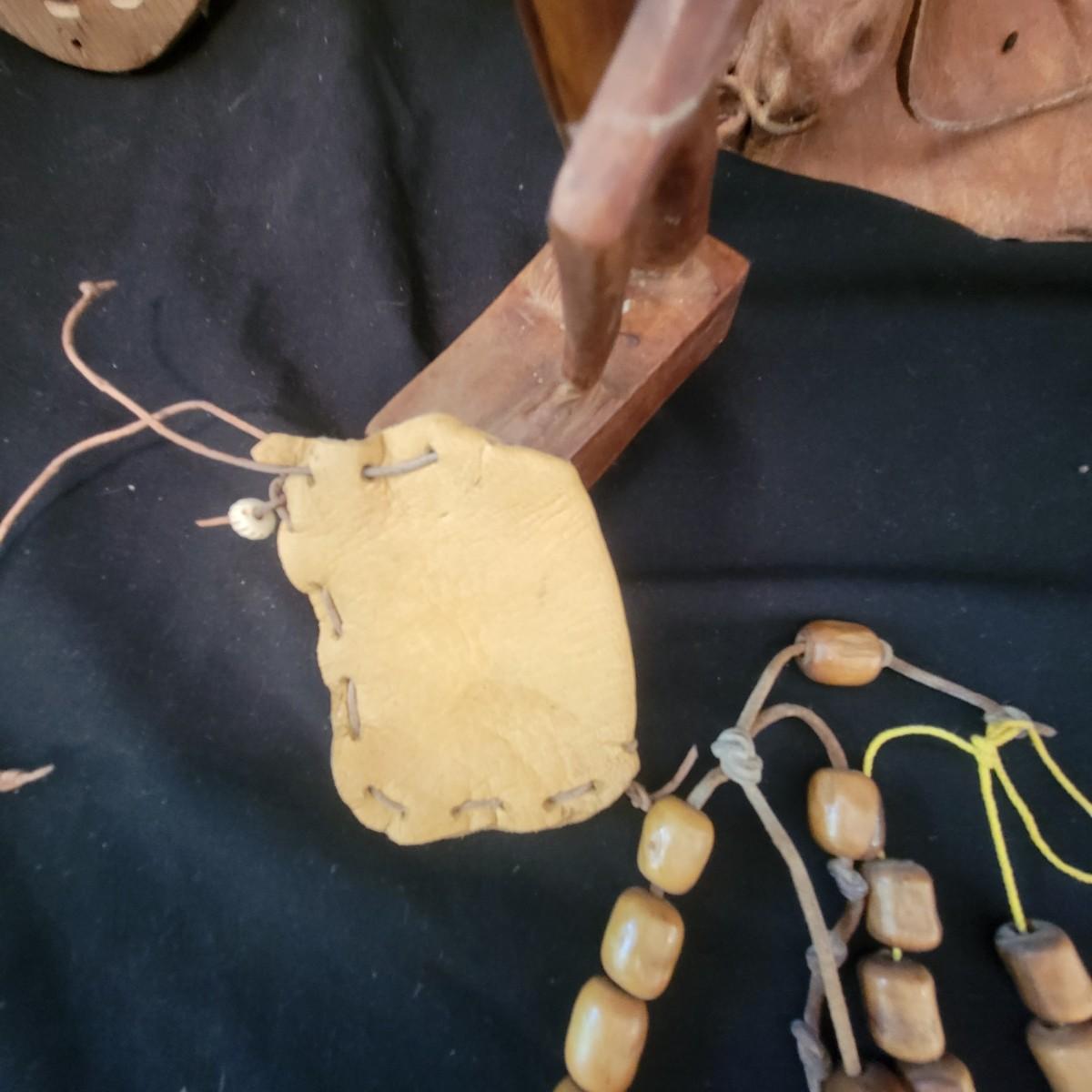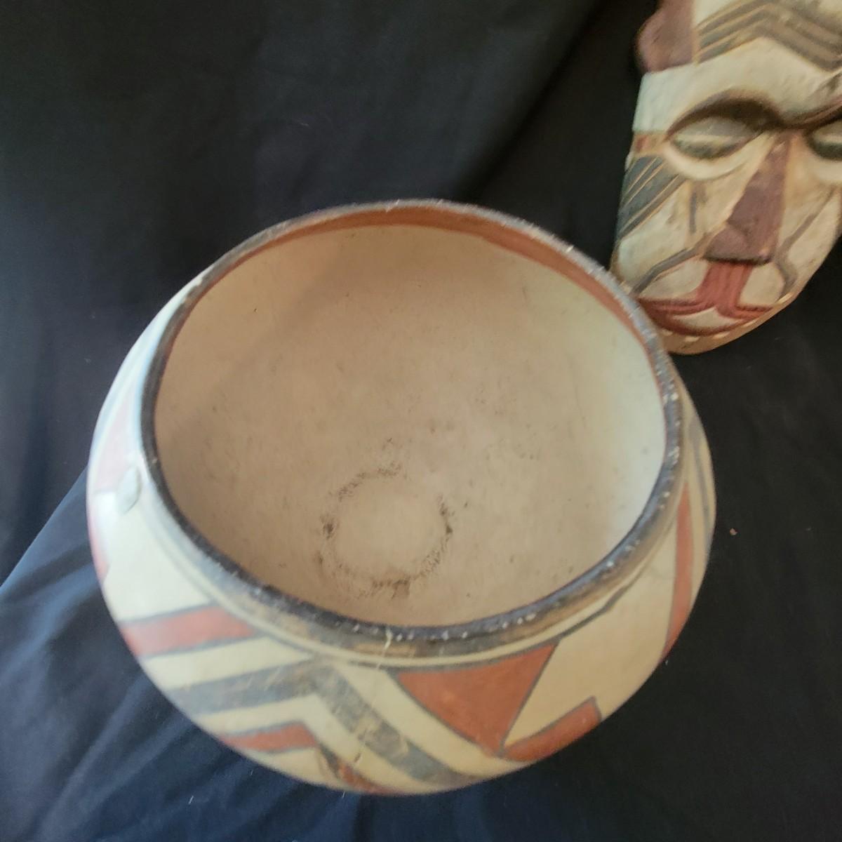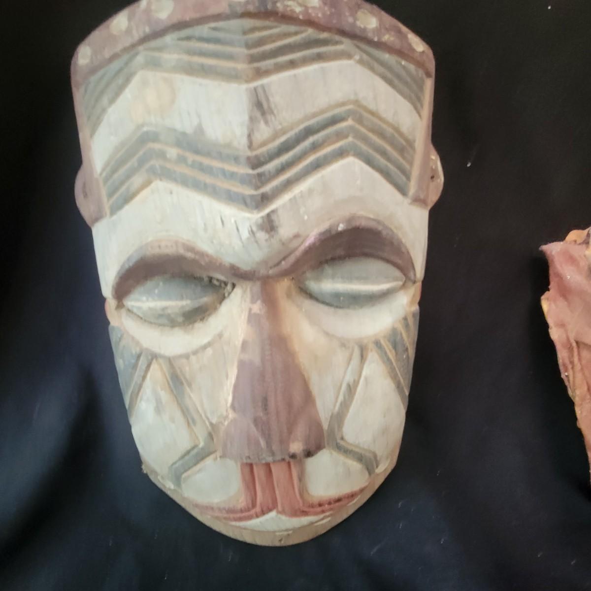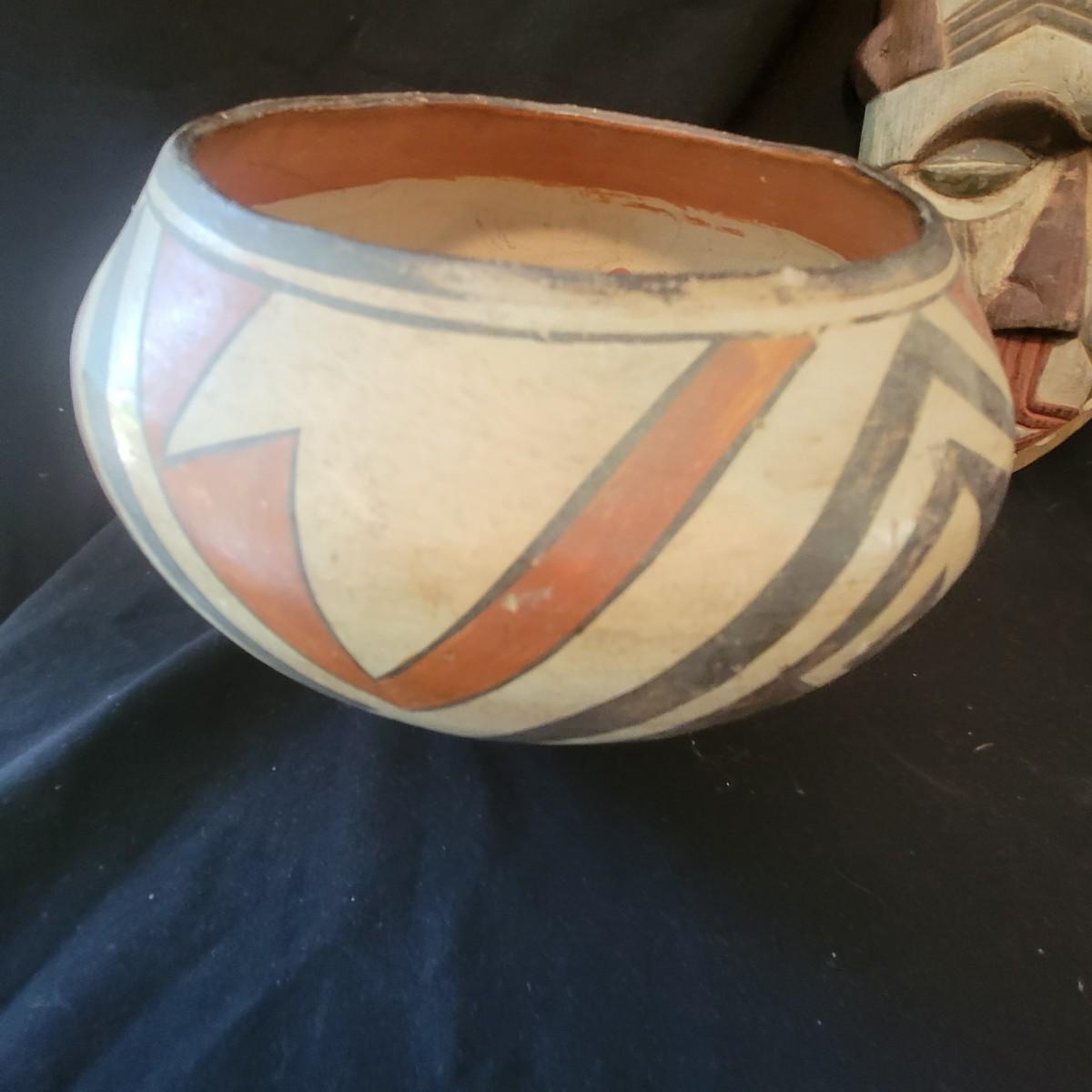 A mix of primitive folk art from different cultures. A hand painted boomerang, strands of beads of unknown origin. A bowl of mixed terracotta and pottery, appears to be hand painted, but does have damage, see attached pictures. A hand carved and painted mask with no identifying markings, a carved figurine beating a drum with no identifying markings and a horse head made from leather crafted by the estate owner. Also included is a book on the Living Tradition of Yup'Ik Masks. Hand painted bowl measures approximately 9" x 6" Shipping available
