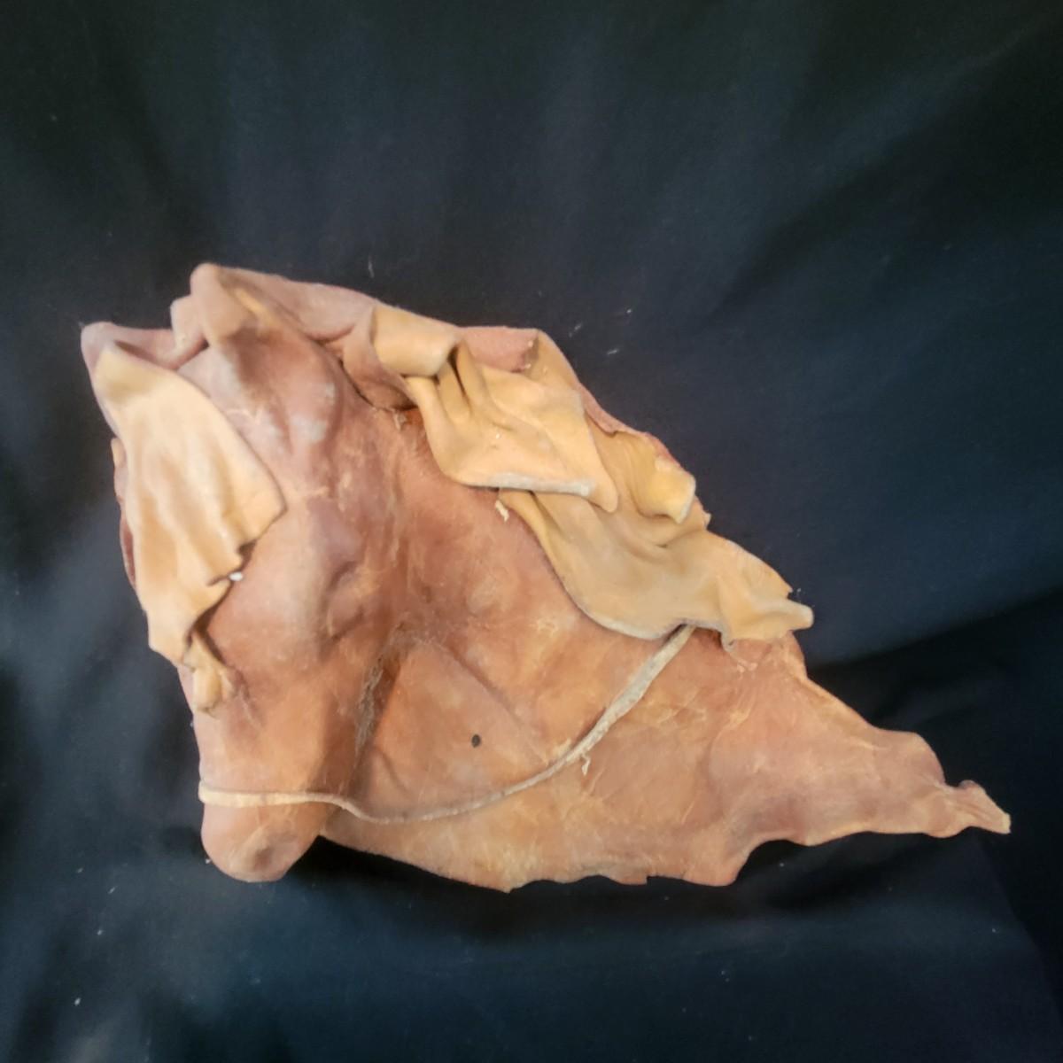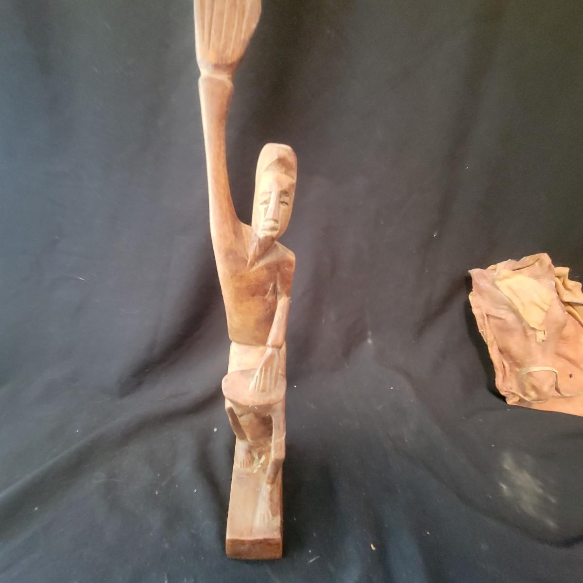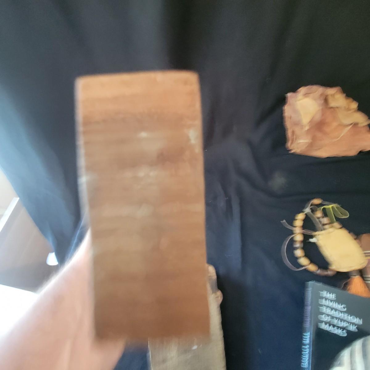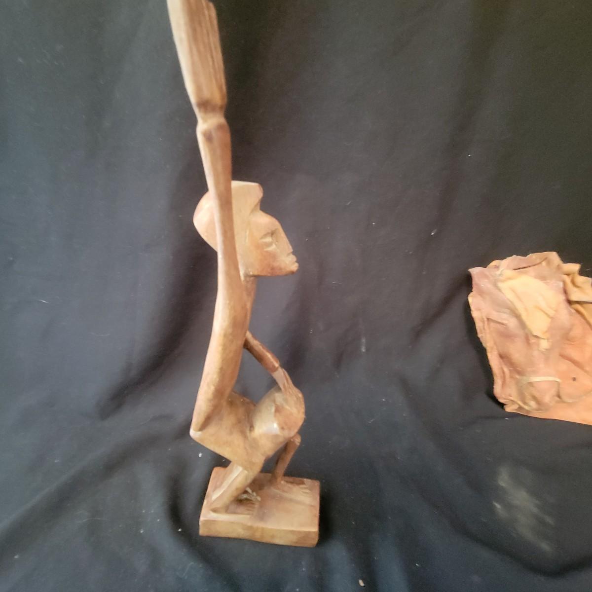 A mix of primitive folk art from different cultures. A hand painted boomerang, strands of beads of unknown origin. A bowl of mixed terracotta and pottery, appears to be hand painted, but does have damage, see attached pictures. A hand carved and painted mask with no identifying markings, a carved figurine beating a drum with no identifying markings and a horse head made from leather crafted by the estate owner. Also included is a book on the Living Tradition of Yup'Ik Masks. Hand painted bowl measures approximately 9" x 6" Shipping available
