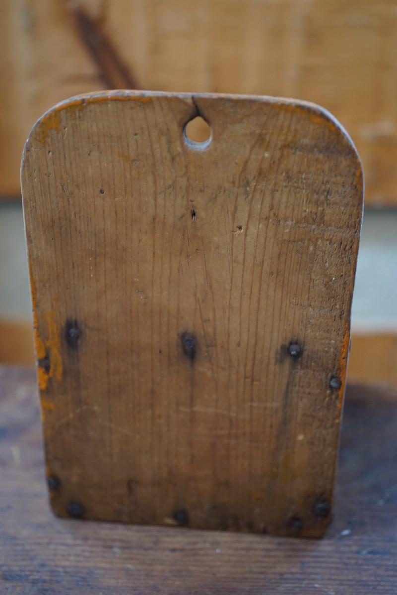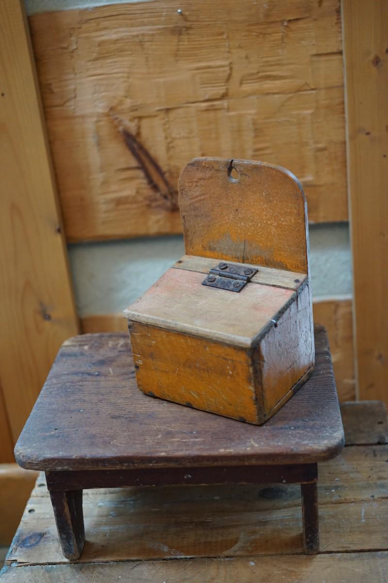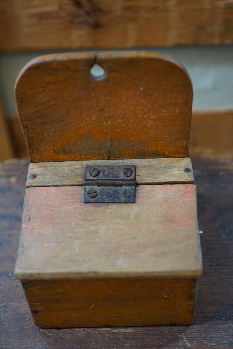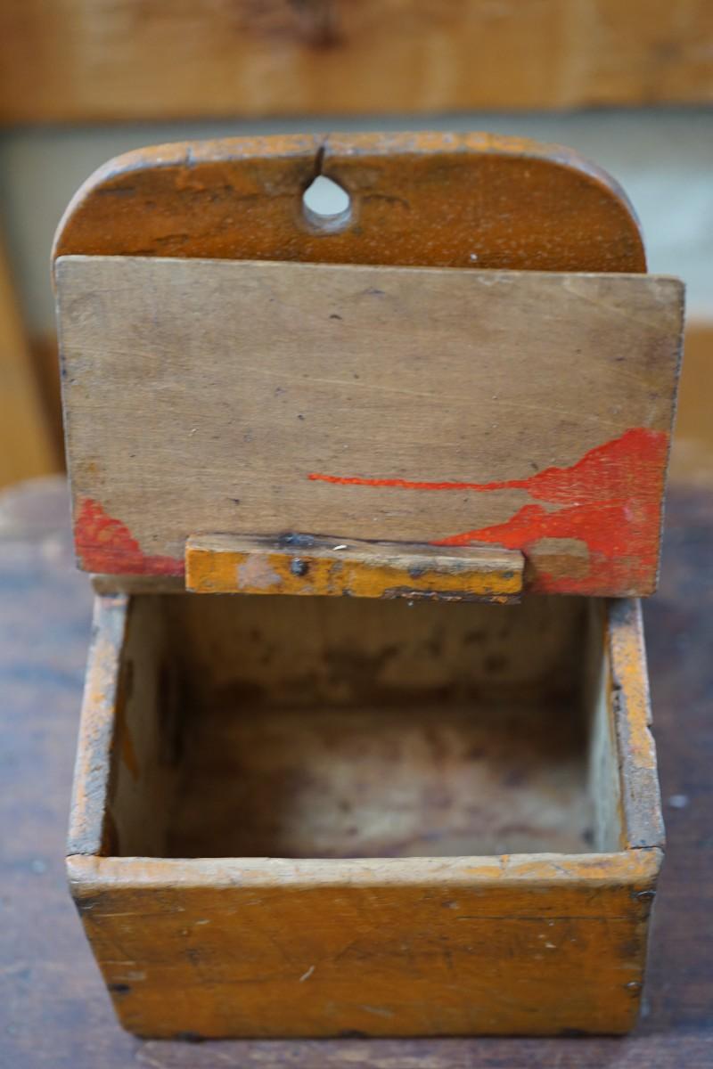 the salt box has a good older color. The metal hinge maybe is old but not original. ususally they would have used a leather strapping. The height on the back is 9" Length: 4" the width: 5 1/2"