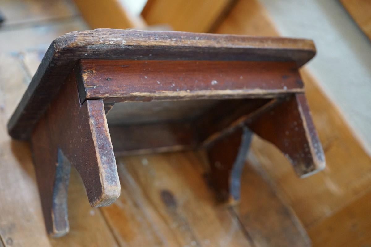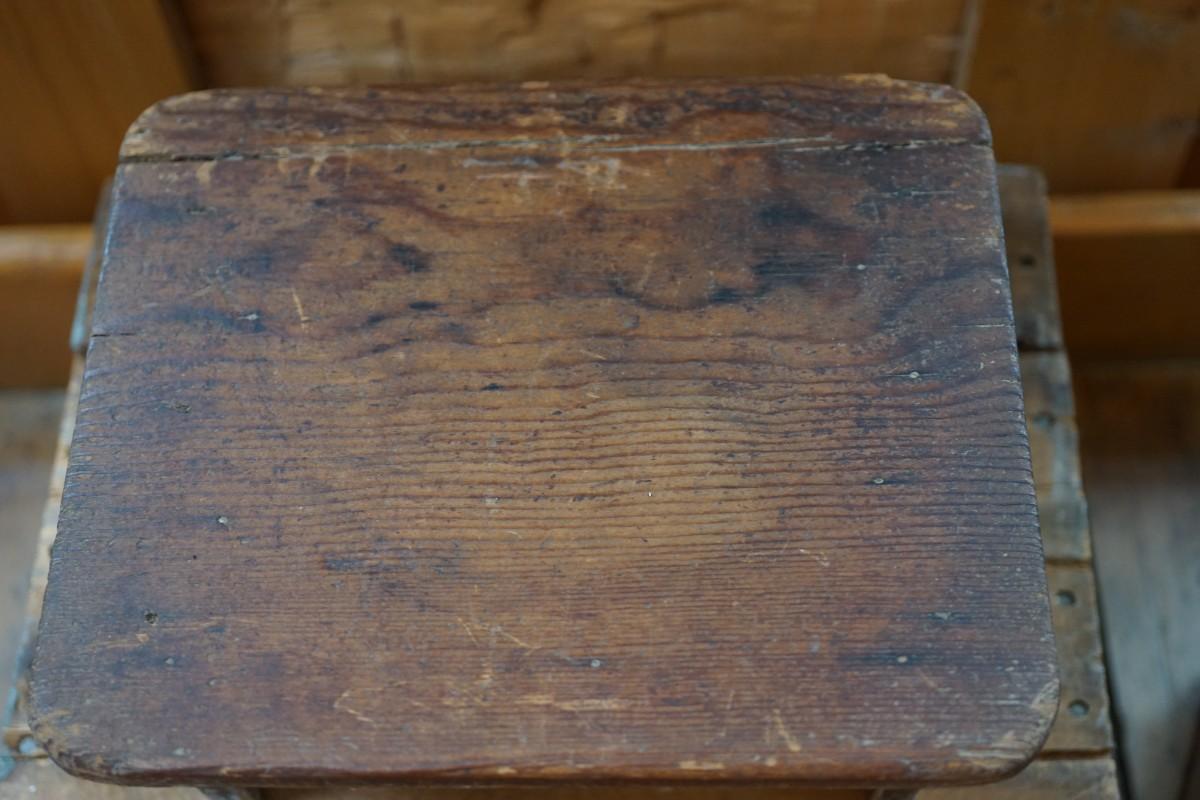 the stool has wear and stains but sturdy. crack on the one side but older and intact.