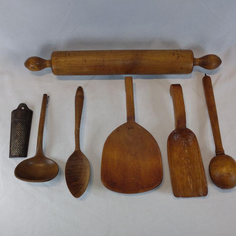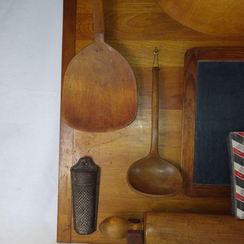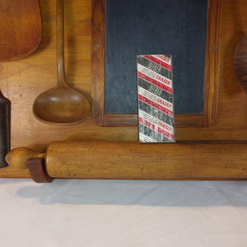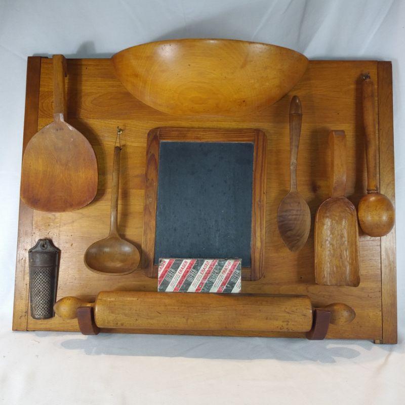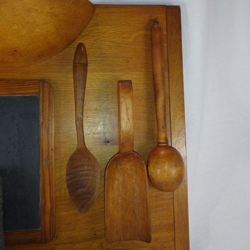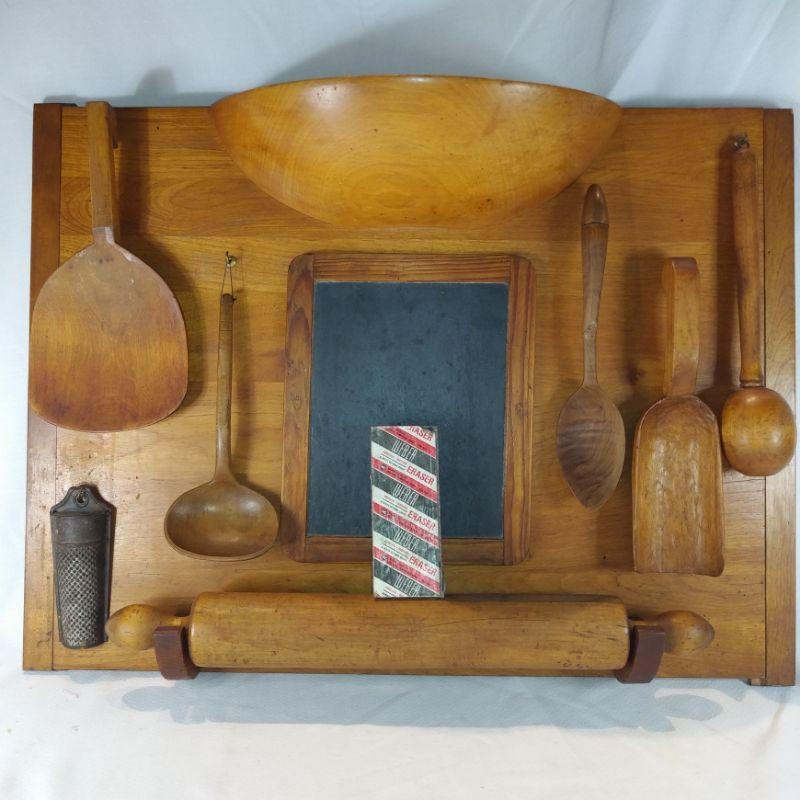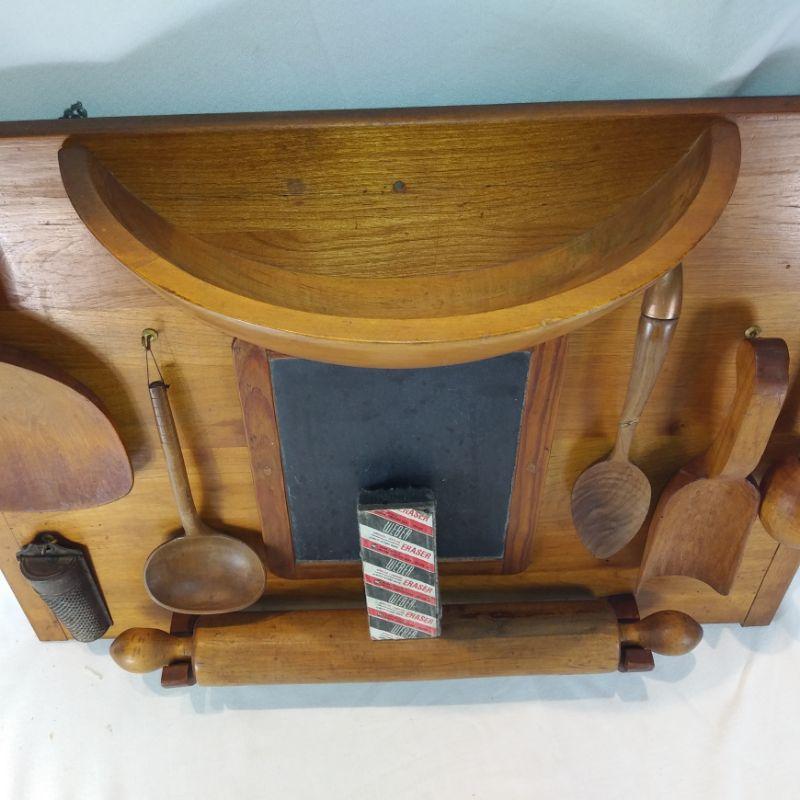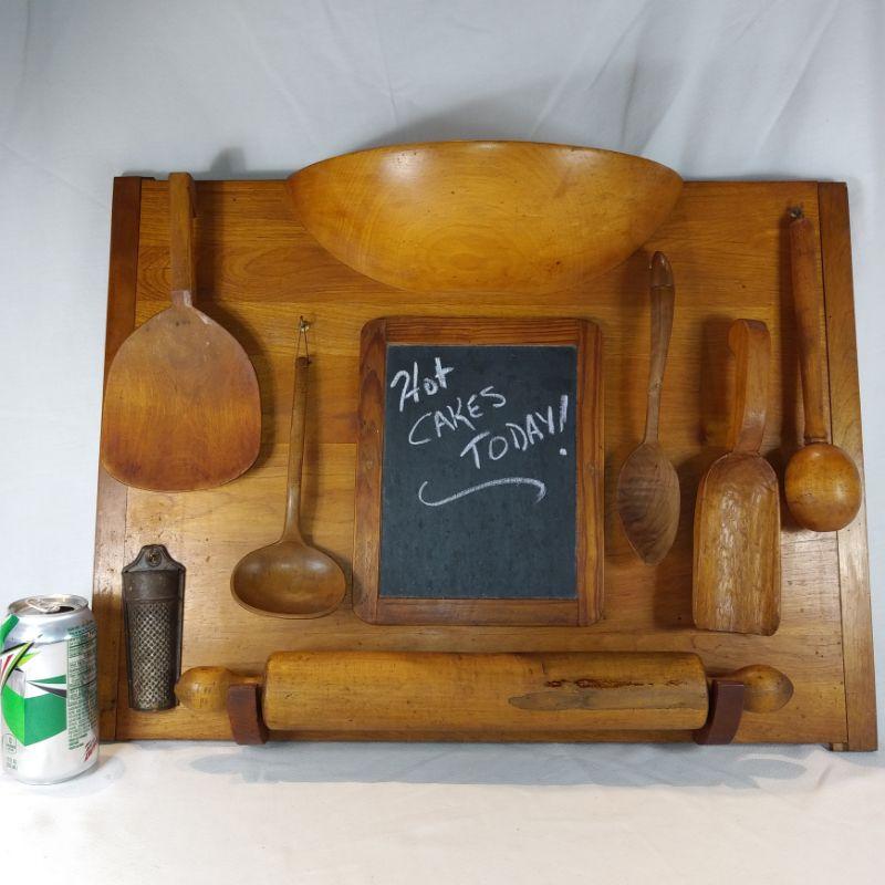 This offering is a really unusual primitive kitchen display made of an old cutting board with antique wooden utensils plus an old metal grater, menu chalk board and eraser. One wooden spoon has been professionally repaired. Overall size is 24-inches wide X 18-inches tall. Would look great in a country kitchen or a focal point in a mod setting.